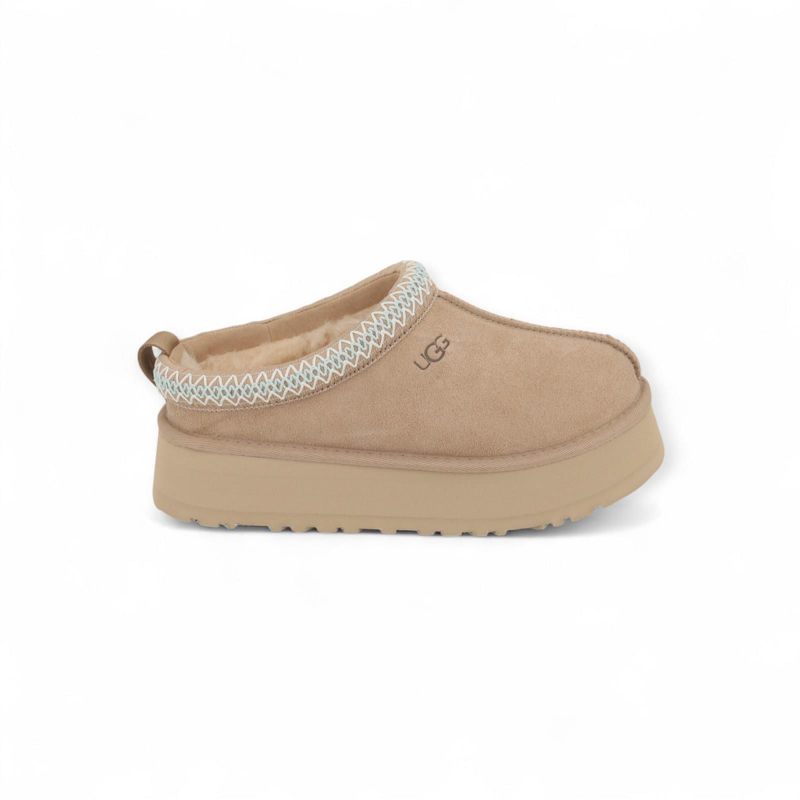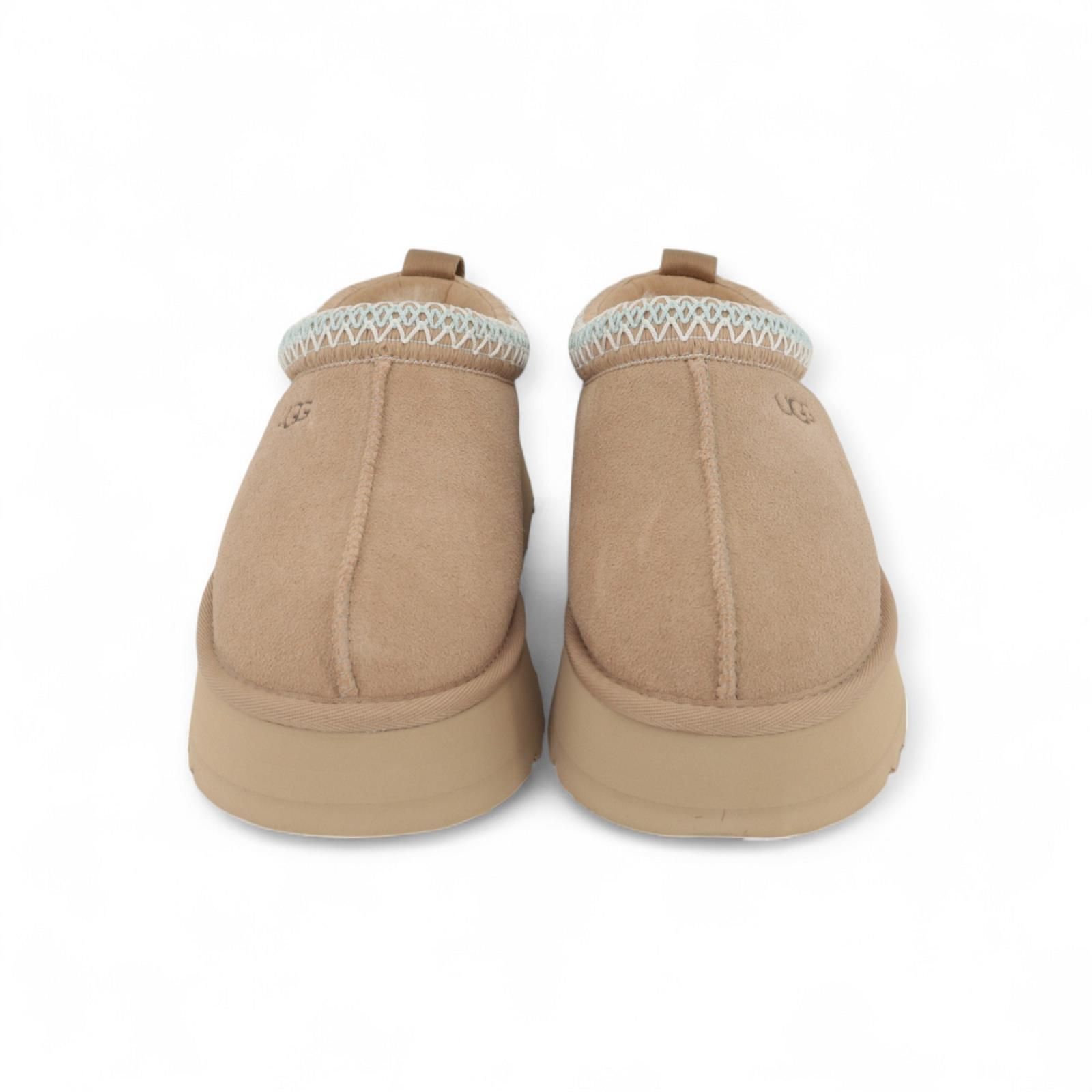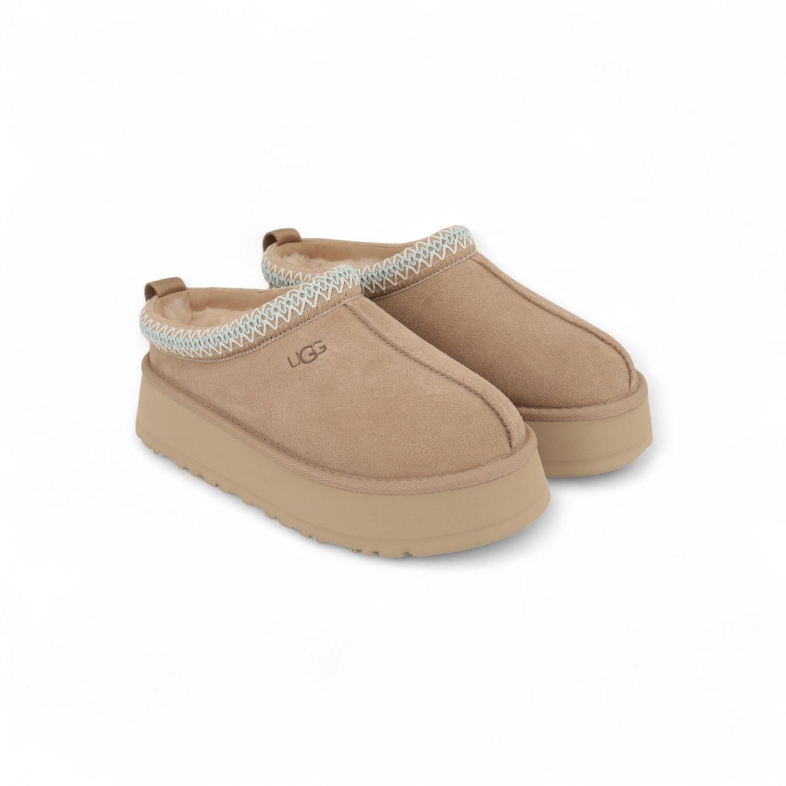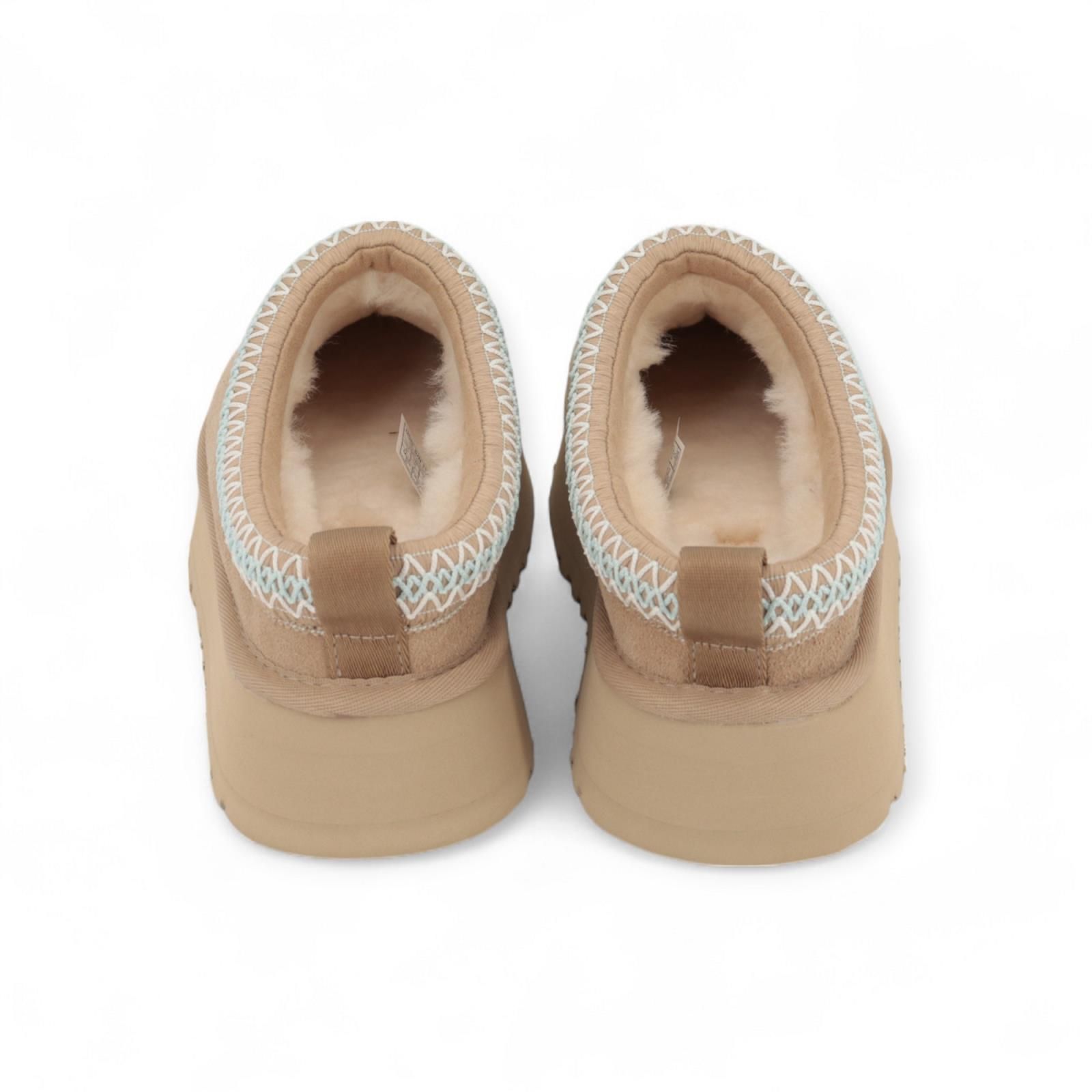 Ugg Tazz pantoffel voor dames. Deze in zand suède instapper is met wol binnenin en afgewerkt met het typische UGG stiksel en naad als accent. Is op een plateauzool die gemaakt is van suikerriet.