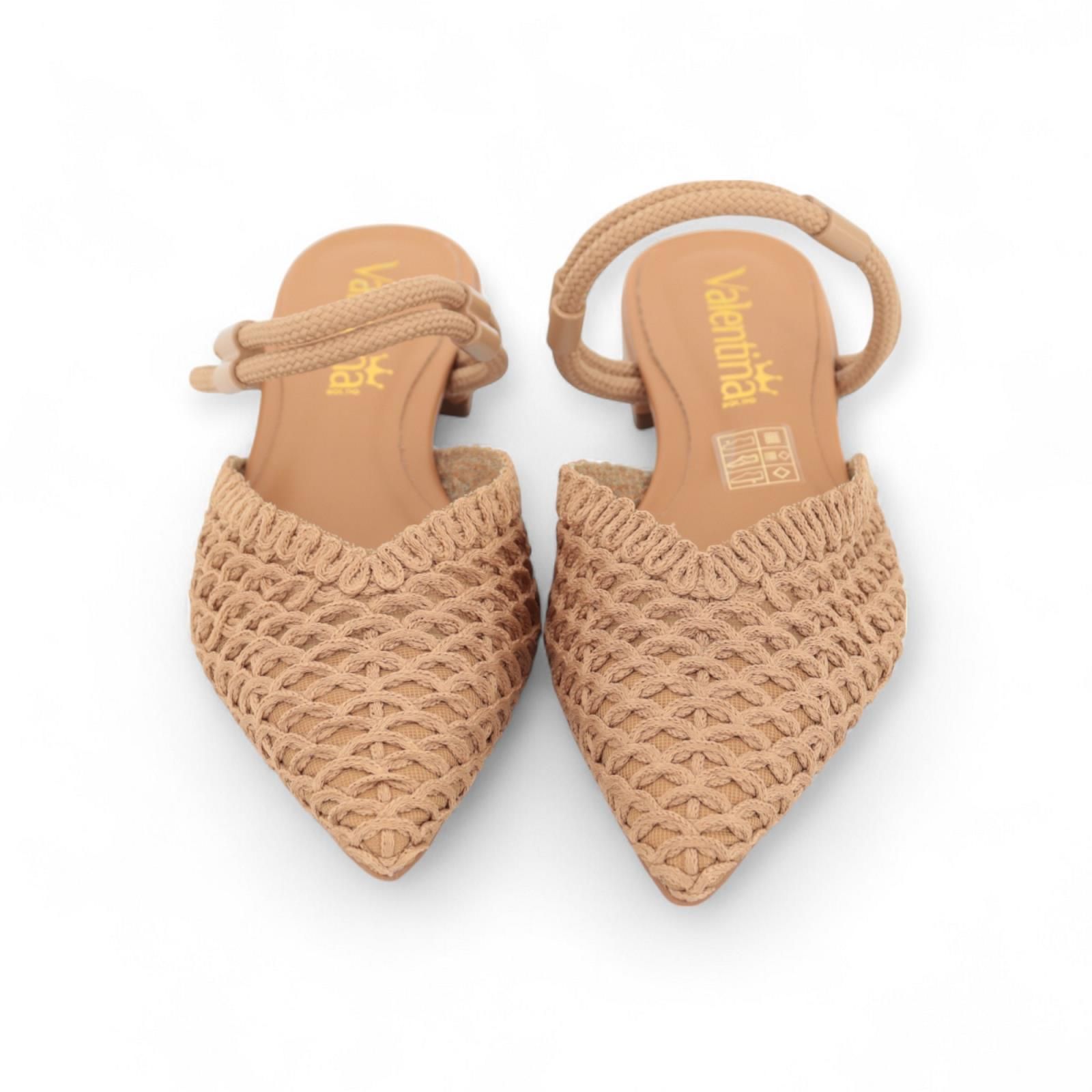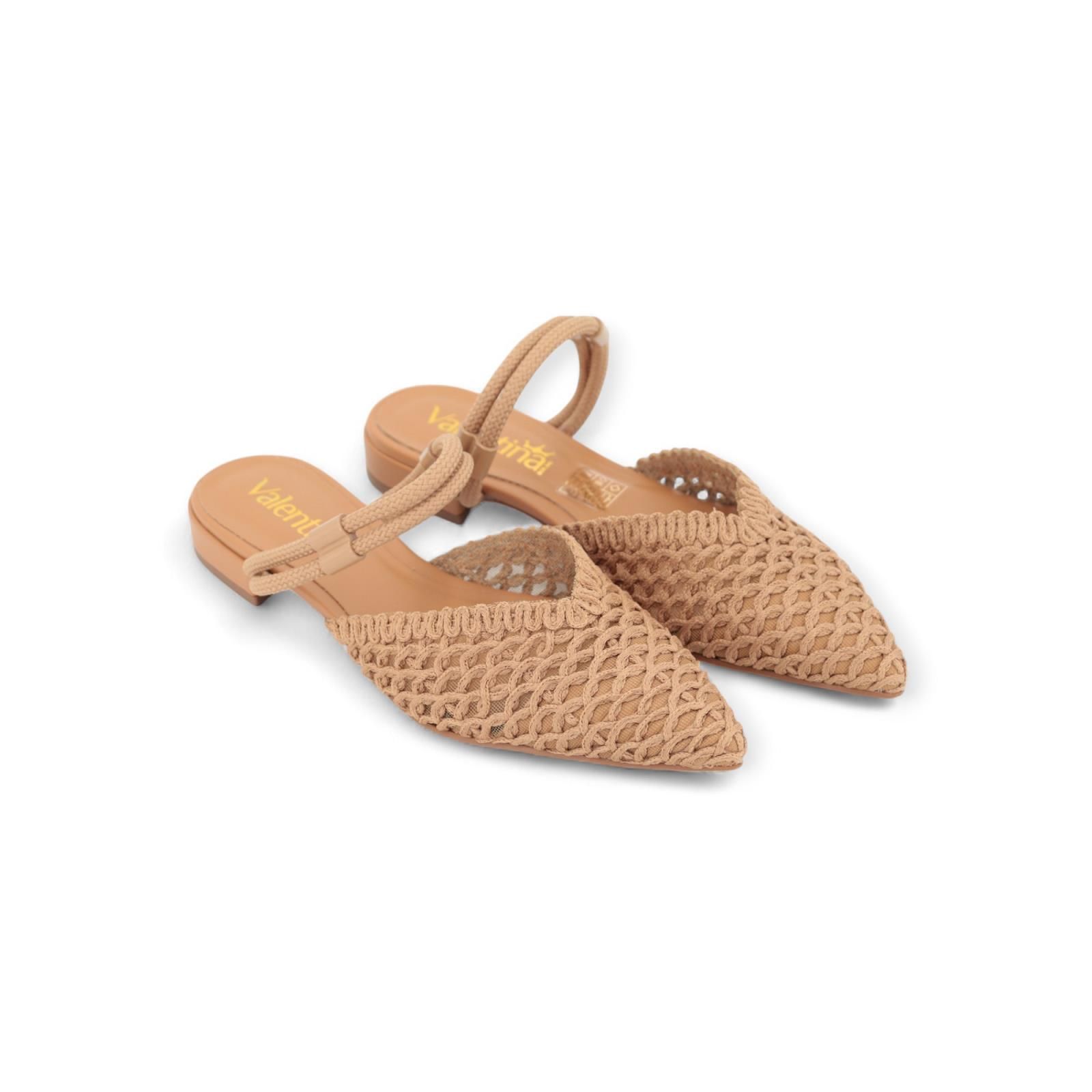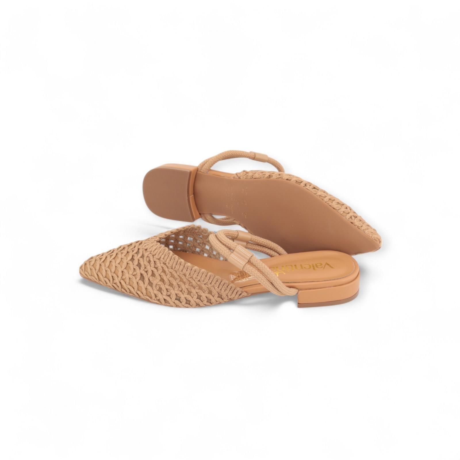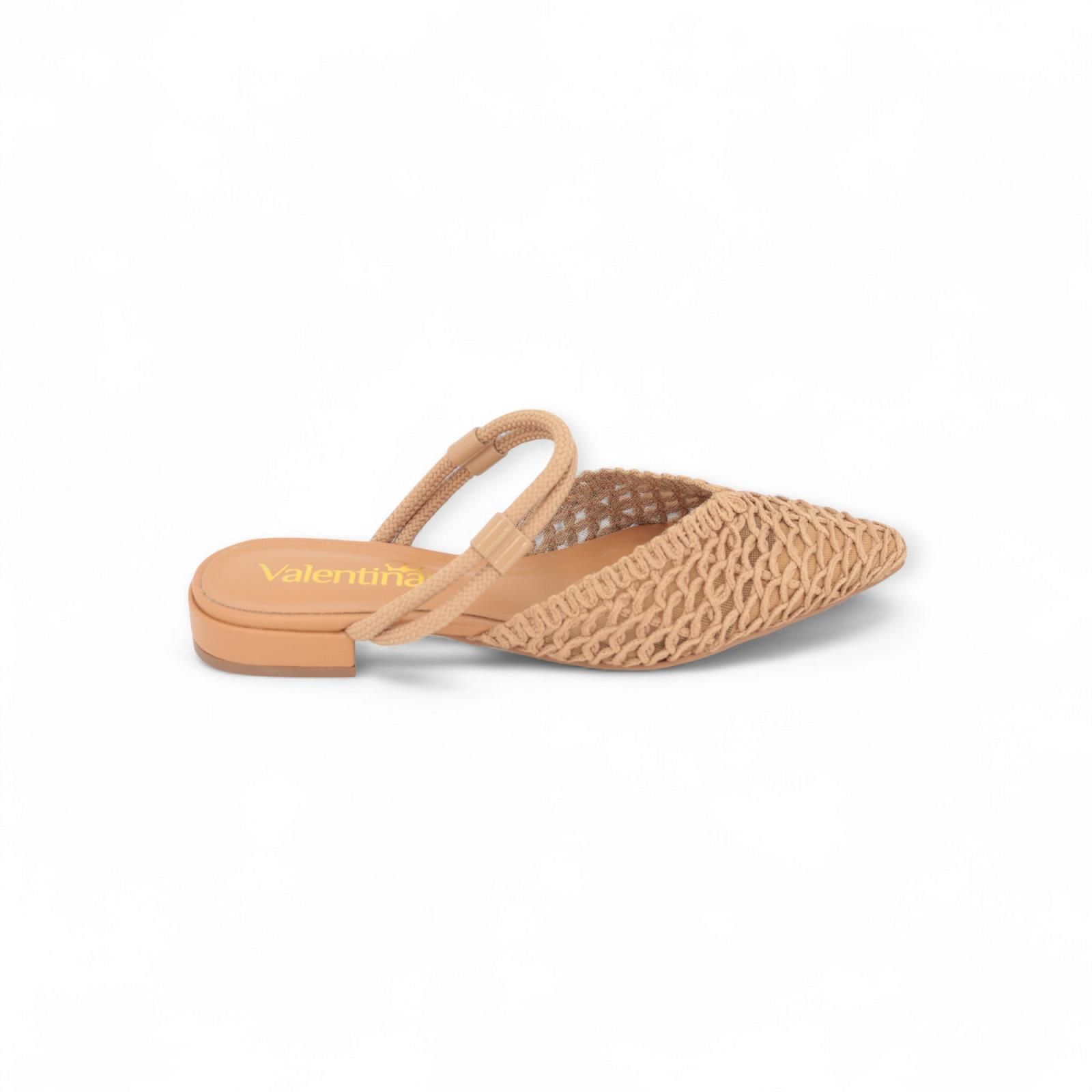 Slipper van Valentina in camel. Dit elegant muiltje is met open hiel en scherpe top. Is gemaakt in tressée textiel/ stof met gaas ertussen. Heeft nog 2 extra stoffen bandjes over de enkel. Is op een klein hakje en heeft een lederen binnenzool en antislip buitenzool.