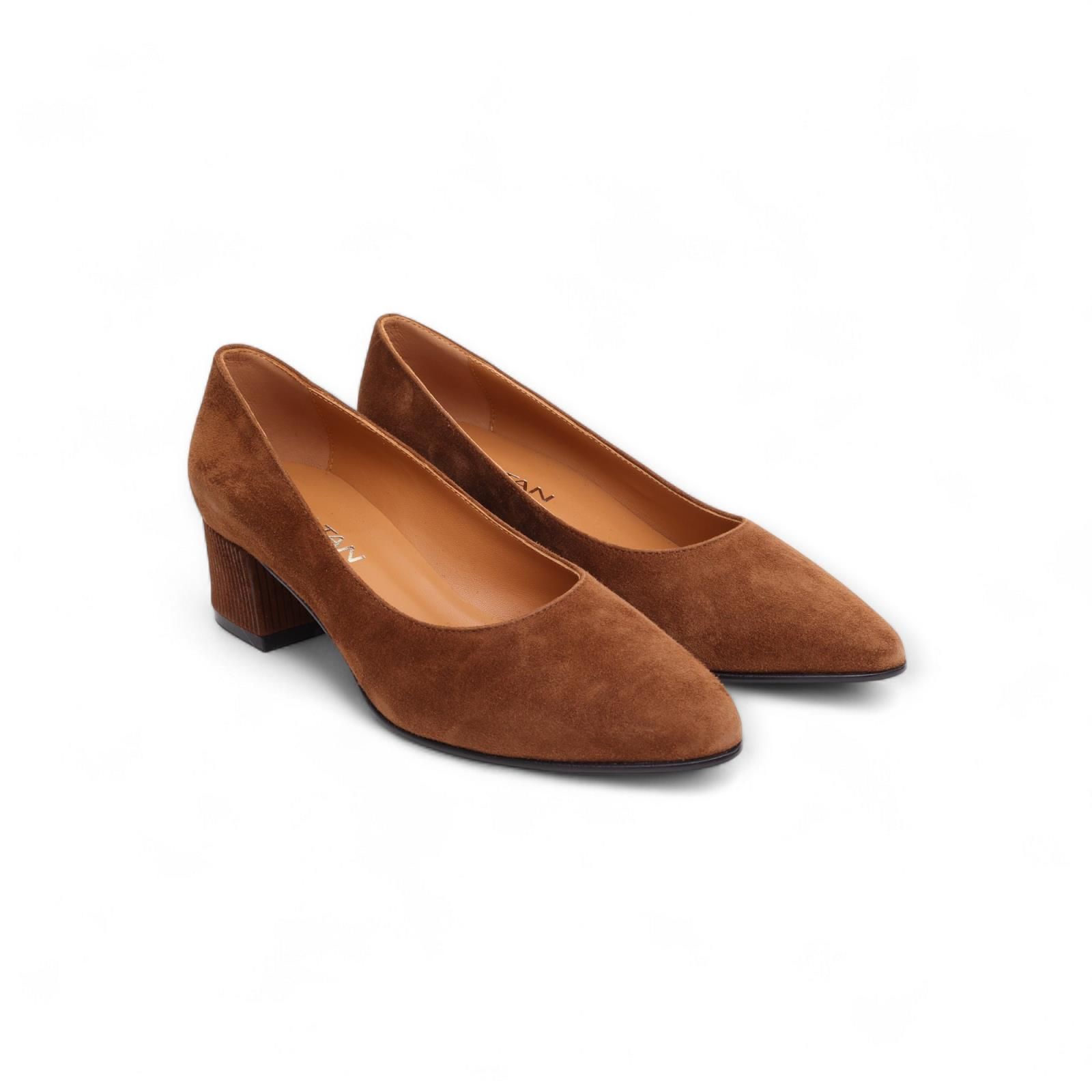 Pump van Voltan voor dames. Deze pump is in cognac/zwart suède met een licht scherpe top. Heeft een blokhakje van 3-3.5cm hoog. Is op een buitenzool in leer.