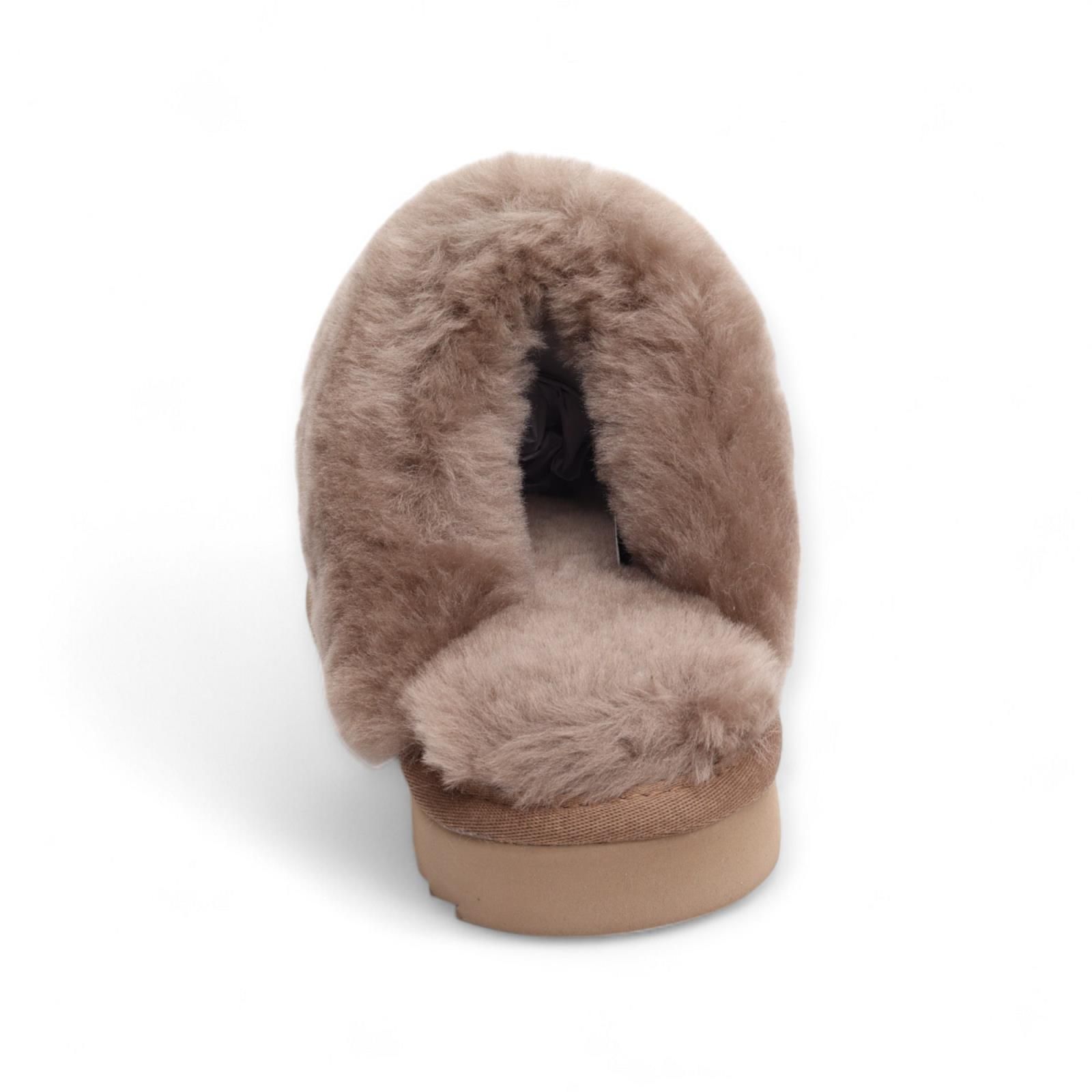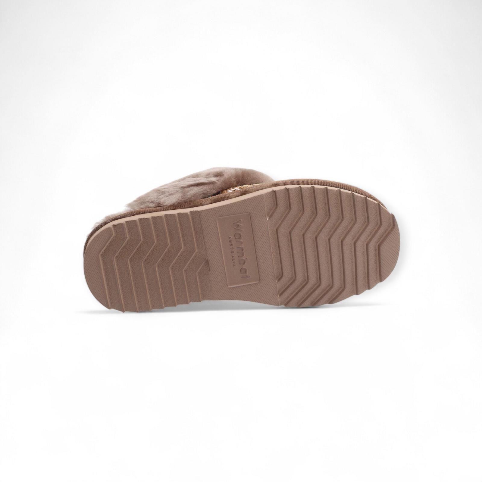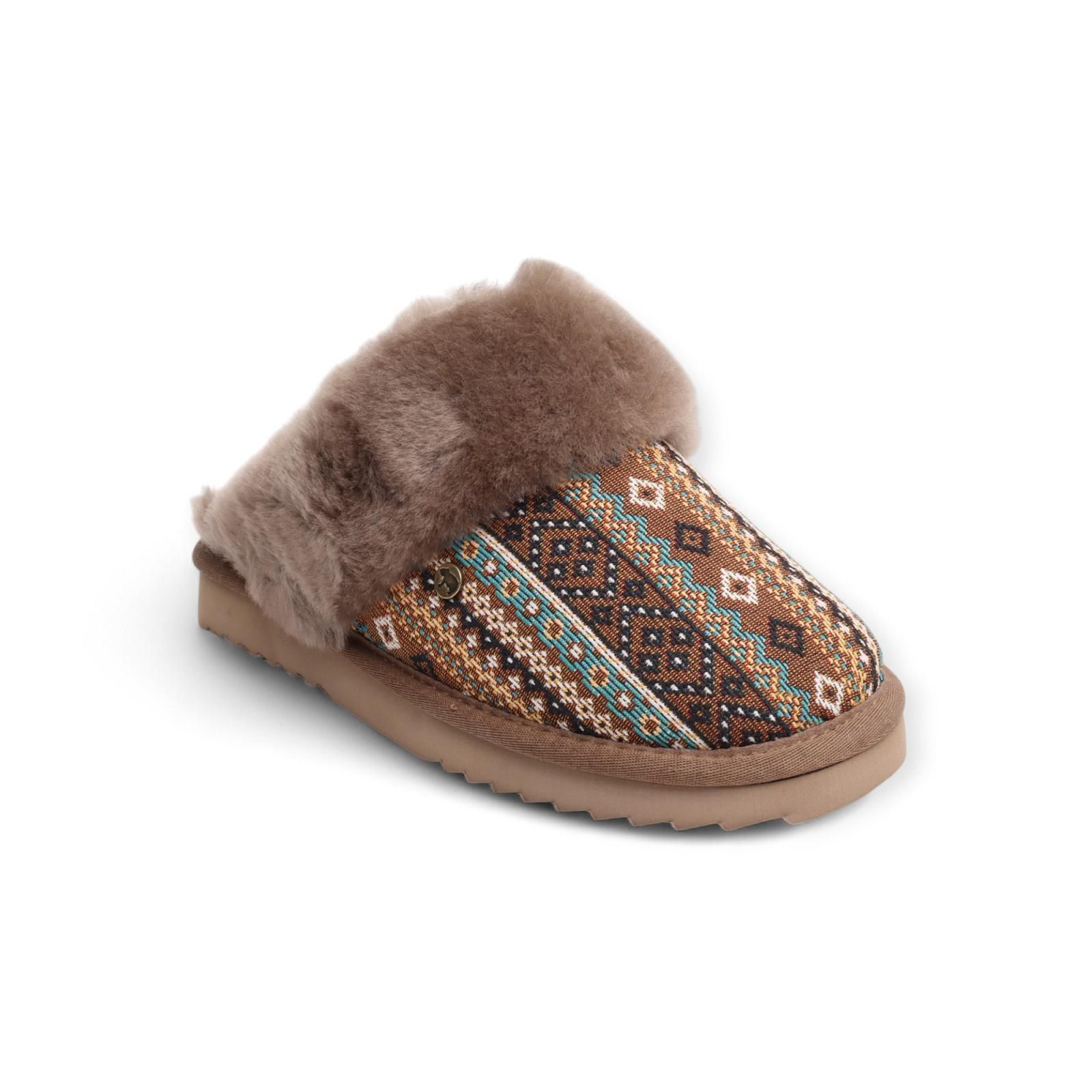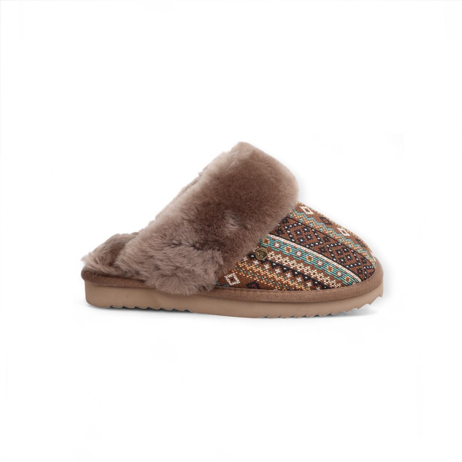 Pantoffel Collie van Warmbat voor dames. Deze pantoffel is gemaakt in geweven stof met mooie kleuren en unieke patronen. Is binnenin met echt schapenwol mee afgewerkt naar de buitenkant. Heeft een dikke rubberen zool die zeer licht aanvoelt en antislip is.