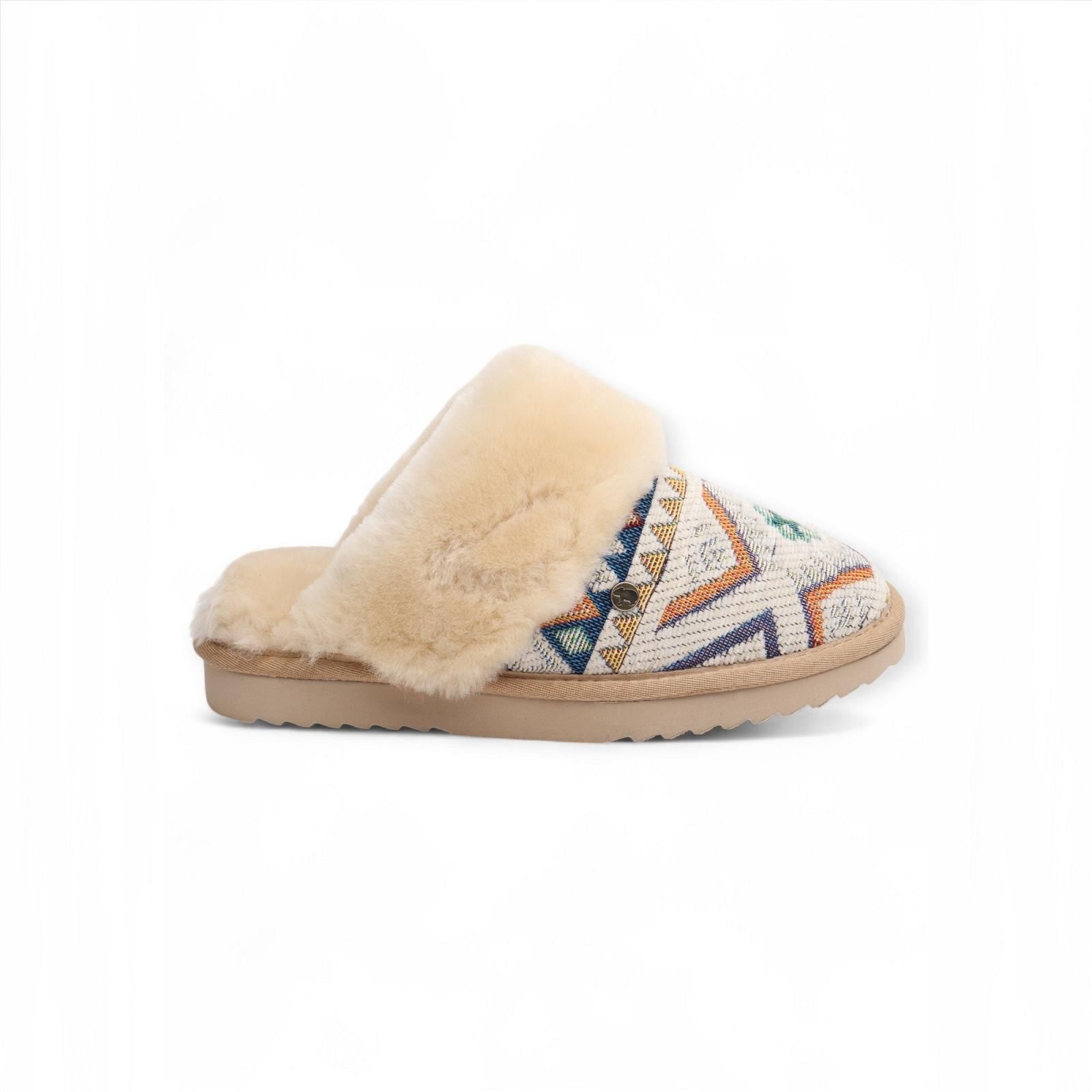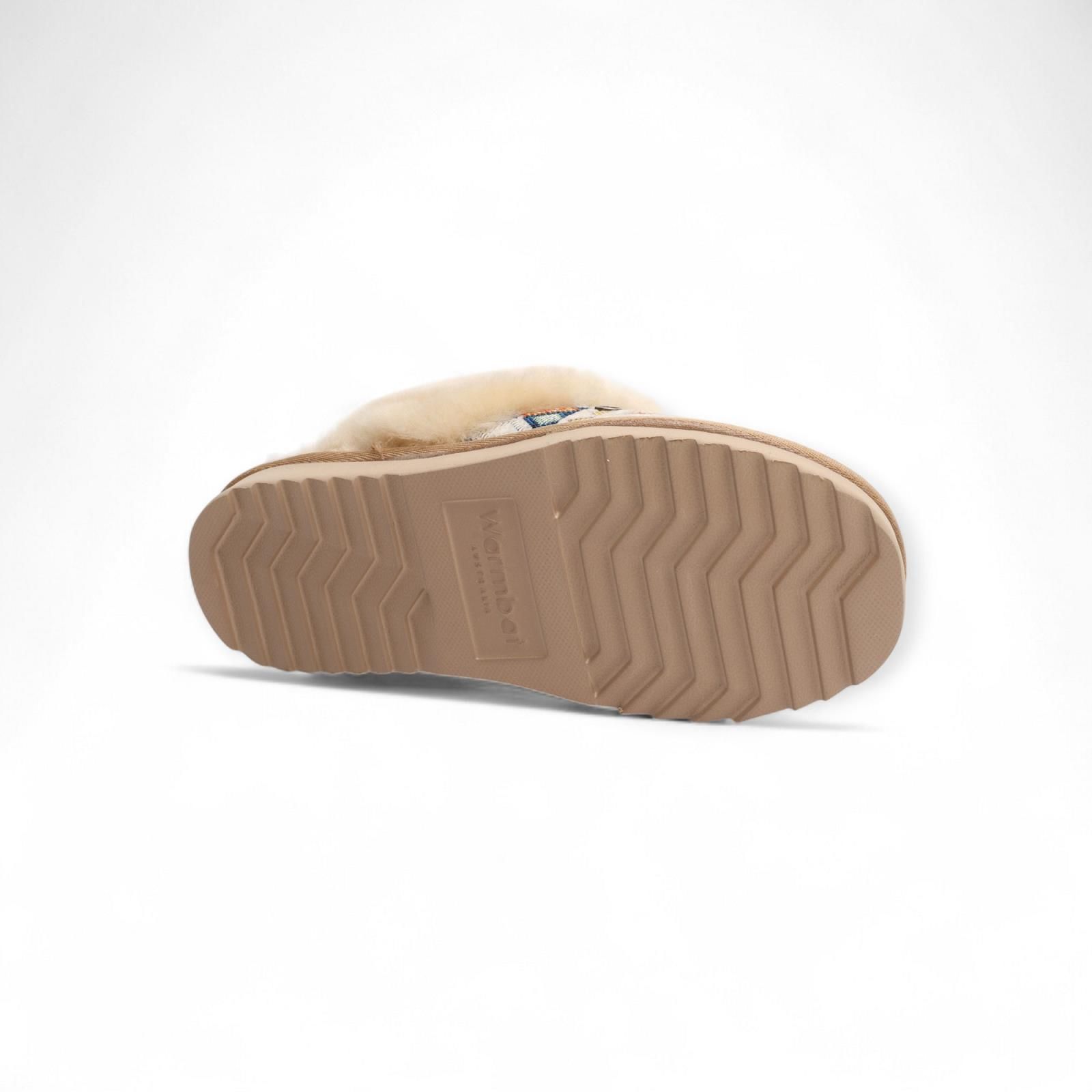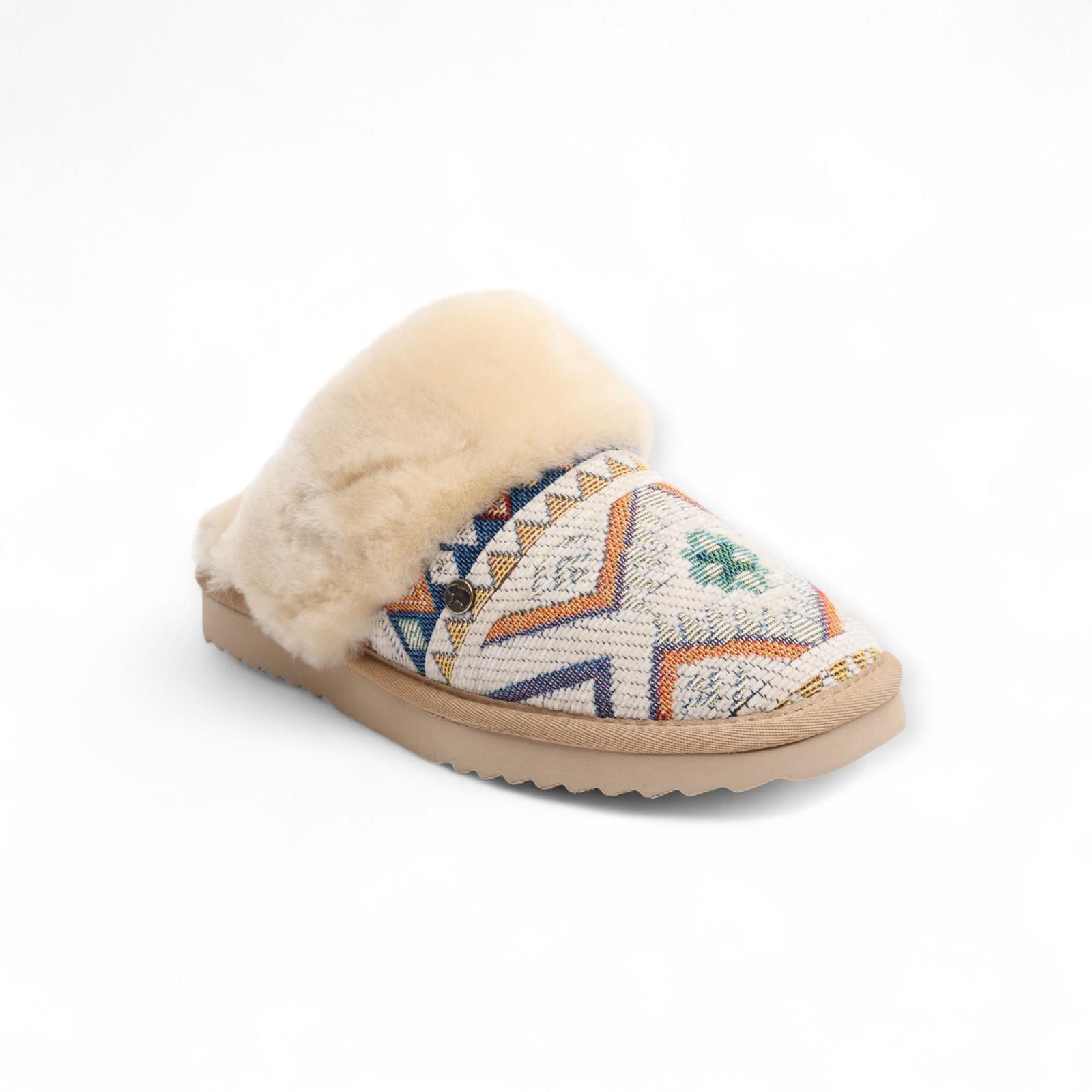 Pantoffel Collie van Warmbat voor dames. Deze pantoffel is gemaakt in geweven stof met mooie kleuren en unieke patronen. Is binnenin met echt schapenwol mee afgewerkt naar de buitenkant. Heeft een dikke rubberen zool die zeer licht aanvoelt en antislip is.