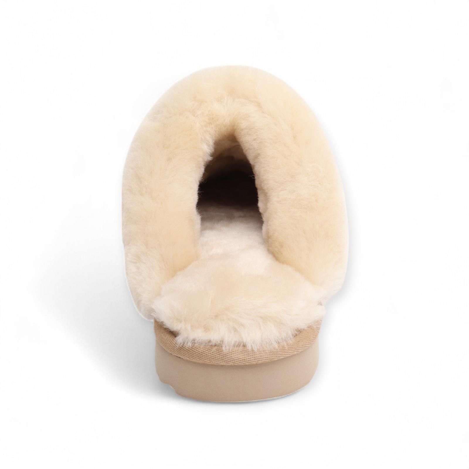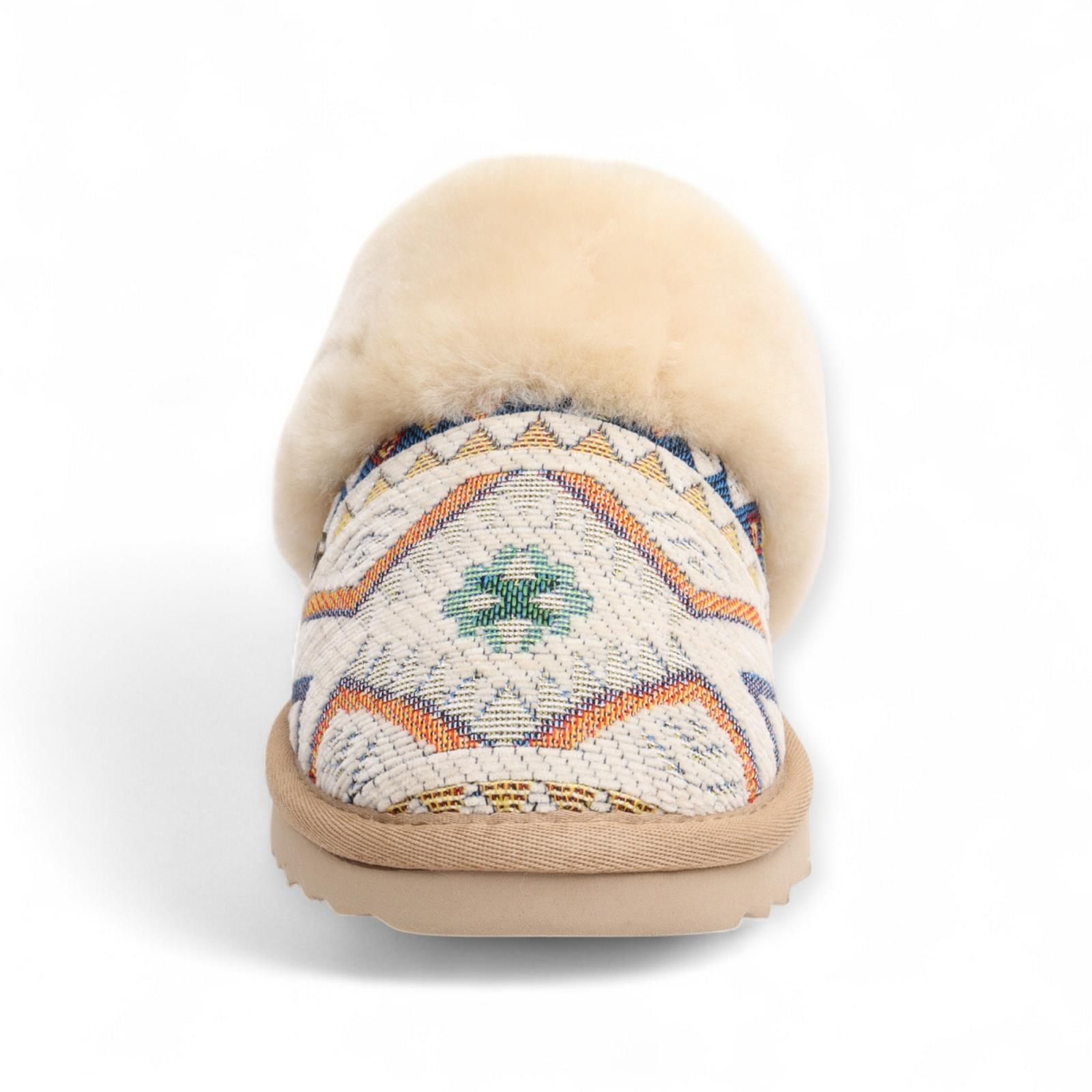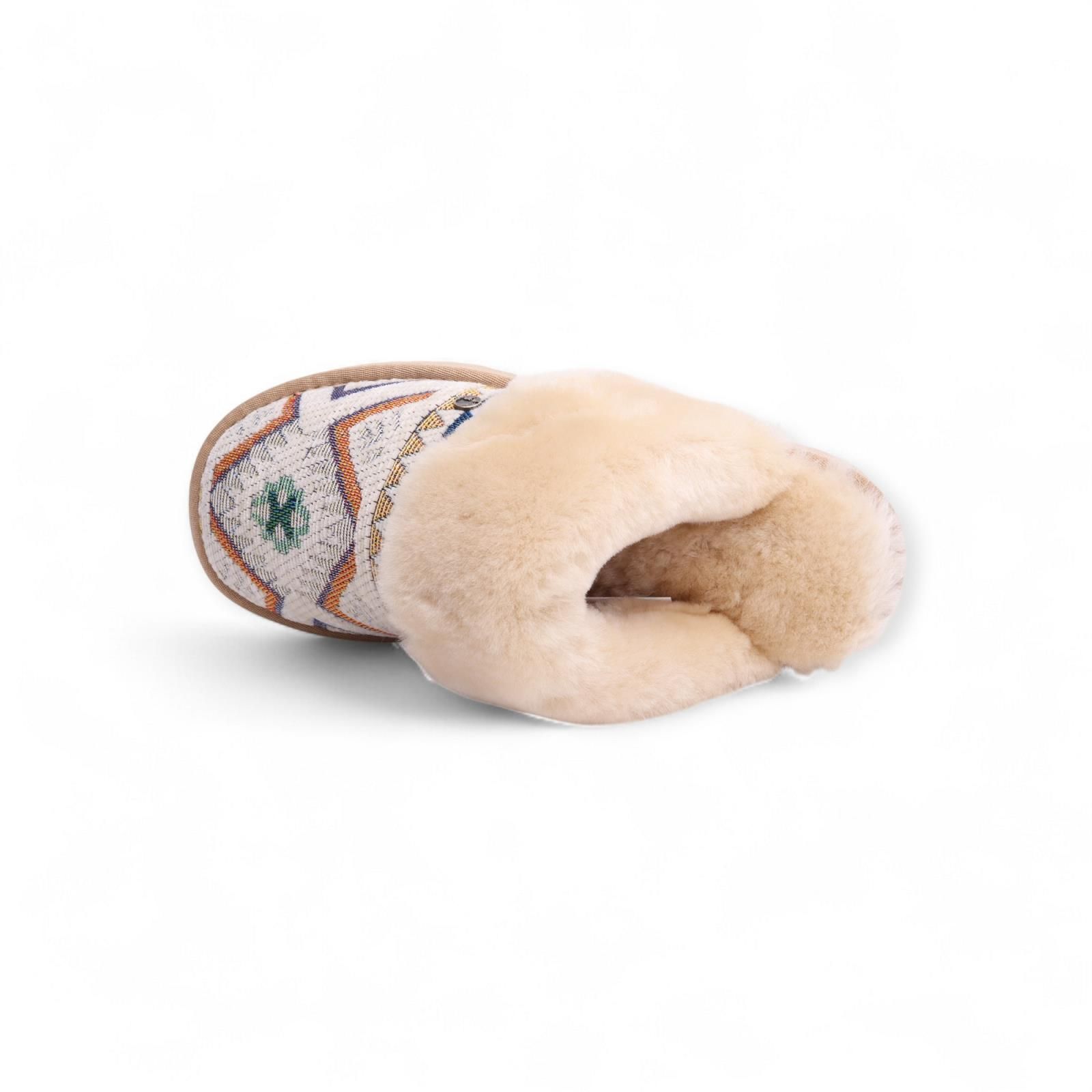 Pantoffel Collie van Warmbat voor dames. Deze pantoffel is gemaakt in geweven stof met mooie kleuren en unieke patronen. Is binnenin met echt schapenwol mee afgewerkt naar de buitenkant. Heeft een dikke rubberen zool die zeer licht aanvoelt en antislip is.