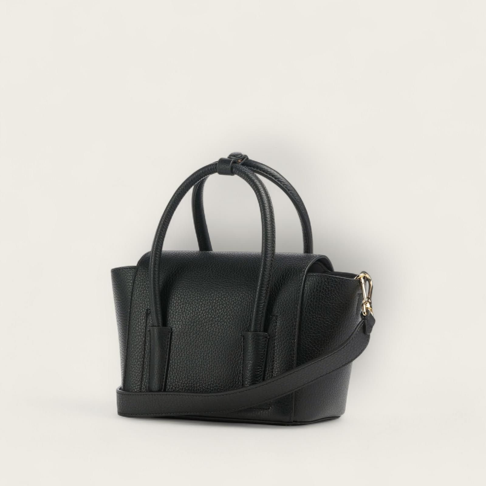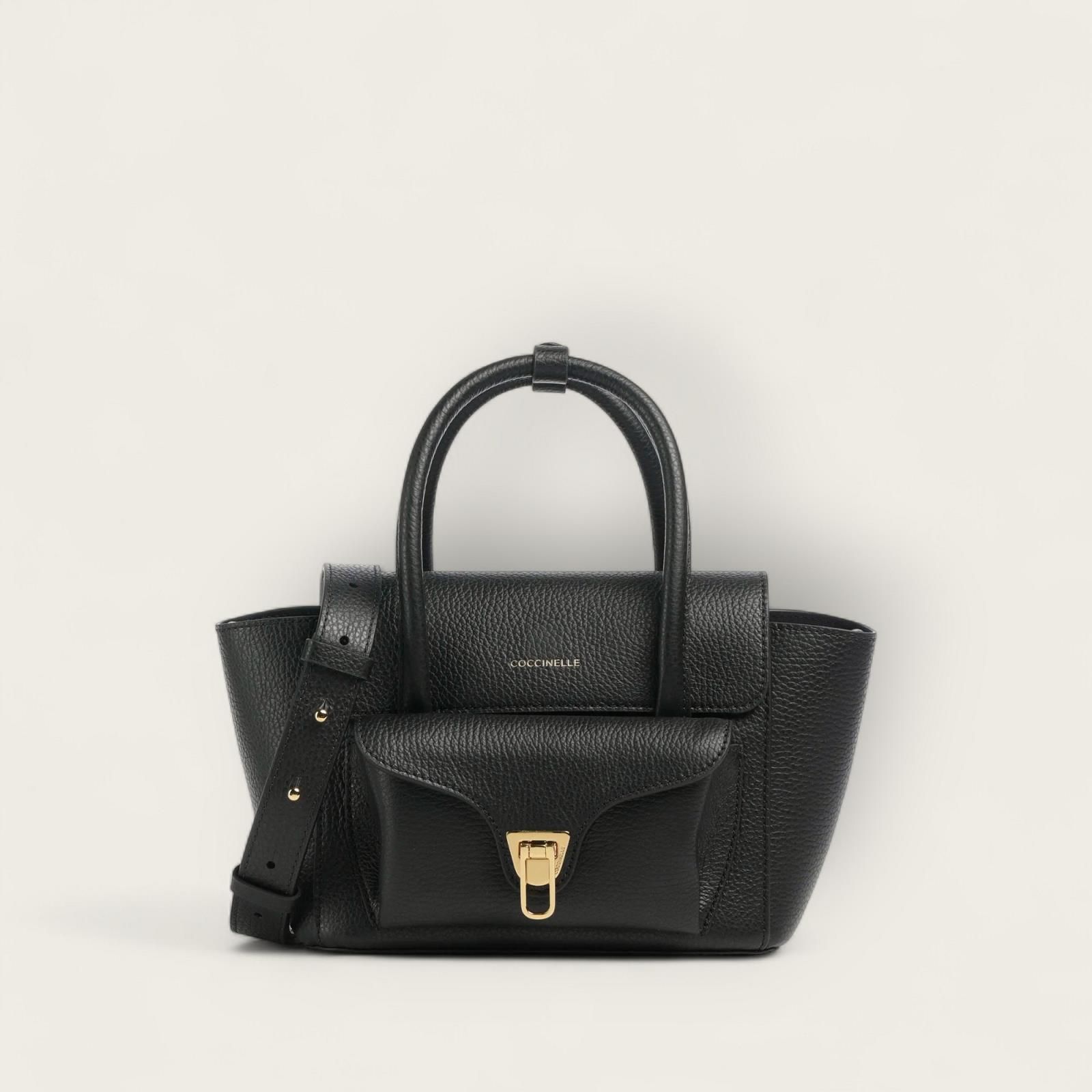 Hand -en schoudertas Double Beat Mini van Coccinelle voor dames in zwart gekorreld leer. Deze handtas valt op door zijn elegante en verfijnde silhouet dat de lijnen van dit nieuwe model accentueert. Het hoofdvak is afgesloten met een klep en magneetsluiting. Heeft binnenin 1 steekvakje en Heeft 2 korte handvaten en een afneembare , verstelbare schouderband. Logo is gestempeld in goud als extra detail. Afgewerkt met gouden studs onderaan voor het leer te beschermen. - Het vakje met klep vooraan is mooi afgesloten met een gouden plectrumsluiting.