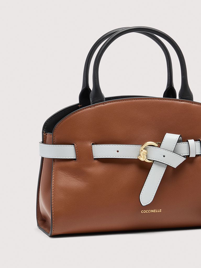Hand -en schoudertas Sabine van Coccinelle voor dames. Deze prachtige handtas is met geometrische en verfijnde rondingen in cognac met zwart leder handvaten en grijze riemen. Heeft een afneembare en verstelbare schouderband. Is onderverdeeld in 3compartimenten waarvan 1 met rits, 1 met magneetknop en 1 met klep waar er nog een steekvakje met rits is.