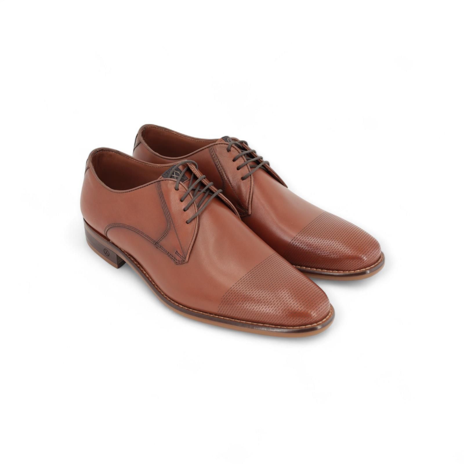 Geklede cognac Gavino veterschoen van Ambiorix. Deze lederen schoen is afgewerkt met een subtiele laserprint op de top en cognac stiksels op de zijkanten. Rubberen zool met typerende print van Ambiorix. Rubberen zool die omrand is met beige stiksels en met typerende print van Ambiorix.