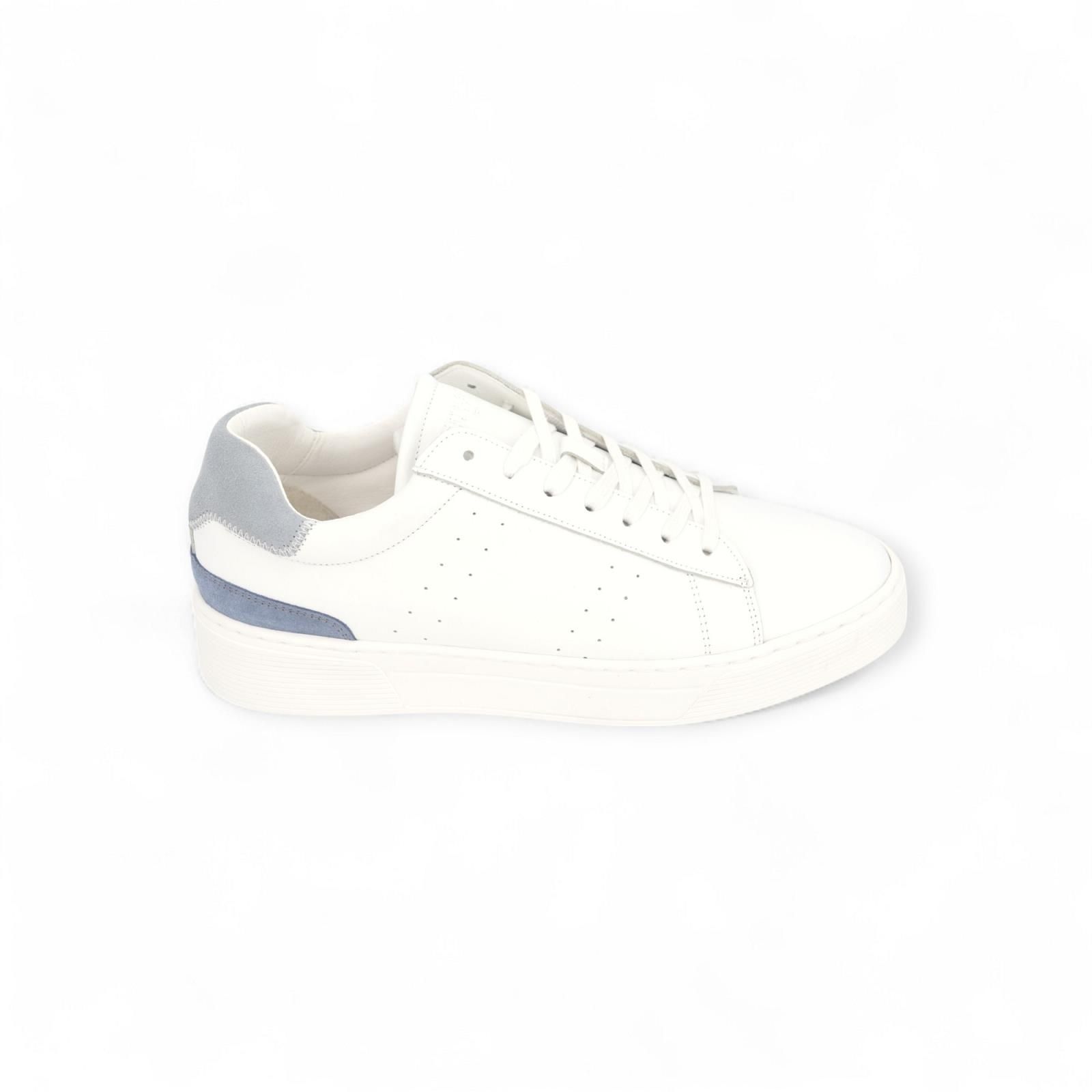 Cycleur de Luxe sneaker JUMP F voor mannen. Deze witte sneaker is volledig in leder met suède blauw en lichtblauw aan de achterkant en stiksels aan de voorkant. Heeft een vaste rubberen zool en een uitneembare binnenzool.