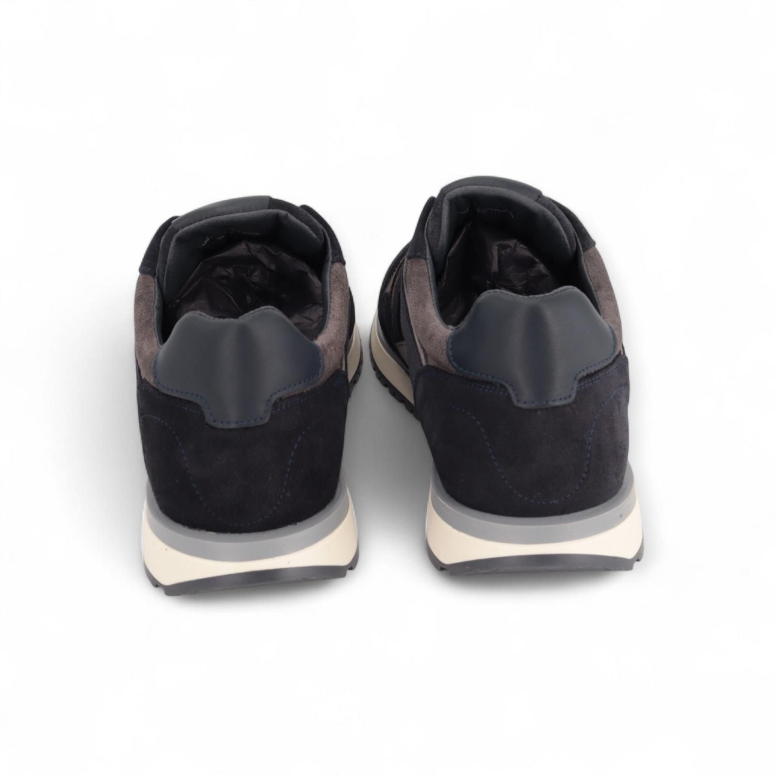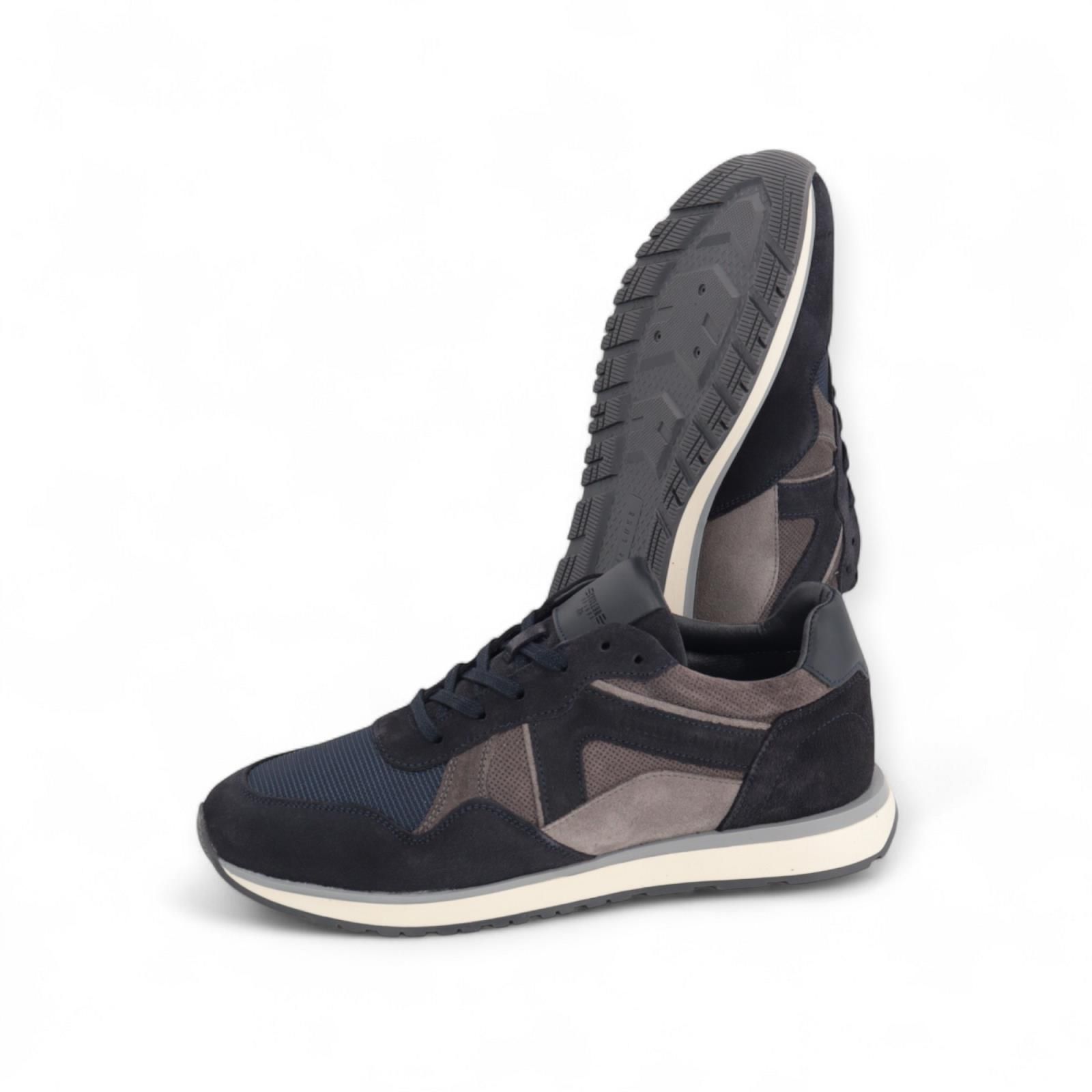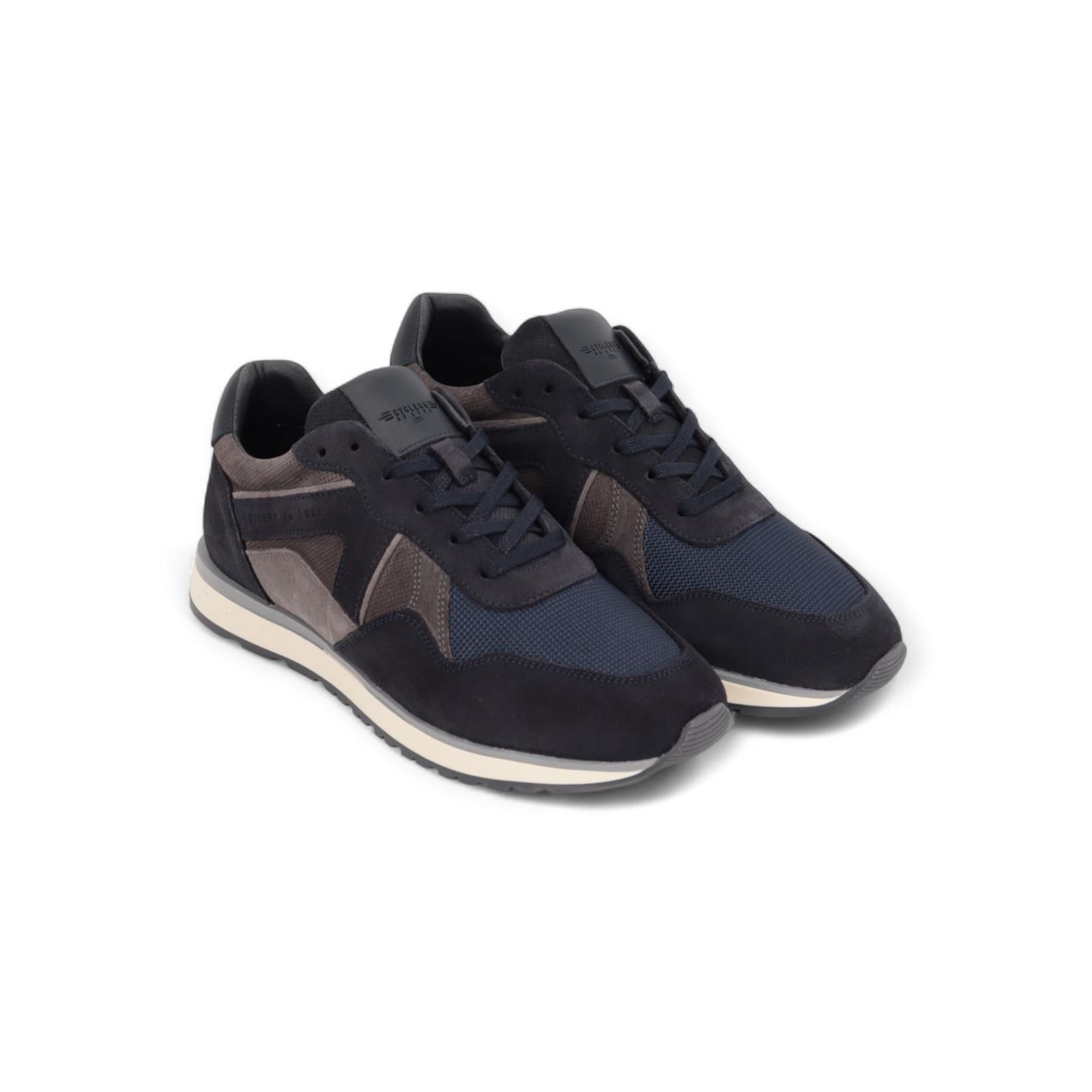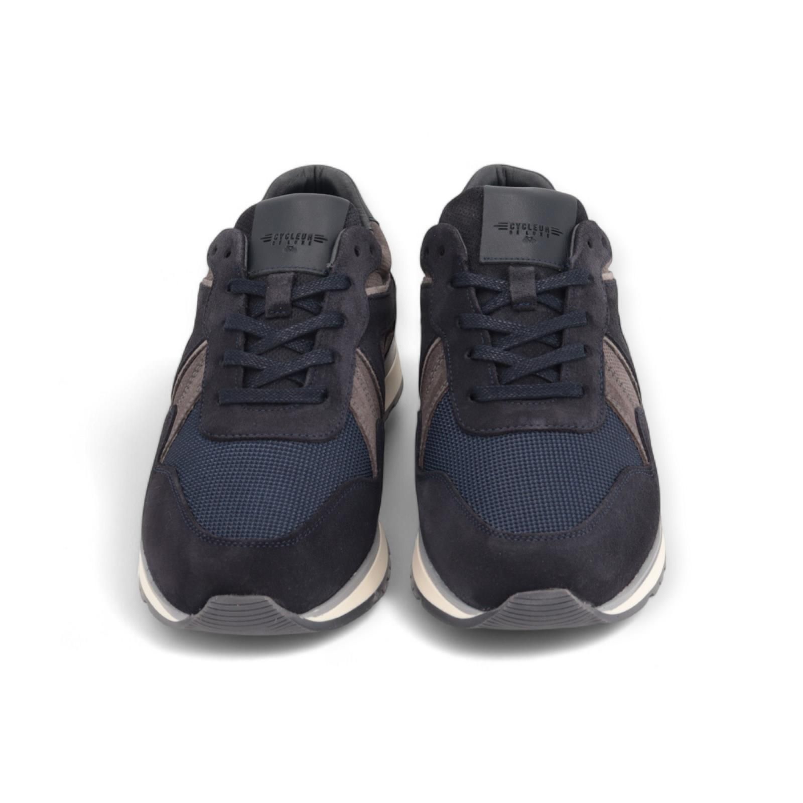 Sneaker P2 van Cycleur De Luxe voor heren. Deze runner is in blauw mesh / suède met grijze en taupe stukken suède aan de zijkant. Heeft een blauw leren hielflap. De binnenzool is uitneembaar en de rubberen buitenzool is afgewerkt met bovenaan een grijze rand.