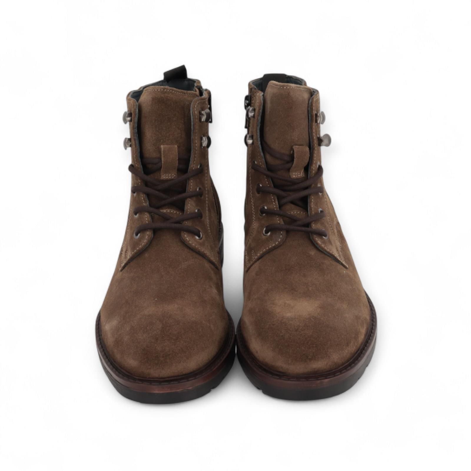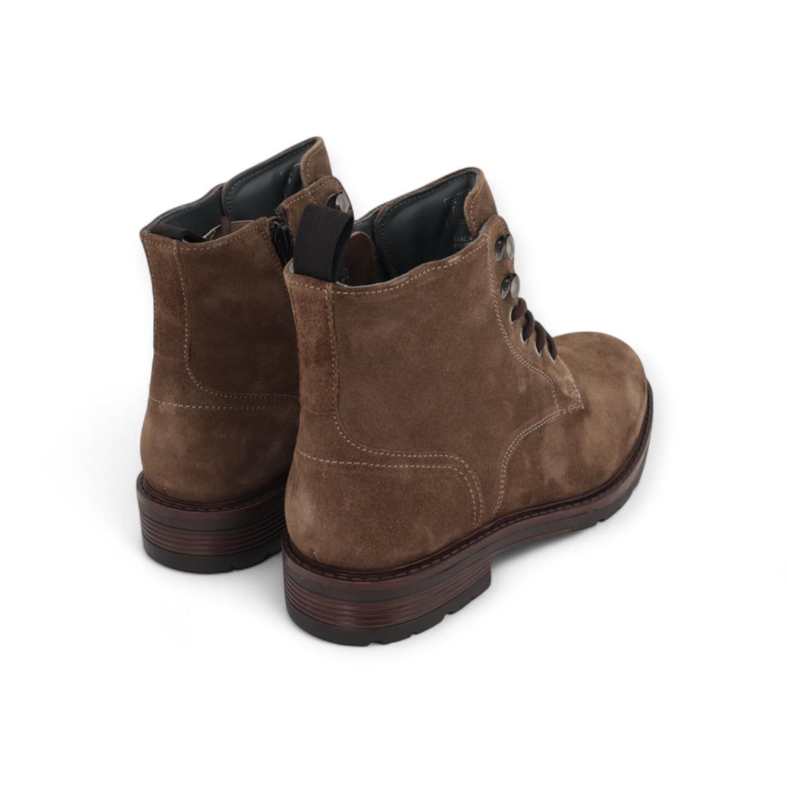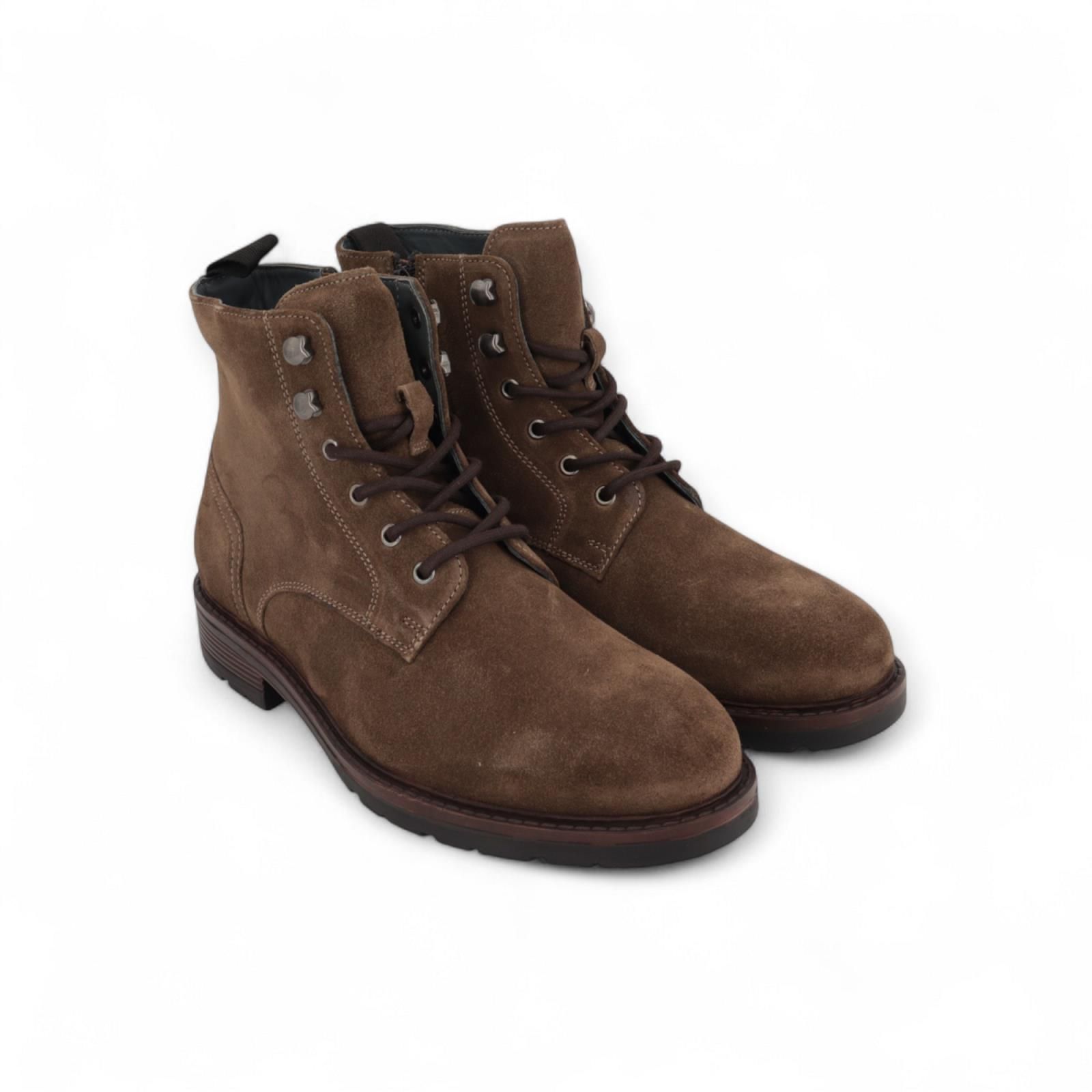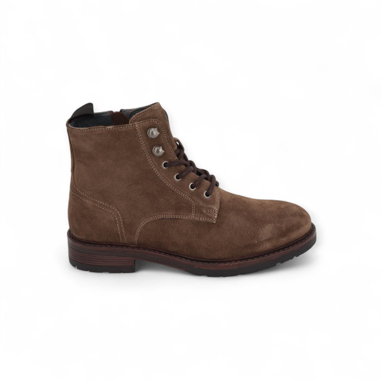Enkellaars Sprocket van Cycleur De Luxe voor heren. Deze enkellaars is in taupe suède. Heeft een veterssluiting met metalen haakjes bovenaan en een ritssluiting aan de zijkant. Is op een dikke antislipzool.