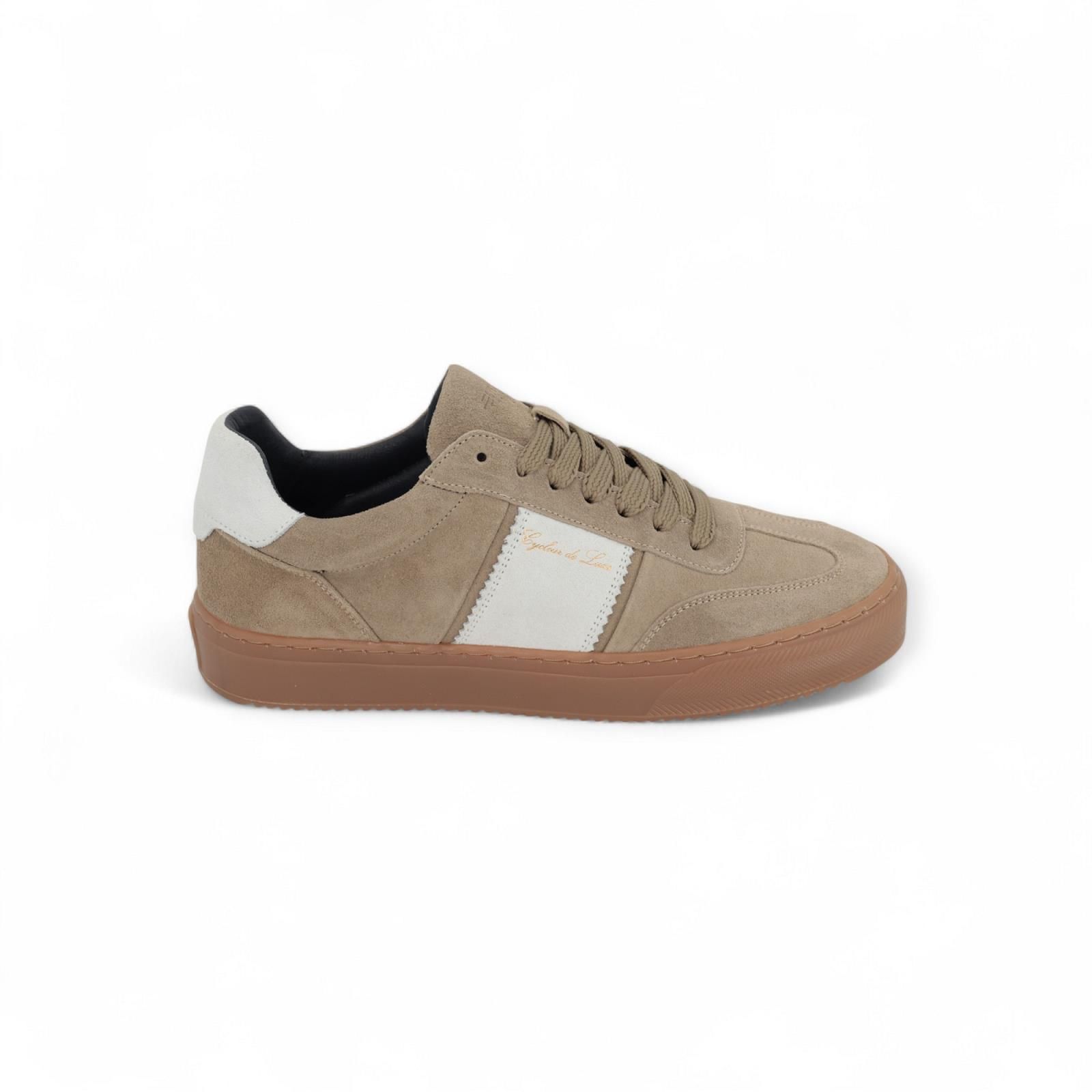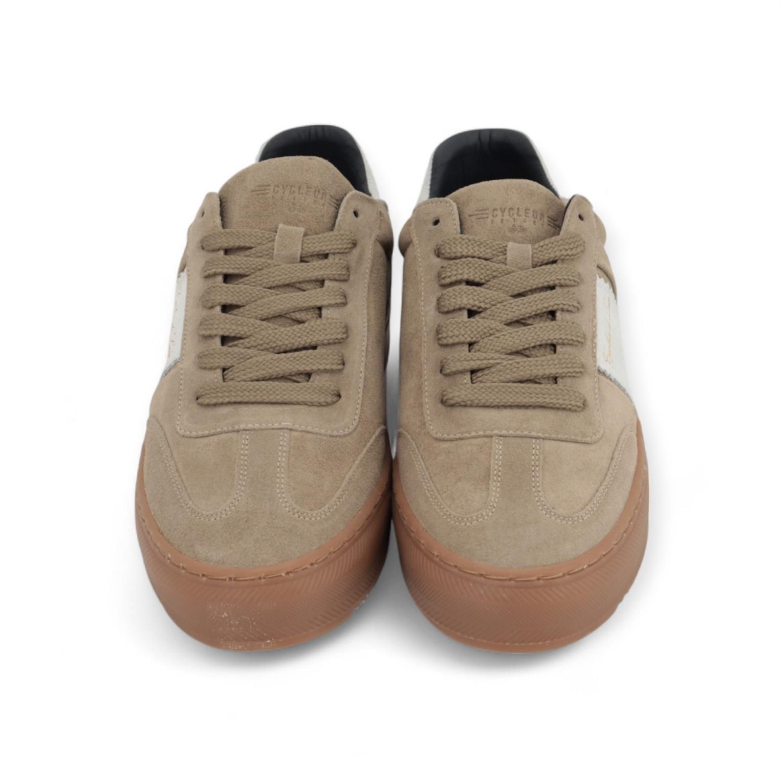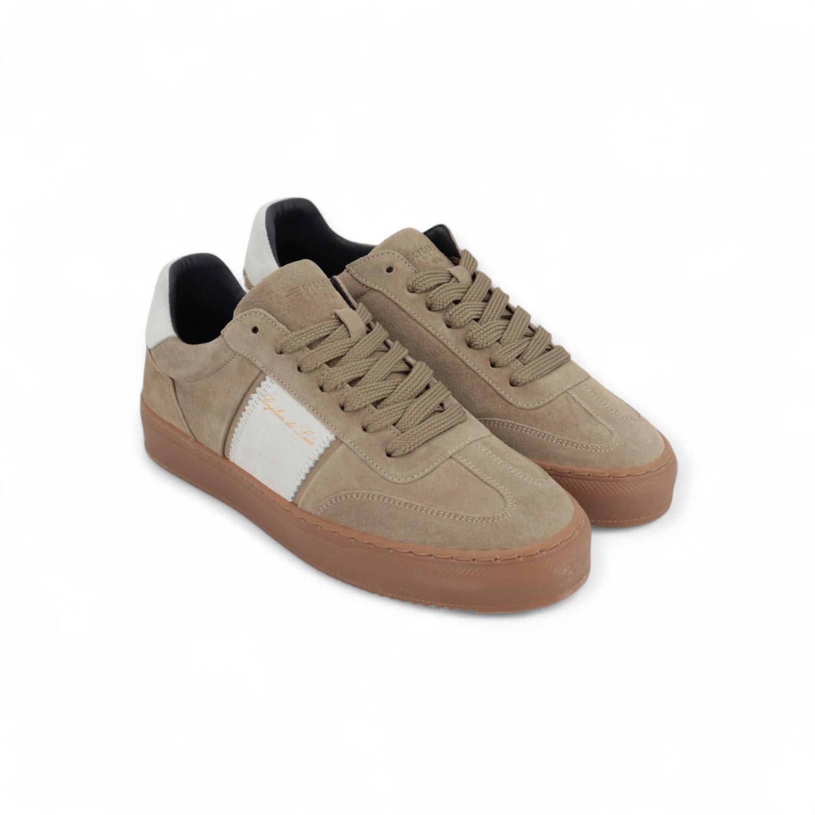 Cycleur de Luxe sneaker V5 voor heren. Deze sneaker is in zand suède met wit gekartelde streep en stekking aan de zijkant en hielflap. Is op een soepele gummy zool met uitneembare binnenzool.