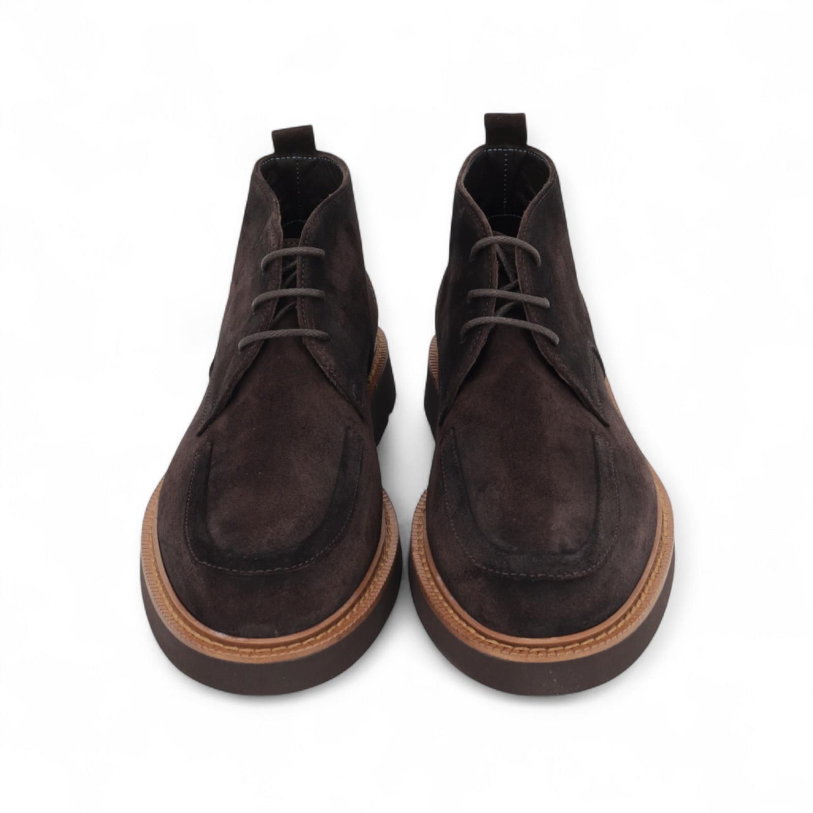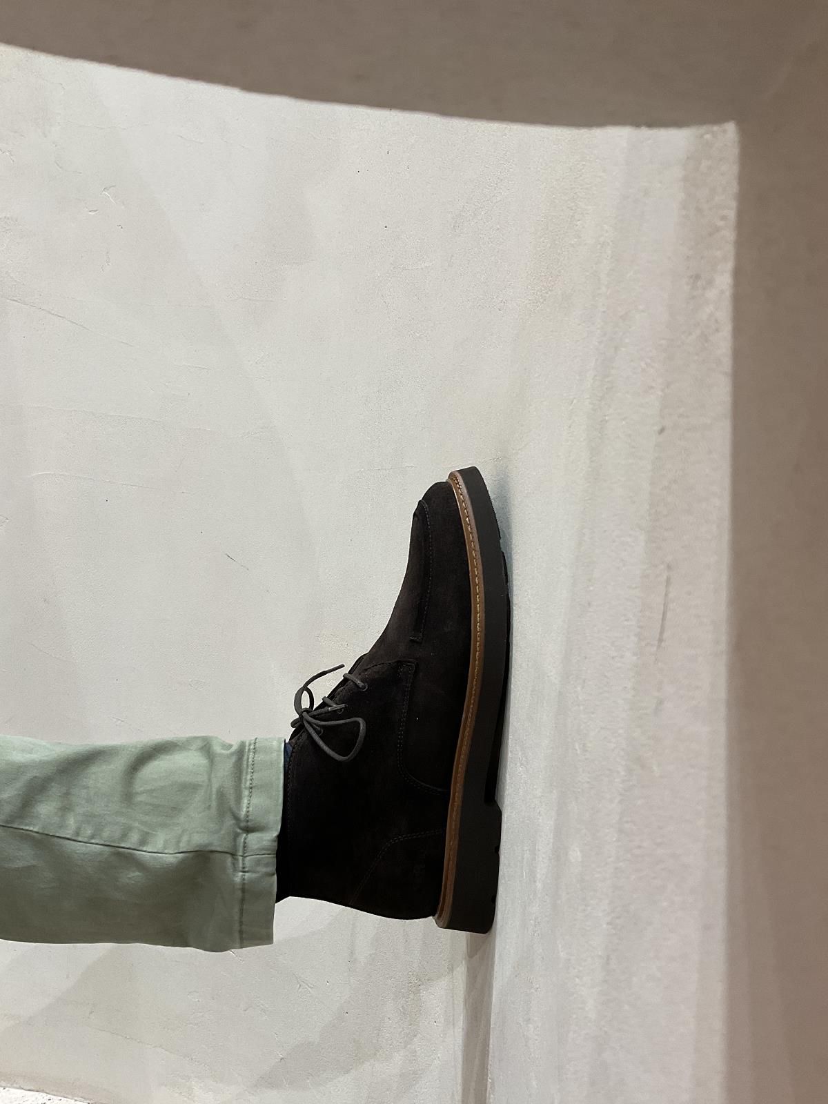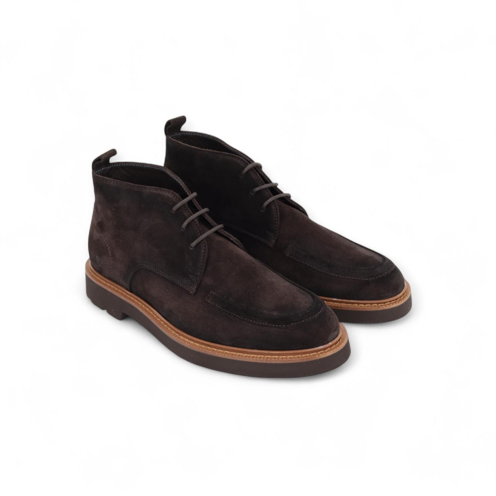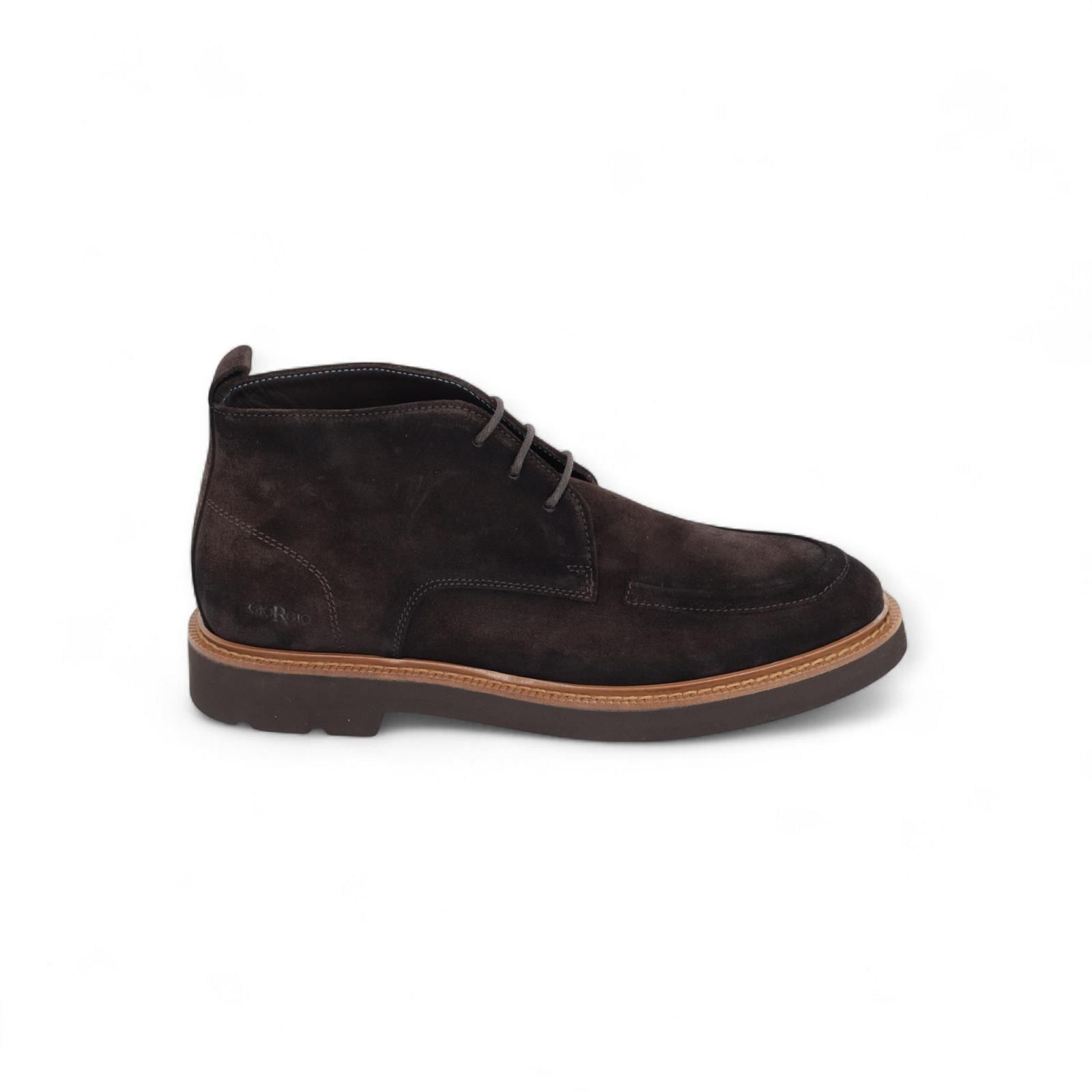 Enkellaars van Giorgio voor heren. Deze enkellaars is in donkerbruine suède met een vetersluiting. Heeft een extra stekking op de voorvoet die het model nog gekleder maakt. Is op een bruine antislipzool die licht aanvoelt. De binnenzool is uitneembaar.