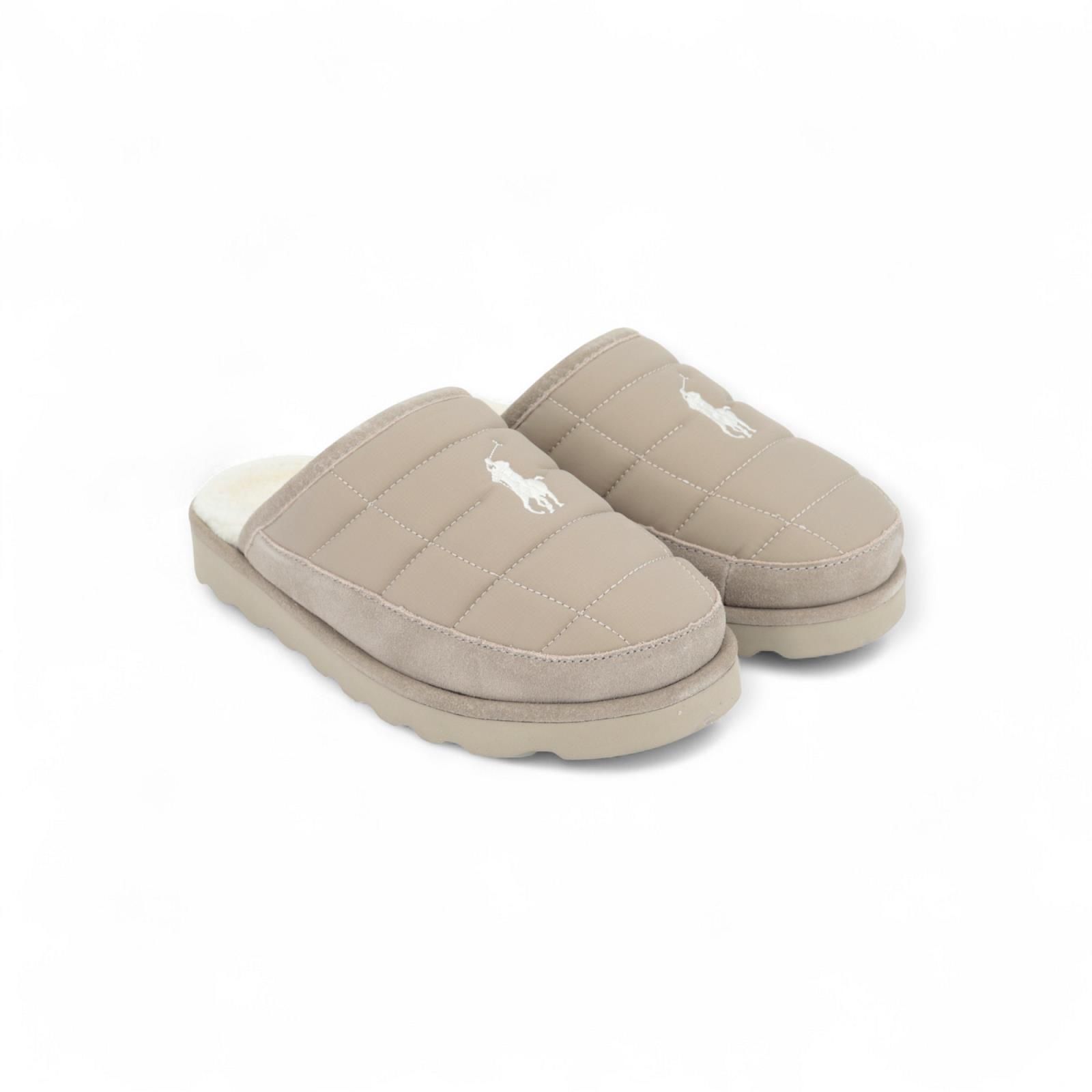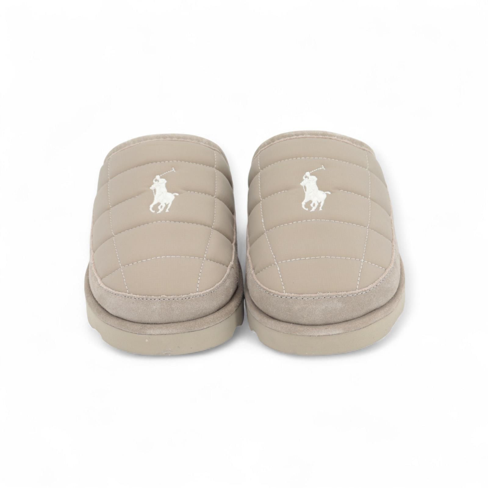 Pantoffel Reade Scuff van Polo Ralph Lauren voor heren. Deze pantoffel / slipper is in beige. Heeft een nylon bovenkant met patroon in gestikt. Afgewerkt met een wit paard logo. Is op een stoffen binnenzool en heeft een dikke buitenzool afgewerkt met suède en rubber.
