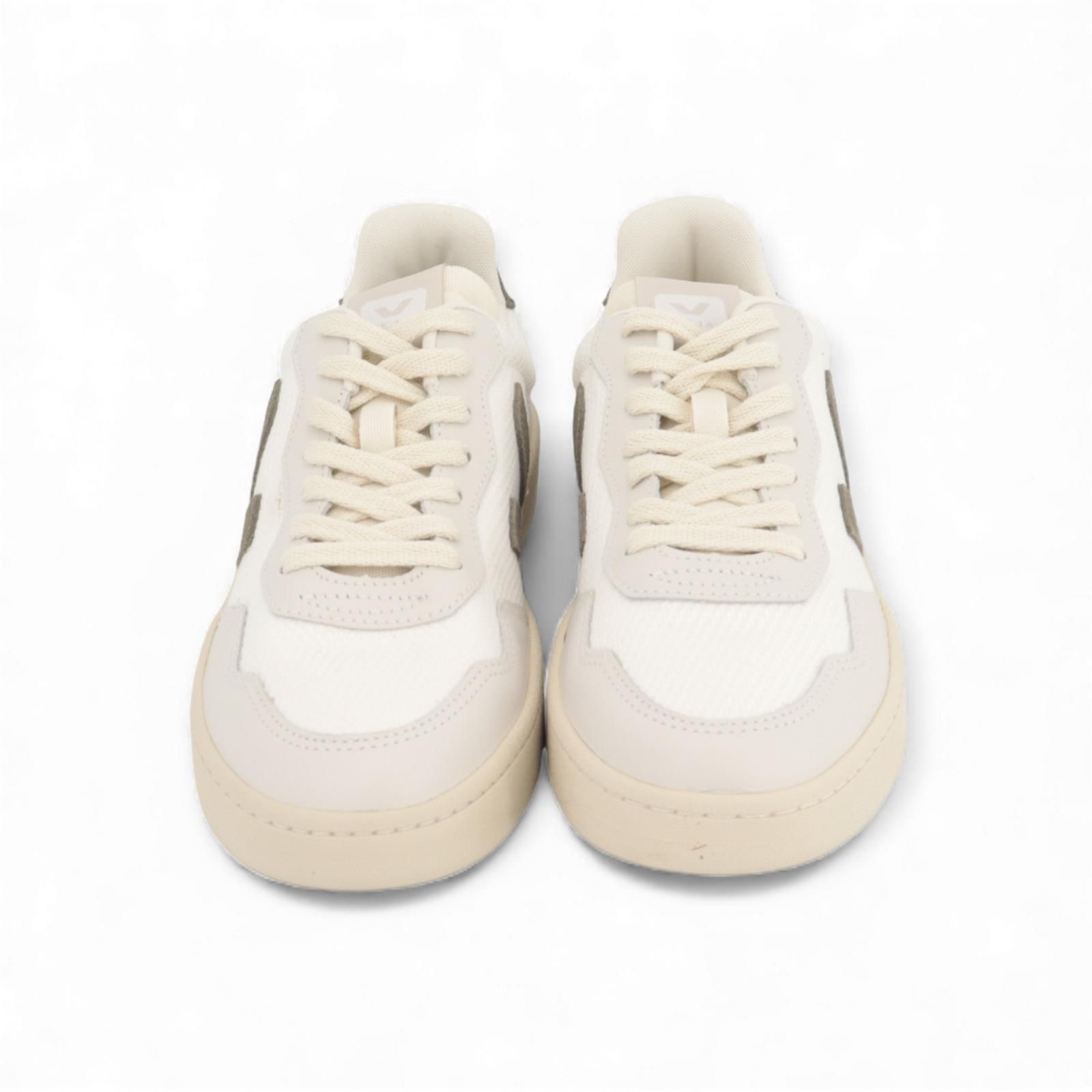 Veja V-90 B-Mesh voor heren. Deze sneaker is gemaakt is wit b-mesh (= recycled polyester) met off wit eco leer. De iconische V aan de zijkant en de flap is in kaki suède. De voering in de schoen is van biologisch katoen en gerecycled polyster. De binnenzool van deze schoen is uitneembaar. De buitenzool is gemaakt van wild rubber.