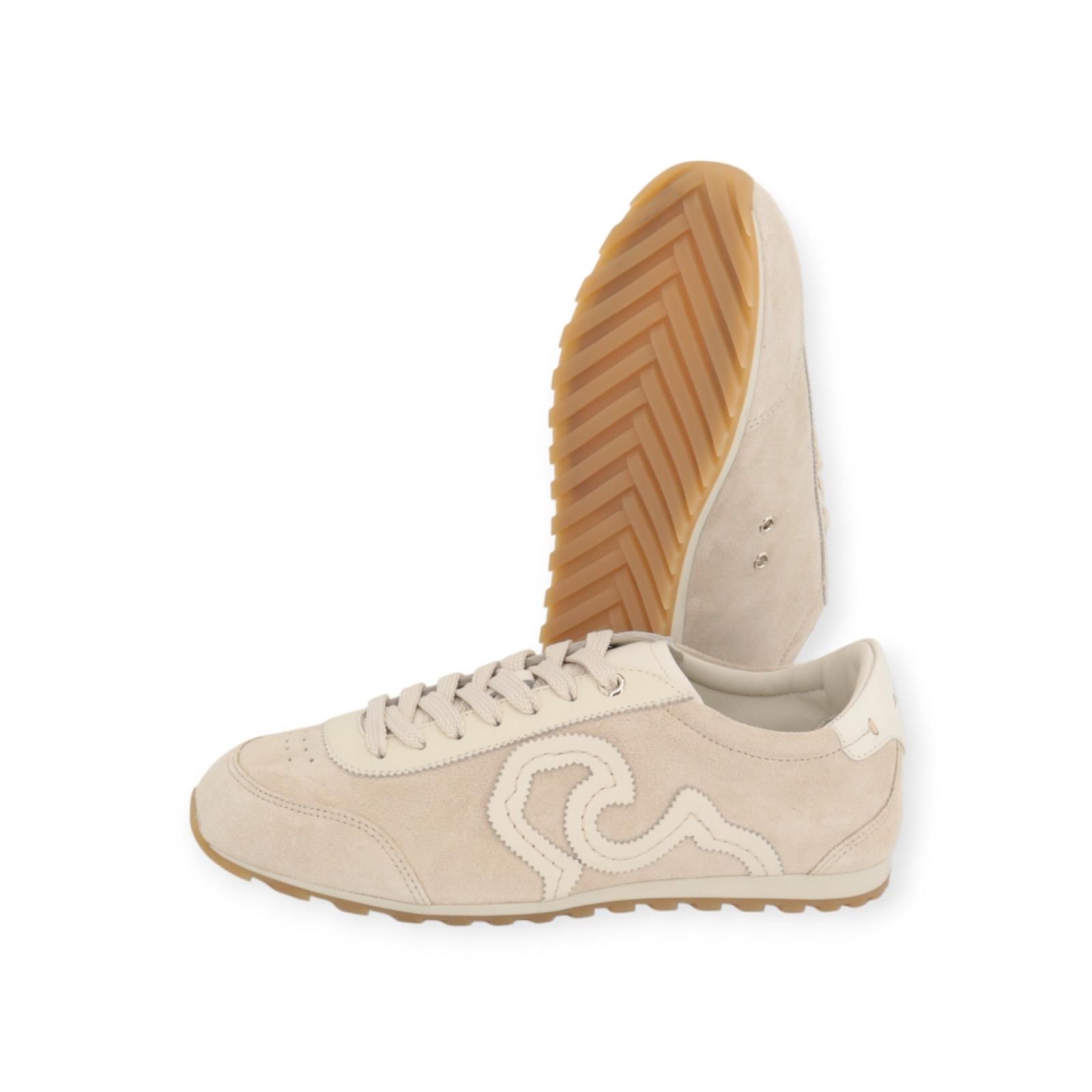 Sneaker Court van Acanto voor dames. Deze sneaker is in zacht grijs suède met off wit gekarteld leer rond de veters. Is versierd met een leren acanthus blad aan de zijkant en afgewerkt met grijze veters. Deze sneaker heeft een laag profiel en is zeer licht en flexibel. Heeft een uitneembare binnenzool en is op een rubberen ‘court’ sportievere buitenzool.