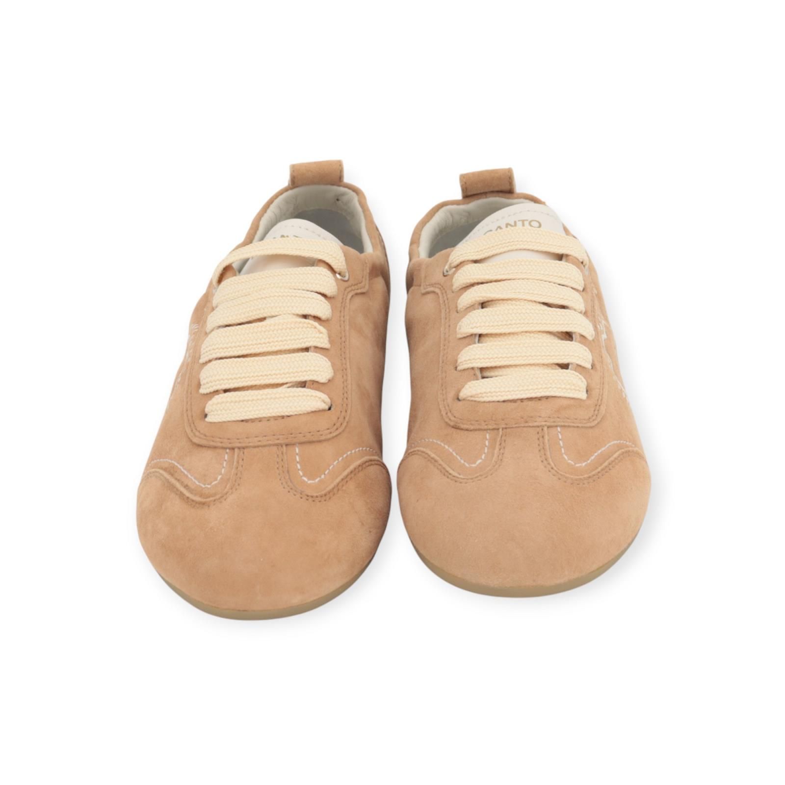 Sneaker Girona van Acanto voor dames. Deze sneaker is in beige suède. Is versierd met een subtiel acanthus blad in borduurwerk aan de zijkant en afgewerkt met beige veters. Deze sneaker heeft een laag profiel en is zeer licht en flexibel. Heeft een uitneembare binnenzool en is op een rubberen buitenzool.