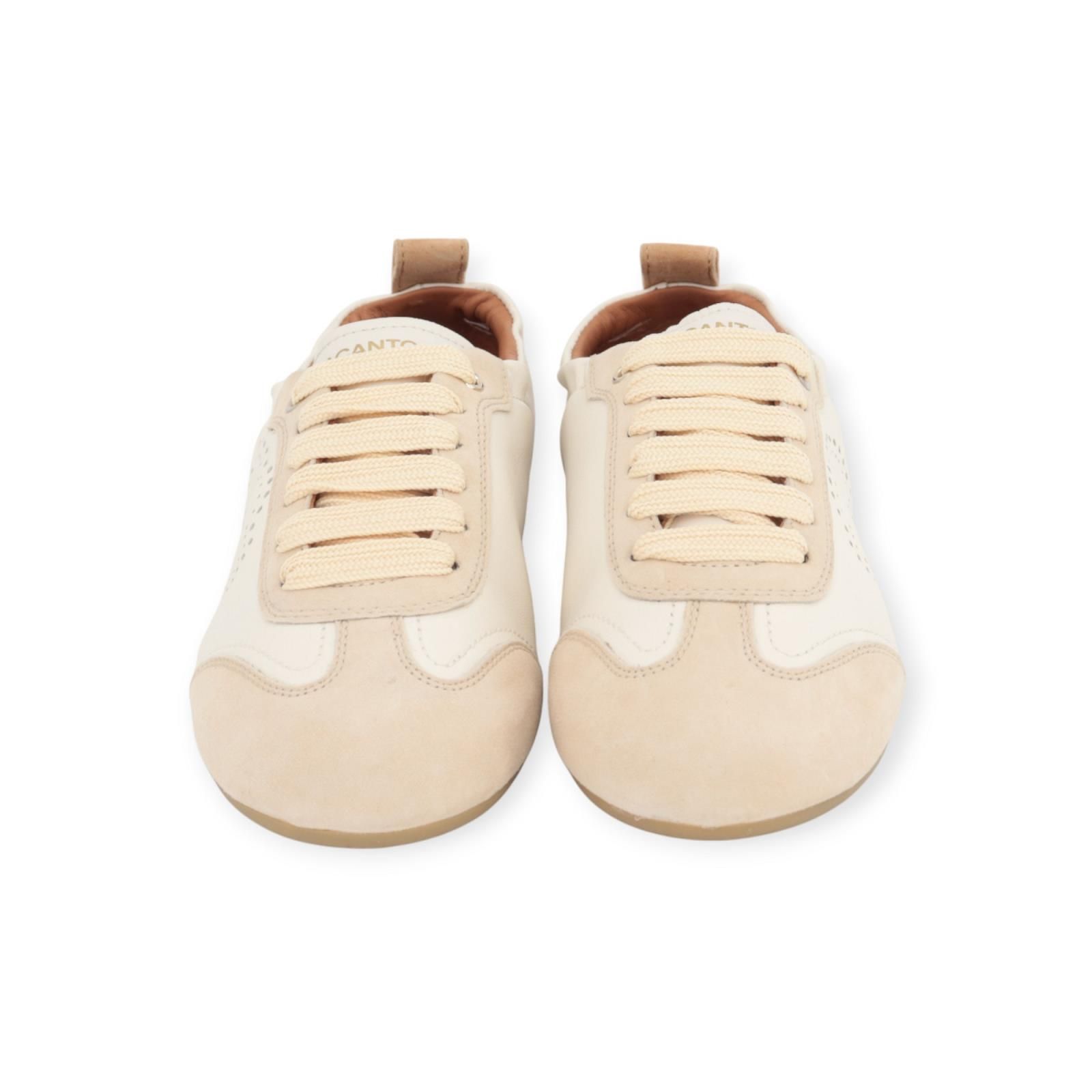 Sneaker Levante van Acanto voor dames. Deze sneaker is in off wit leer met zand suède. Is versierd met een subtiel geperforeerd acanthus blad aan de zijkant en afgewerkt met beige veters. Deze sneaker heeft een laag profiel en is zeer licht en flexibel. Heeft een uitneembare binnenzool en is op een rubberen buitenzool.