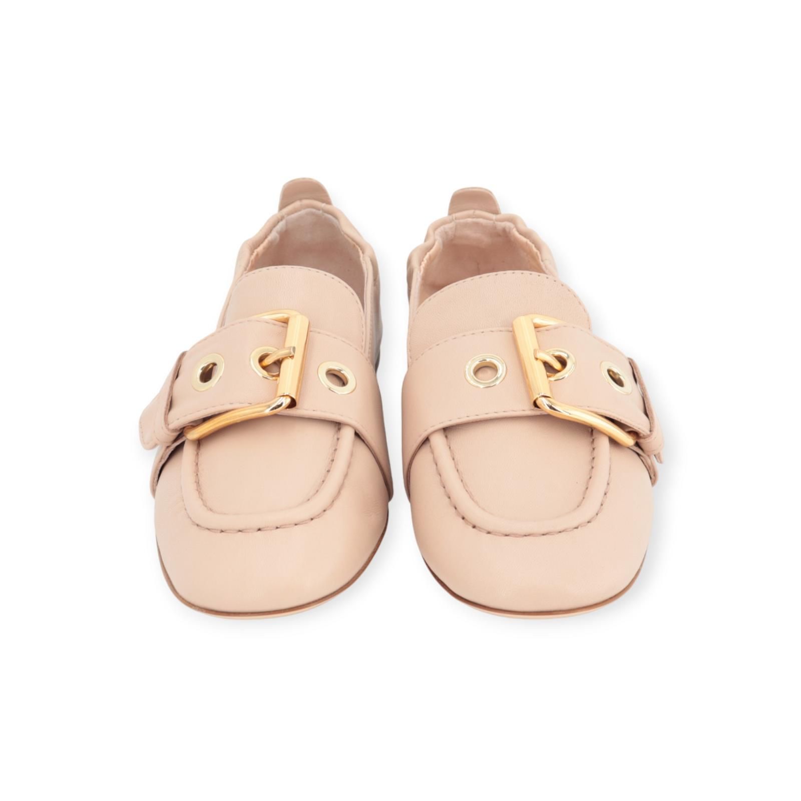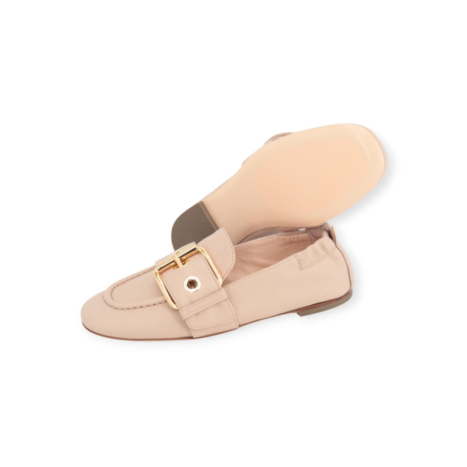 Mocassin Maya van AGL voor dames. Deze elegante loafer is in zacht nude leer. Op de wreef is er een mooi afgewerkte band met een gouden gespsluiting en gouden details. Heeft een lichte carré top met een dubbele stekking op de neus. Blijft mooi aan de voet door de elastiek achteraan aan de hiel. Is op een buitenzool in leer.