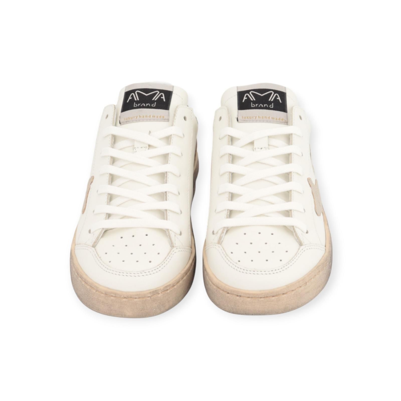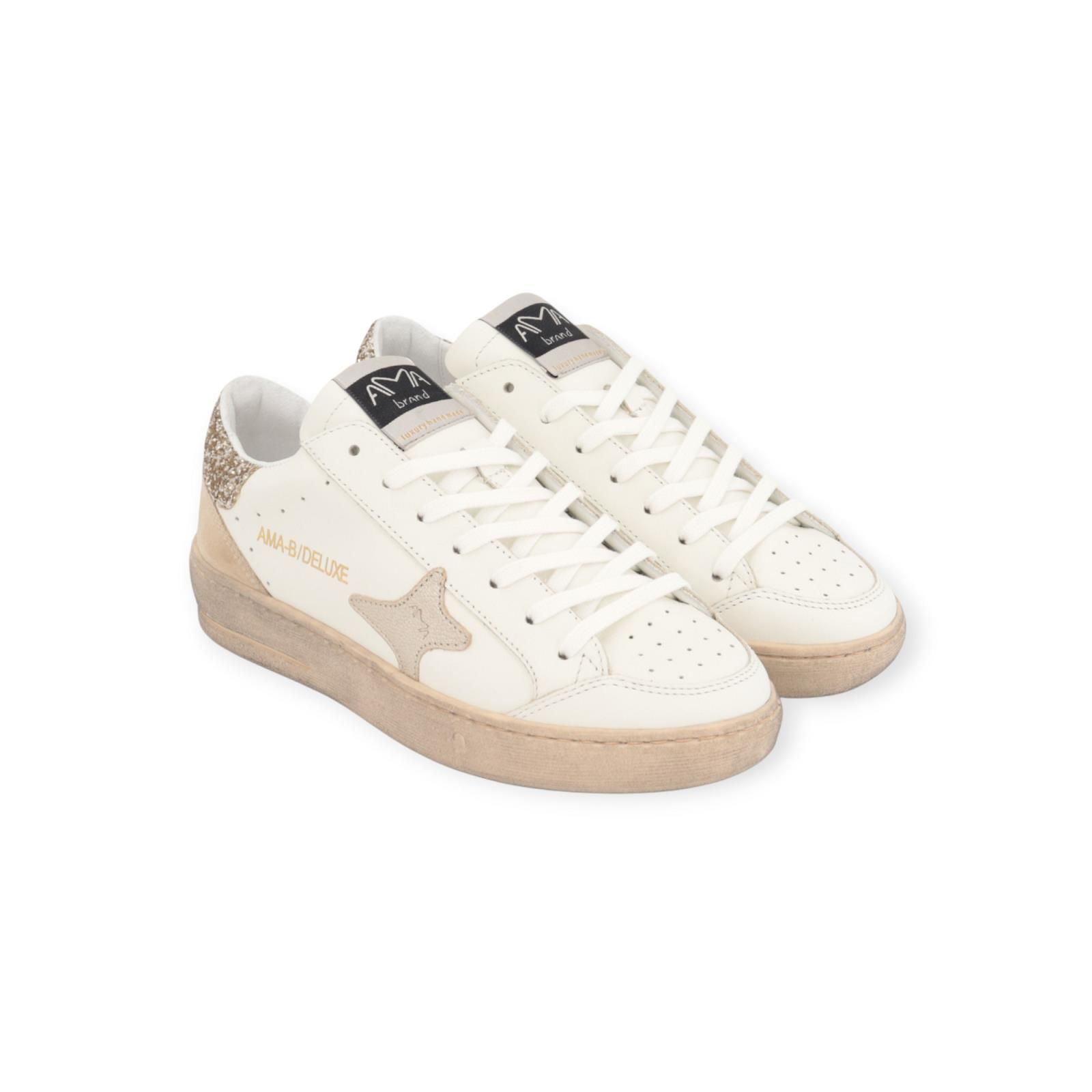 Sneaker Slam 4527 van Ama Brand voor dames. Deze hippe sneaker is in wit leer. Heeft een geperforeerde neus met shining zilver logo aan de zijkant. De hielflap is in glitter goud met suède beige. Heeft een dikke zool gebrusht voor een ‘gedragen’ look te creëren. De binnenzool is uitneembaar.