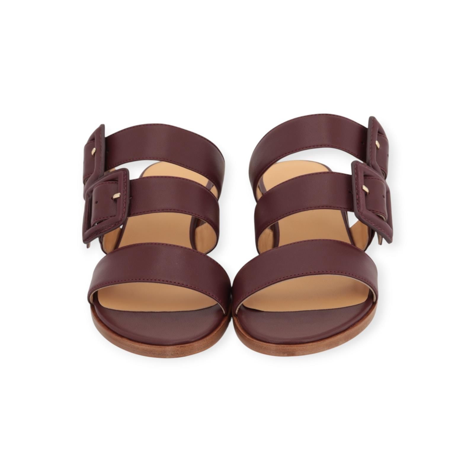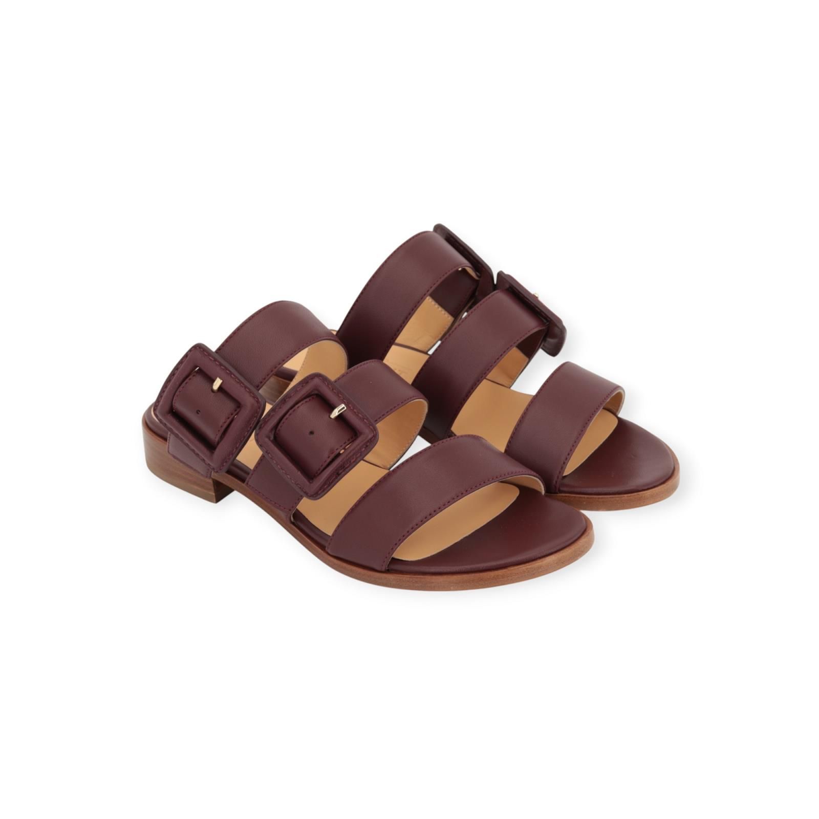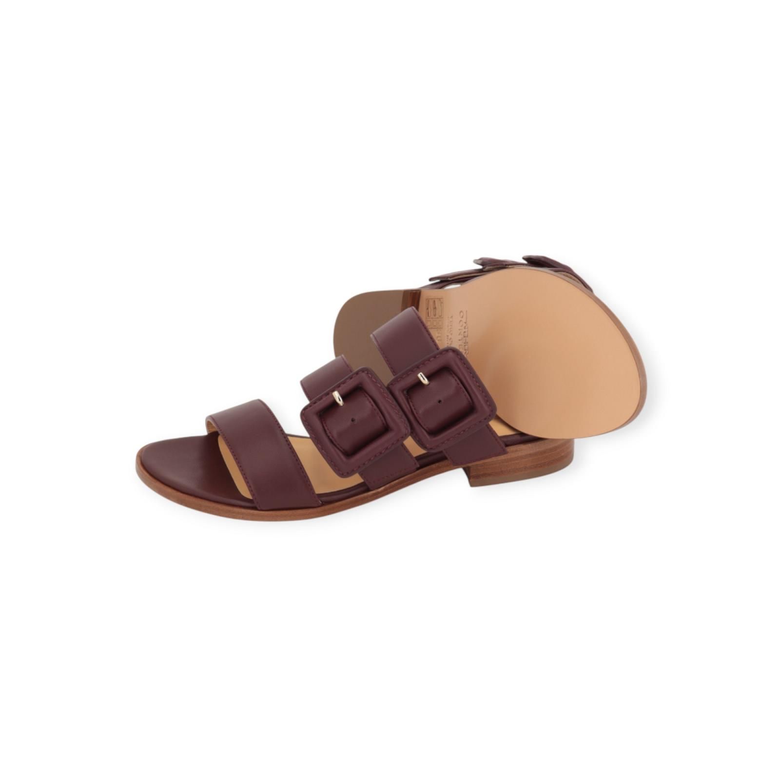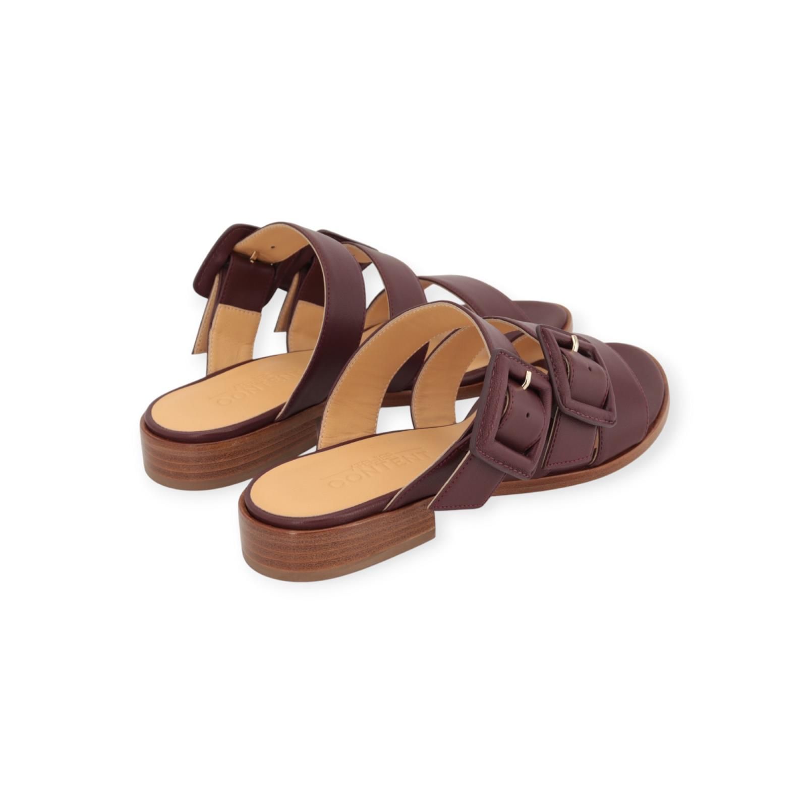 Slipper Emke van Atelier Content voor dames. Deze elegante slipper is in bordeaux zacht geitenleer. Heeft 3 bandjes over de wreef, waarvan 2 met opvallende brede gespsluiting. Heeft een hakje van 2cm hoog in gelaagd leer met een dun leren buitenzooltje. Dit model is zeer elegant en past normaal qua maat, kies je gebruikelijke maat.