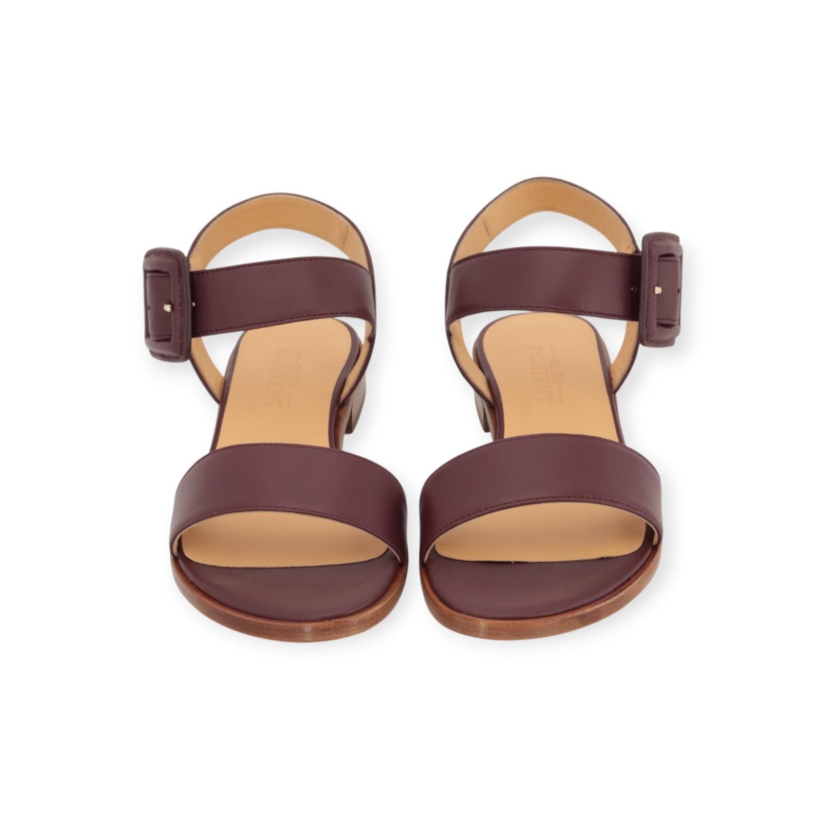 Sandaal Enissa van Atelier Content voor dames. Deze elegante sandaal is in bordeaux zacht geitenleer. Heeft een fijn bandje over de wreef en een band rond de enkel met opvallende gespsluiting. Heeft een hakje van 2cm hoog in gelaagd leer met een dun leren buitenzooltje. Dit model is zeer elegant en past normaal qua maat, kies je gebruikelijke maat.