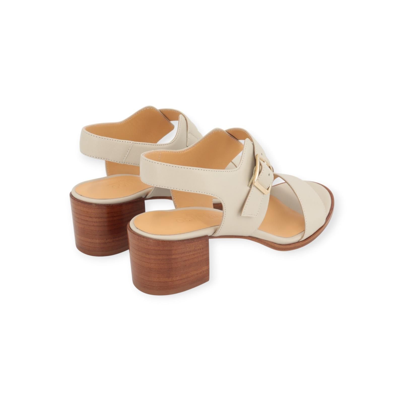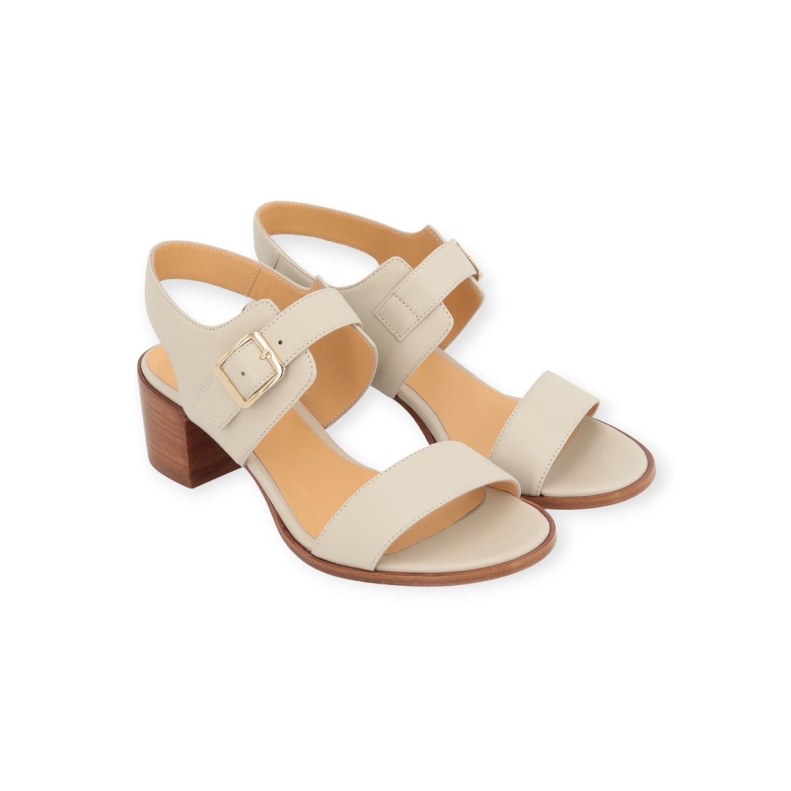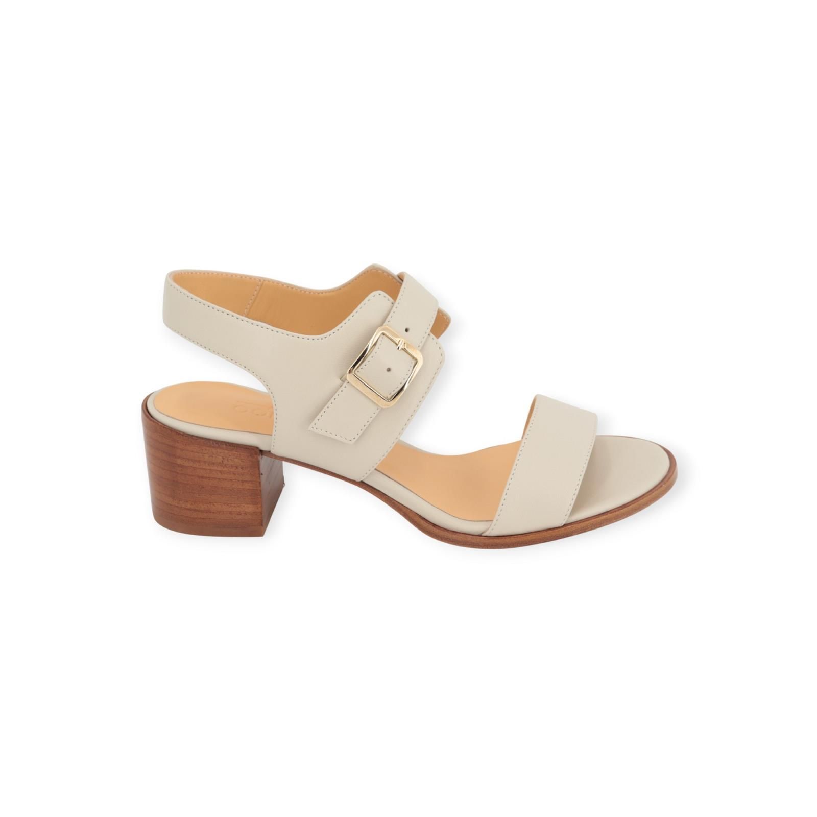 Sandaal Eve van Atelier Content voor dames. Deze sandaal is in zacht off wit geitenleer. Heeft een fijn bandje rond de wreef en een band rond de hiel die mooi gesloten is met een gouden gespsluiting rond de enkel. Is op een mooie blokhak bekleed met gelaagd leer van 5cm hoog met een dun leren buitenzool. Dit model is zeer elegant en ook geschikt voor bredere voeten. Past normaal qua maat, kies je gebruikelijke maat.