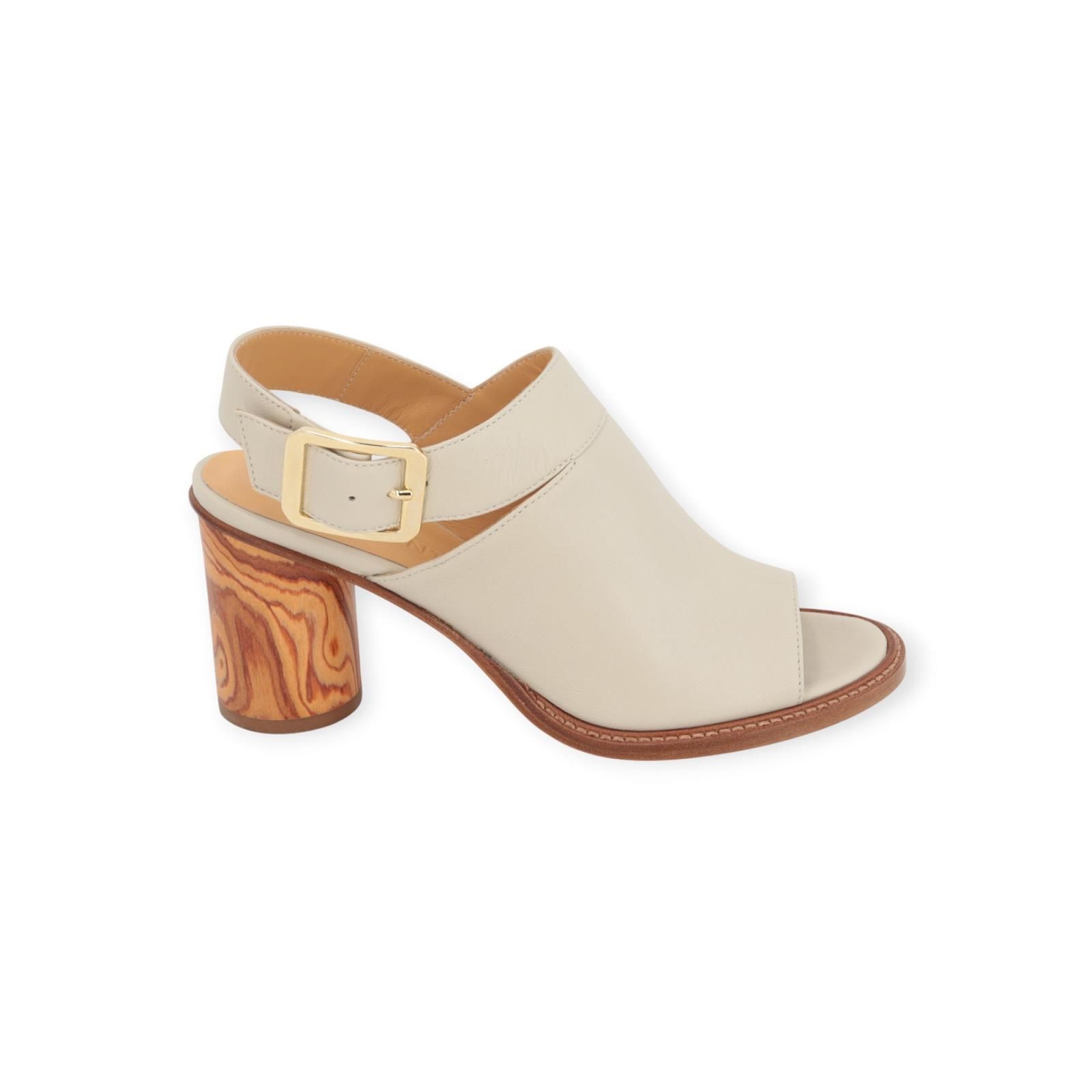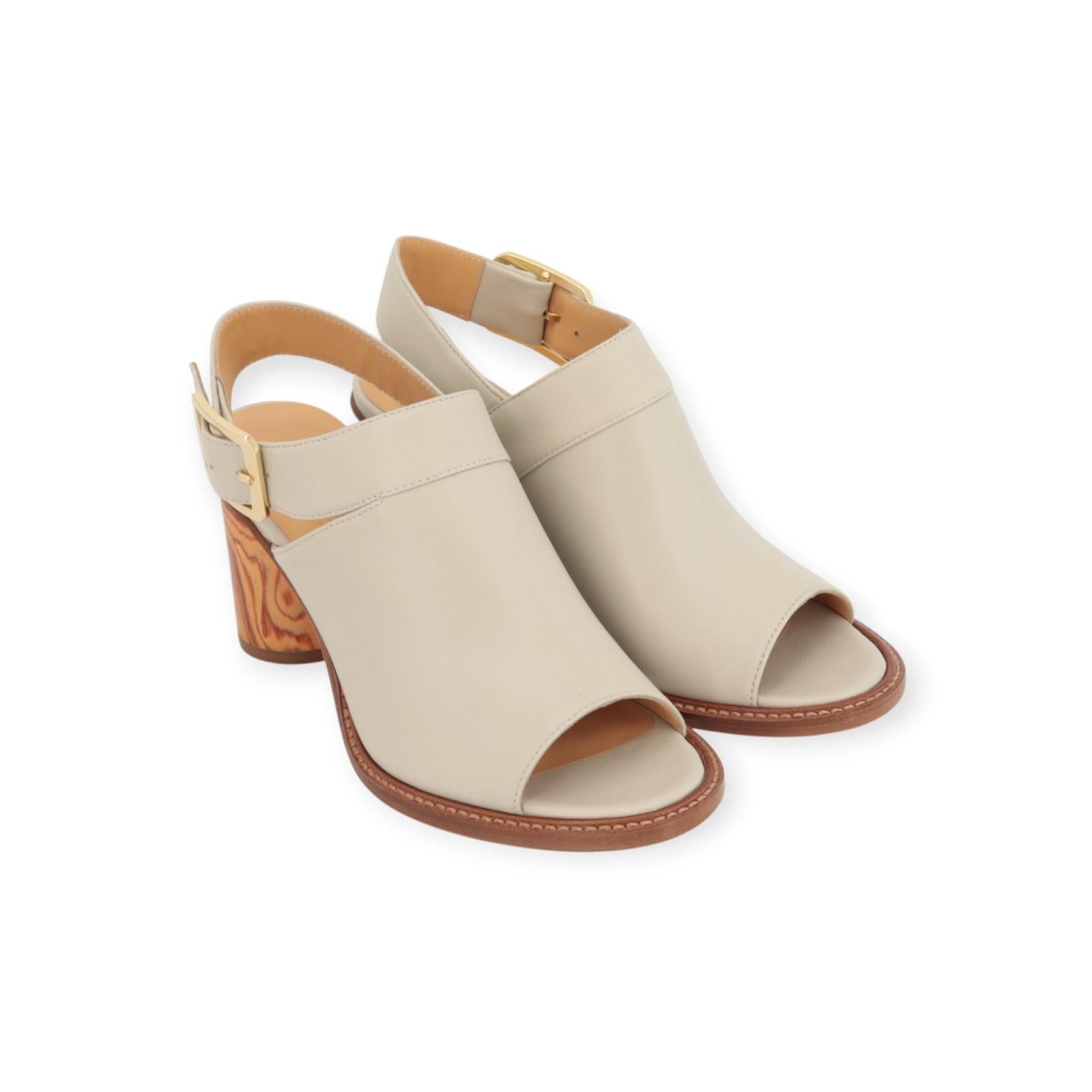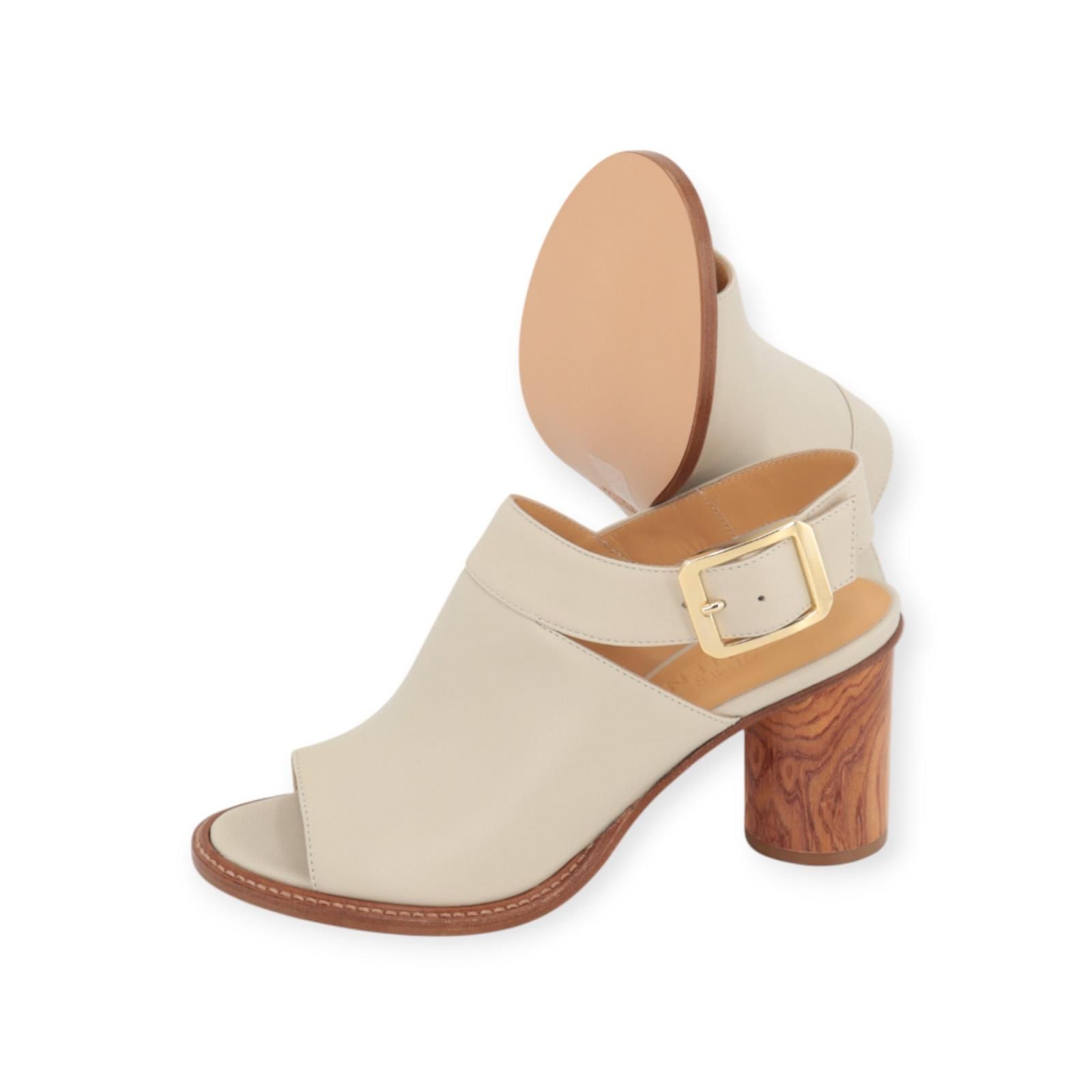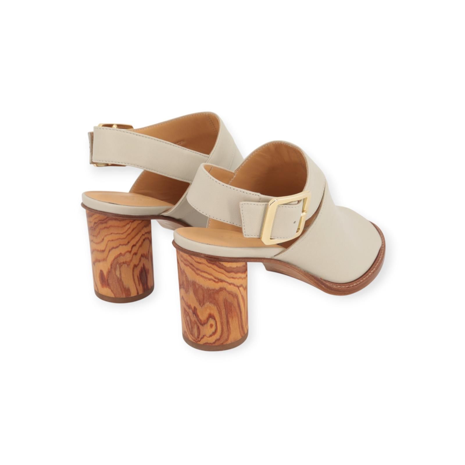 Sandaal Eveline van Atelier Content voor dames. Deze sandaal is in zacht off wit geitenleer. Heeft een band die de volledige wreef hoog bedekt en afgesloten met een opvallende gouden gespsluiting rond de enkel. Is op een mooie blokhak van 7cm hoog bekleed met fineer iepenhout met een dun leren buitenzool. Dit model is zeer elegant en past normaal qua maat, kies je gebruikelijke maat.