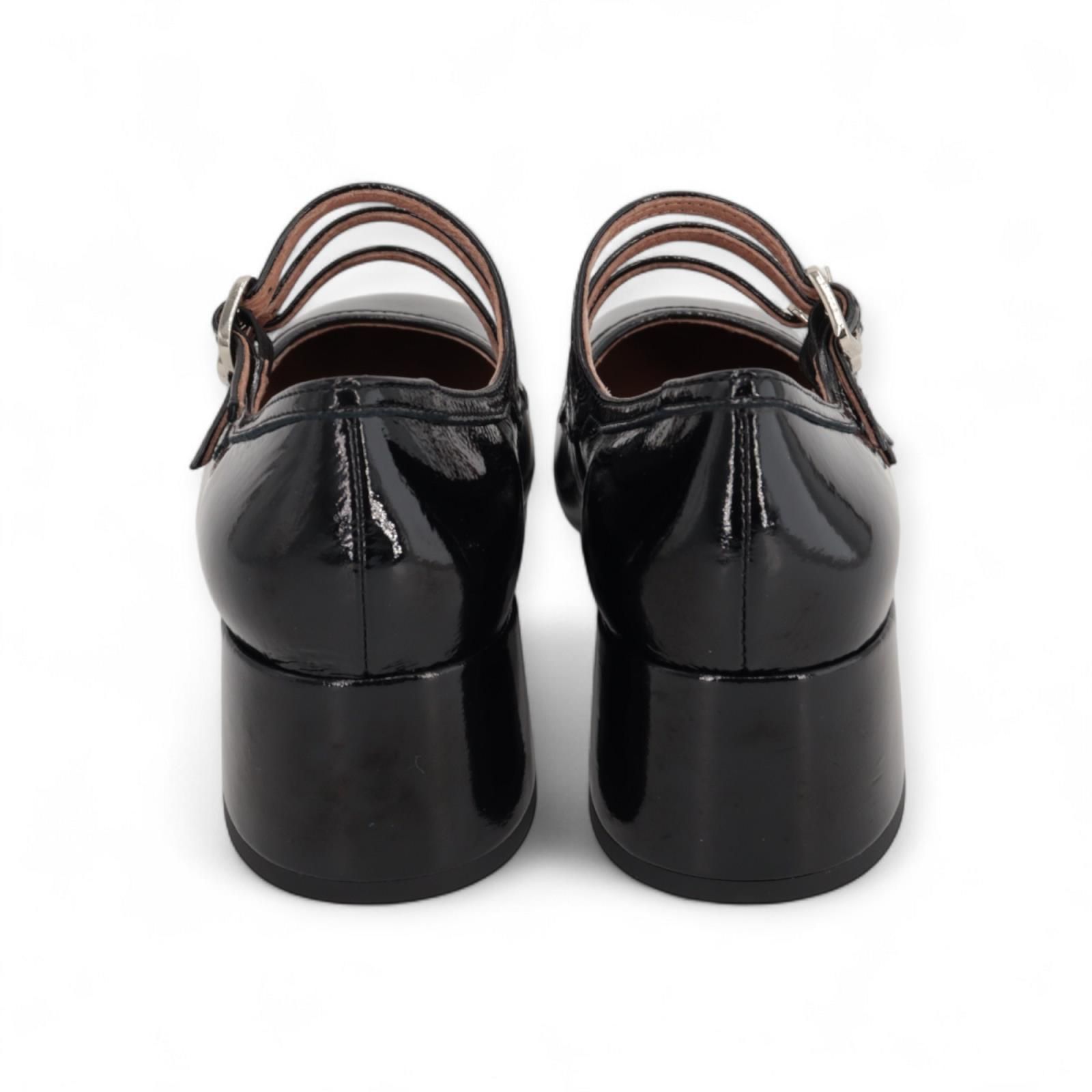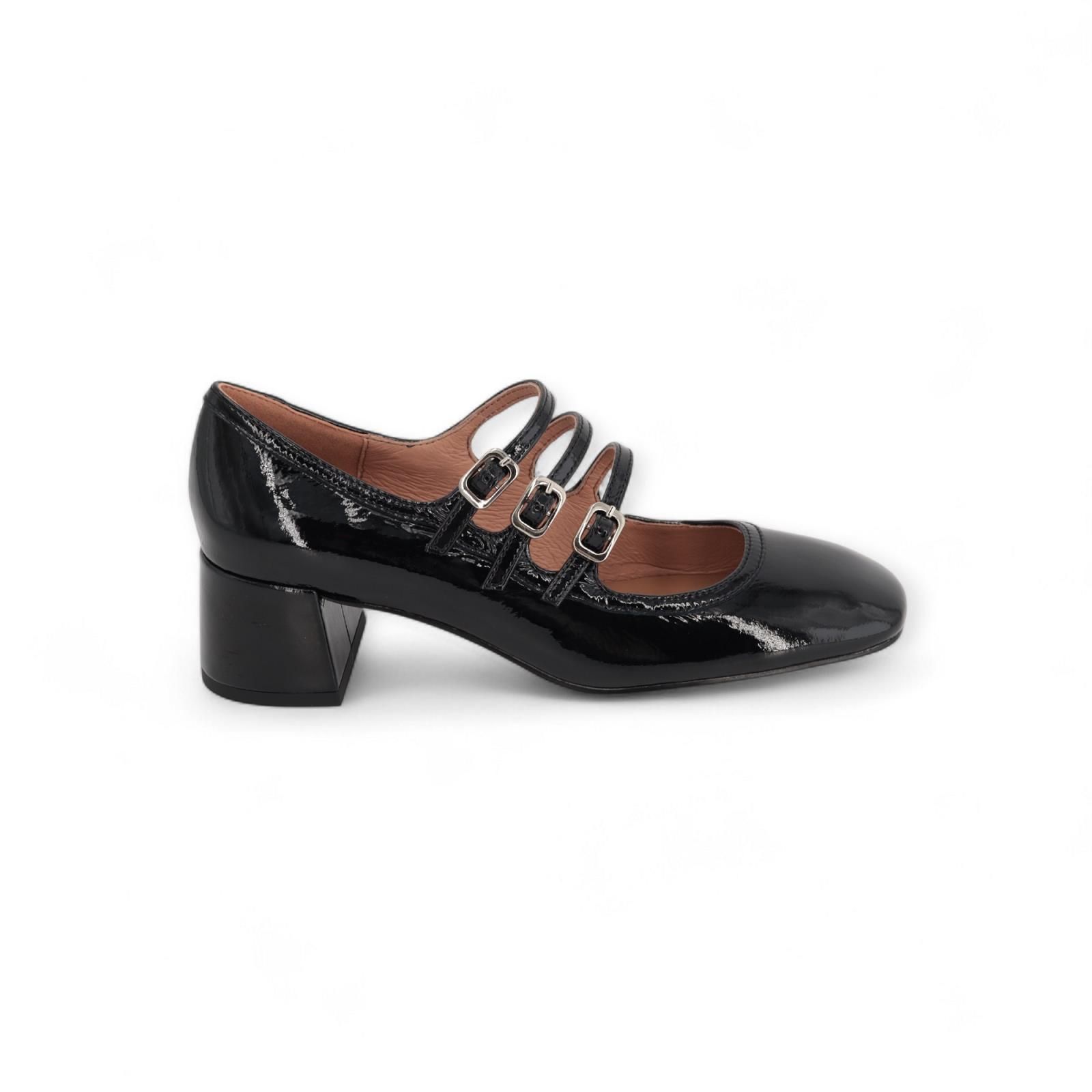 Pump van Bibi Lou voor dames. Deze pump is in zwart lakleer met een ver uitgesneden carré neus. Heeft 3 bandjes over de wreef met een zilveren gespsluiting. Is op een blokhakje van 5-5.5cm hoog met een antislipzool.