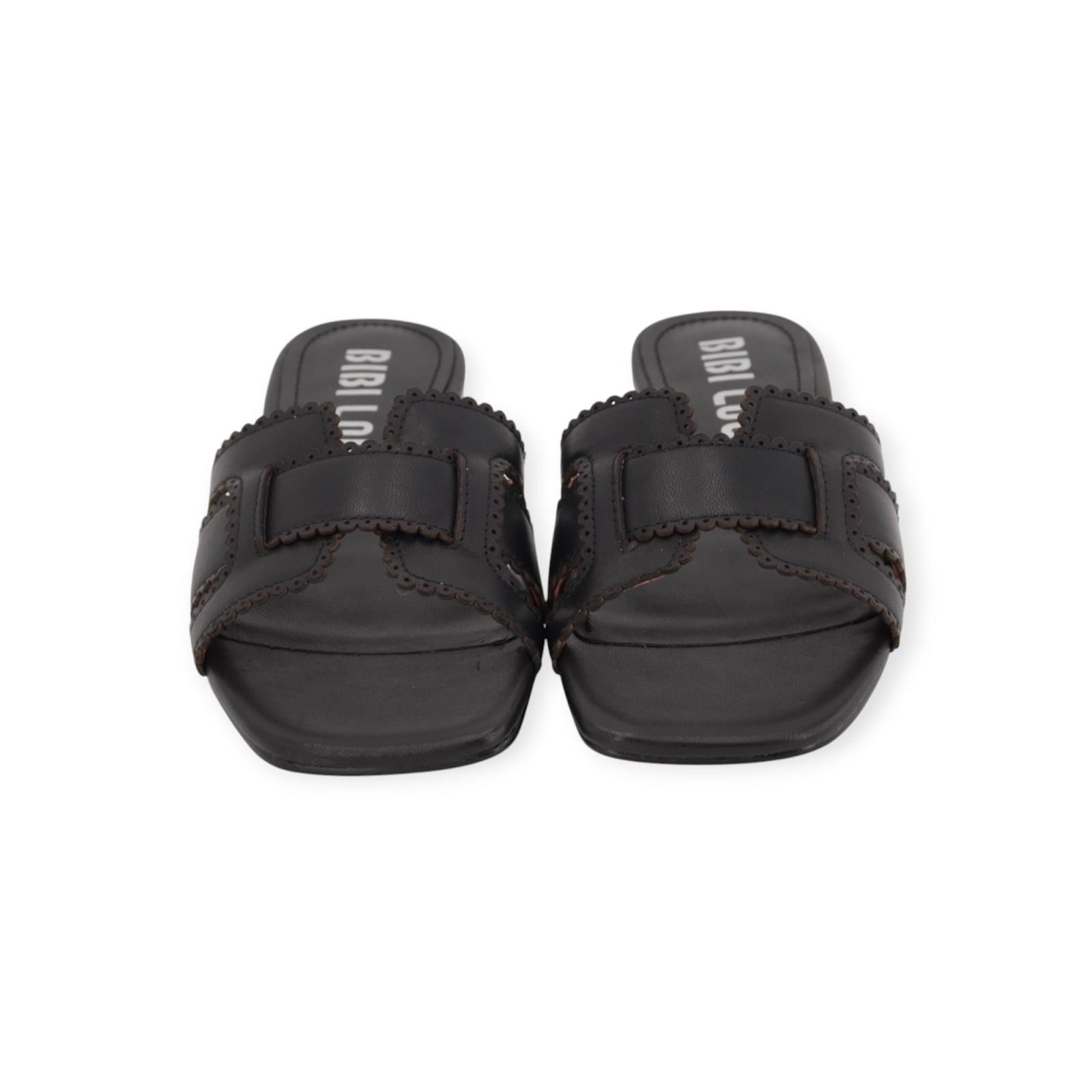 Slipper Holly Flat van Bibi Lou voor dames. Dit elegant muiltje is in zwart leer. Heeft een carré neus met gevlochten leren banden over de wreef die mooi afgewerkt zijn met gekartelde randjes. Heeft een antislip buitenzool.