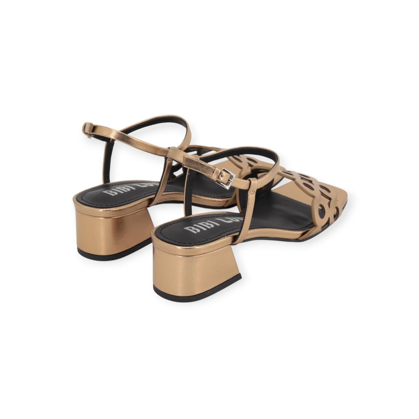 Sandaal Oribu van Bibi Lou voor dames. Deze elegante sandaal is in brons shining leer. Heeft een brede band met cirkelvormige leren details op de wreef. Is met een carré top en een aangenaam blokhakje van 4cm hoog. Is afgesloten met een bandje rond de enkel met gespsluiting.
