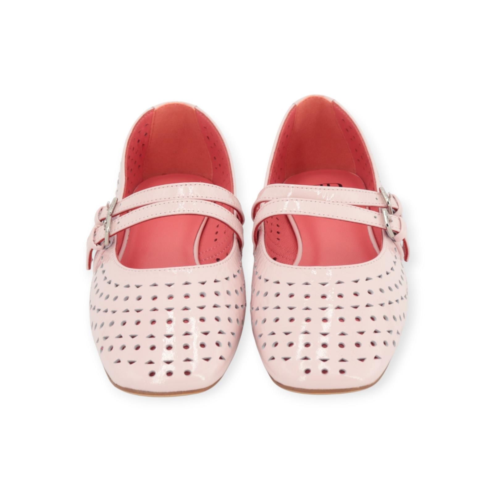 Ballerina Naples van BlackRose voor dames. Deze ballerina is in roze geperforeerd lakleer. Heeft een lichte carré neus met 2 bandjes en gespsluiting over de wreef. De buitenzool is in leer met een antislipzooltje en voelt zeer soepel aan.
