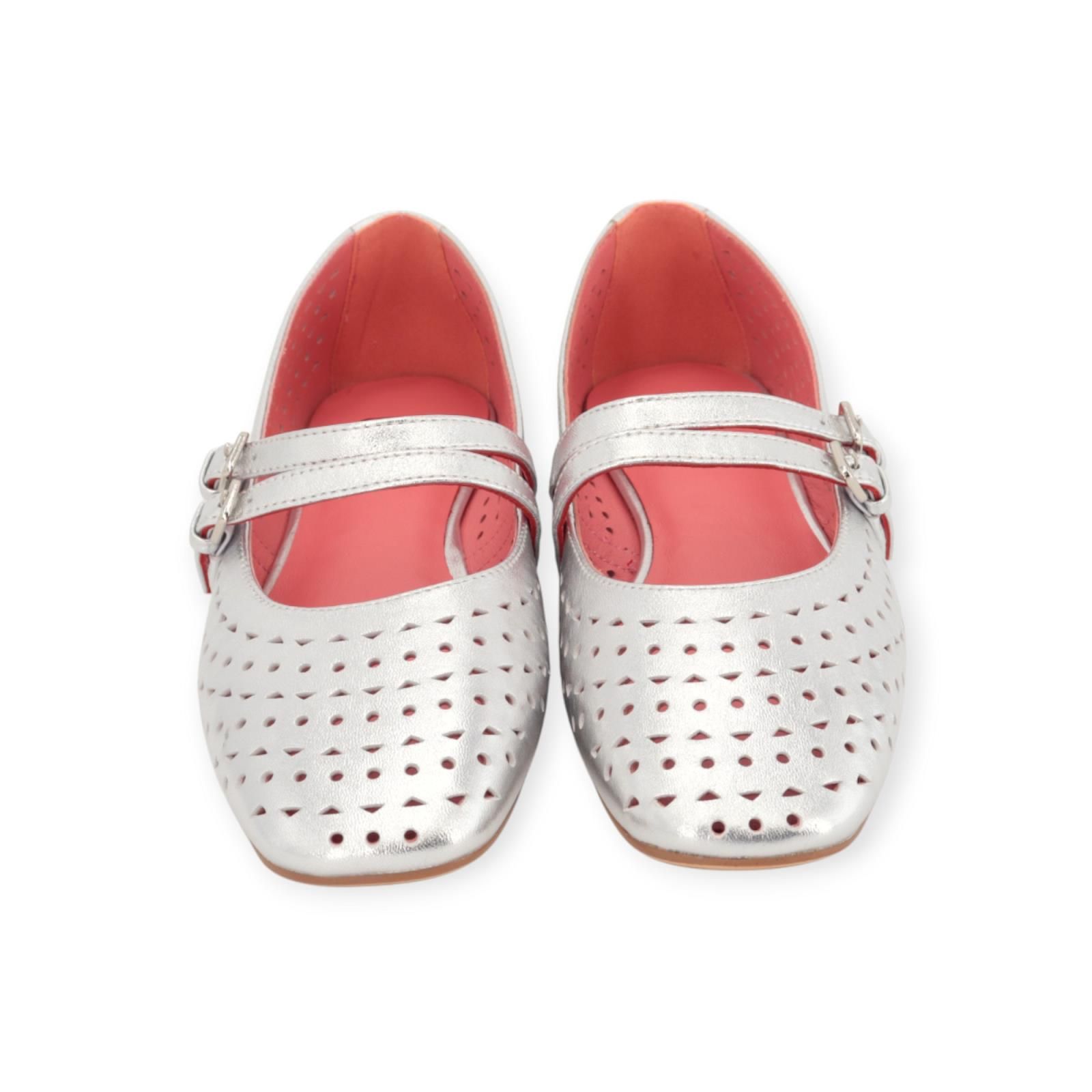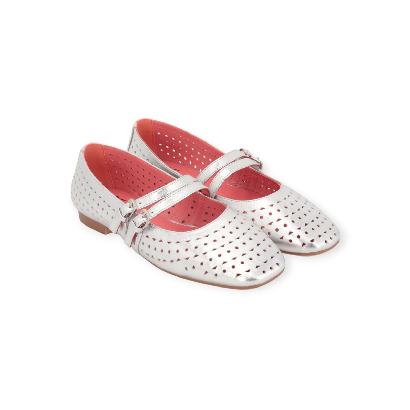 Ballerina Naples van BlackRose voor dames. Deze ballerina is in zilver geperforeerd lakleer. Heeft een lichte carré neus met 2 bandjes en gespsluiting over de wreef. De buitenzool is in leer met een antislipzooltje en voelt zeer soepel aan.