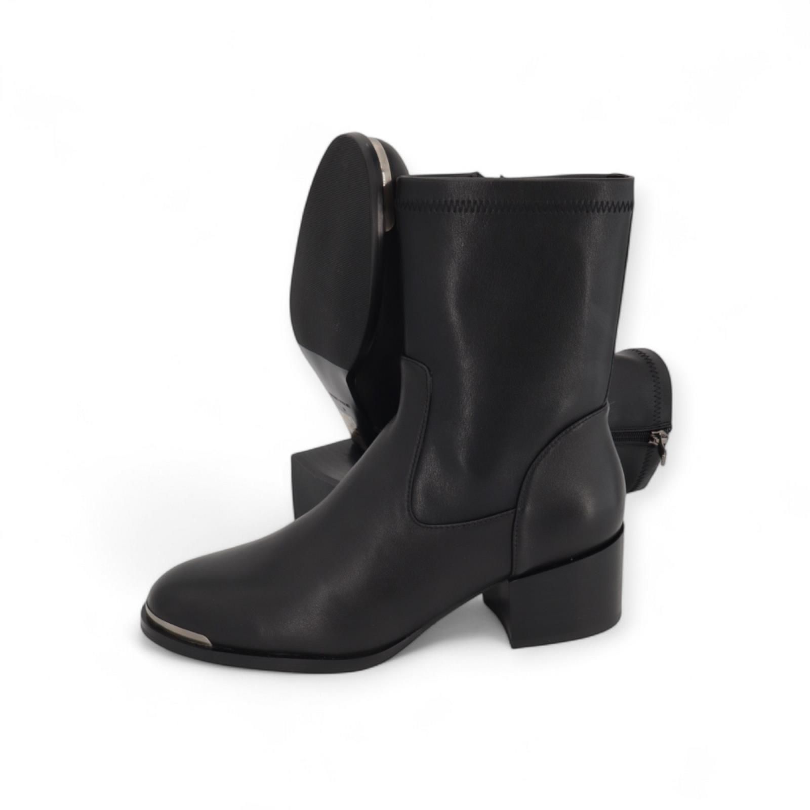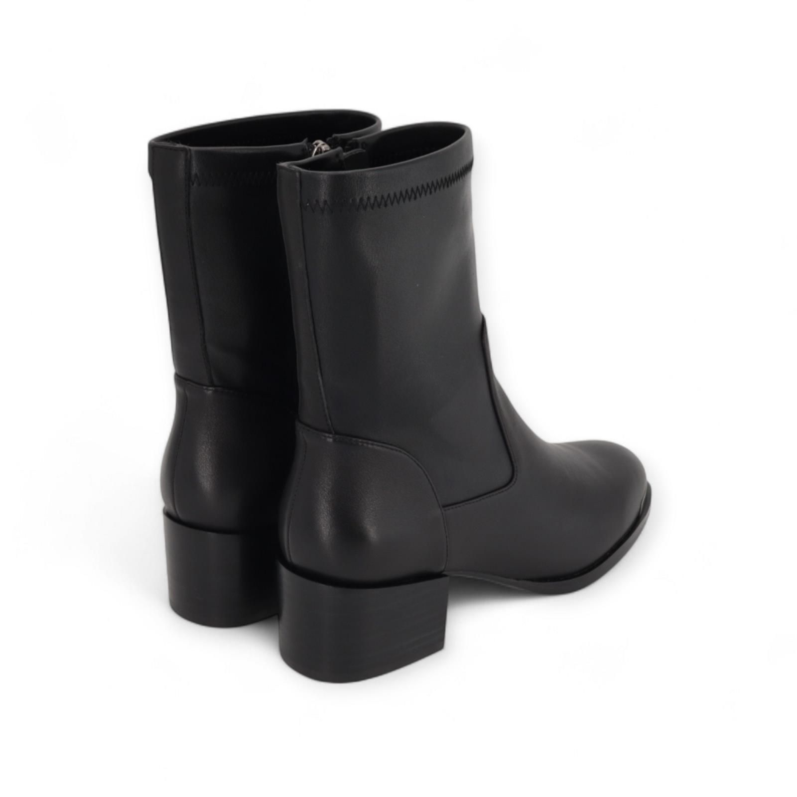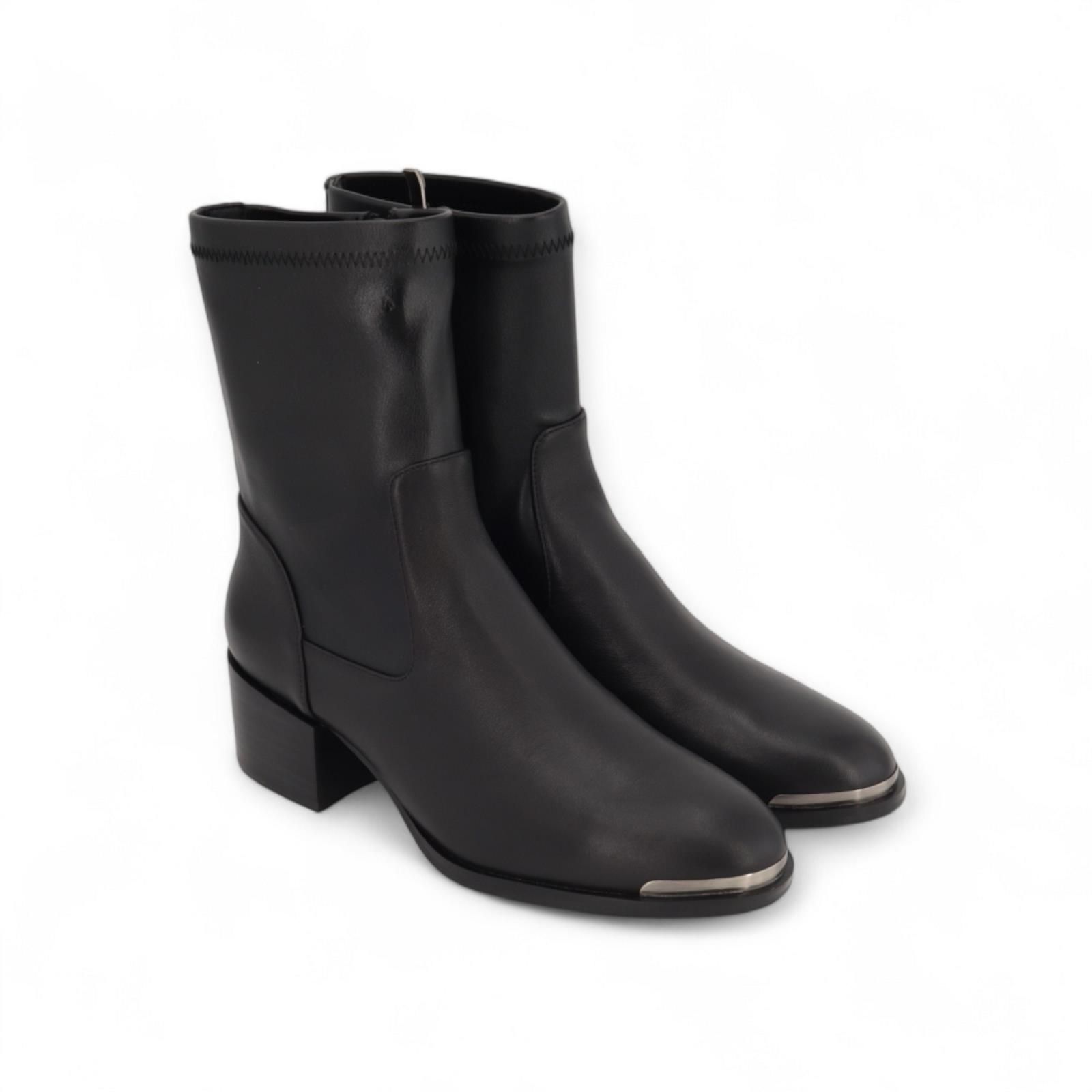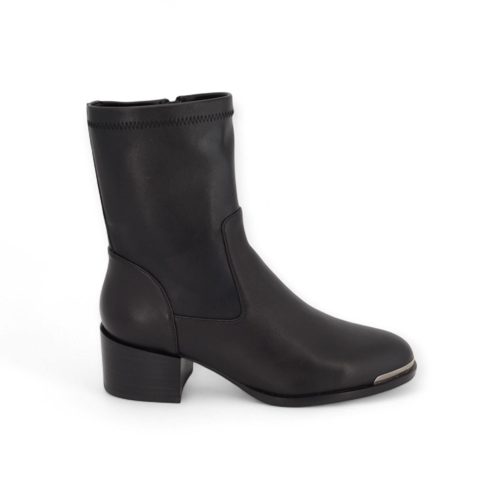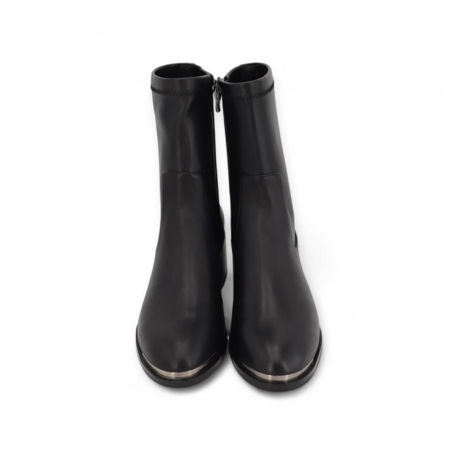 Enkellaars BM5301X van Bruno Premi voor dames. Deze enkellaars is in zwart leer. Mooi afgewerkt met een ronde neus met zilver detail rond de zool vooraan. Is met een ritssluiting aan de zijkant en heeft een blokhakje van 5cm hoog.