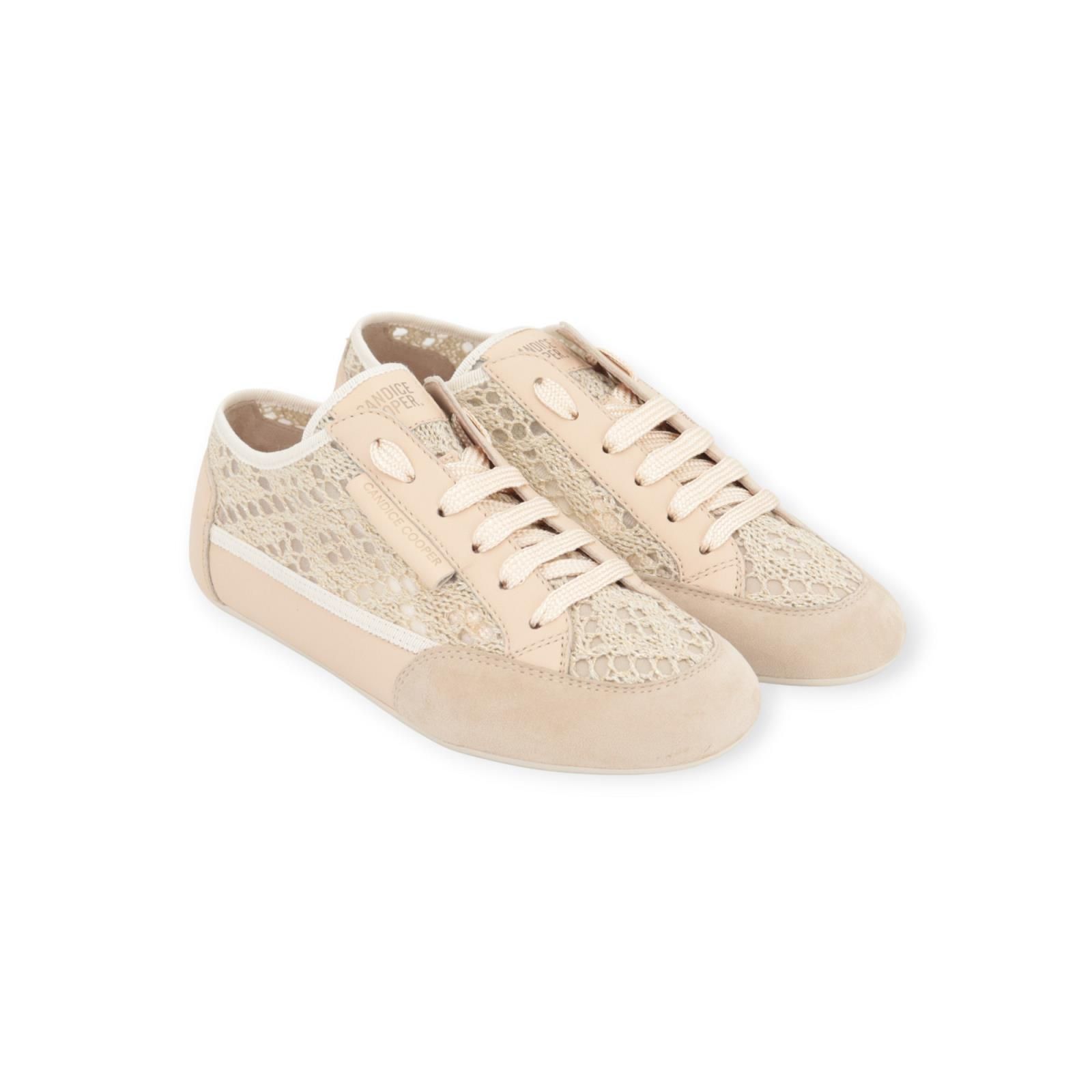 Sneaker Dafne 2 van Candice Cooper voor dames. Deze lage sneaker is in zacht beige/nude leer met zand suède aan de voorvoet. Mooi afgewerkt met kant aan de zijkant. Is een zeer zacht en soepel model. De binnenzool is uitneembaar.