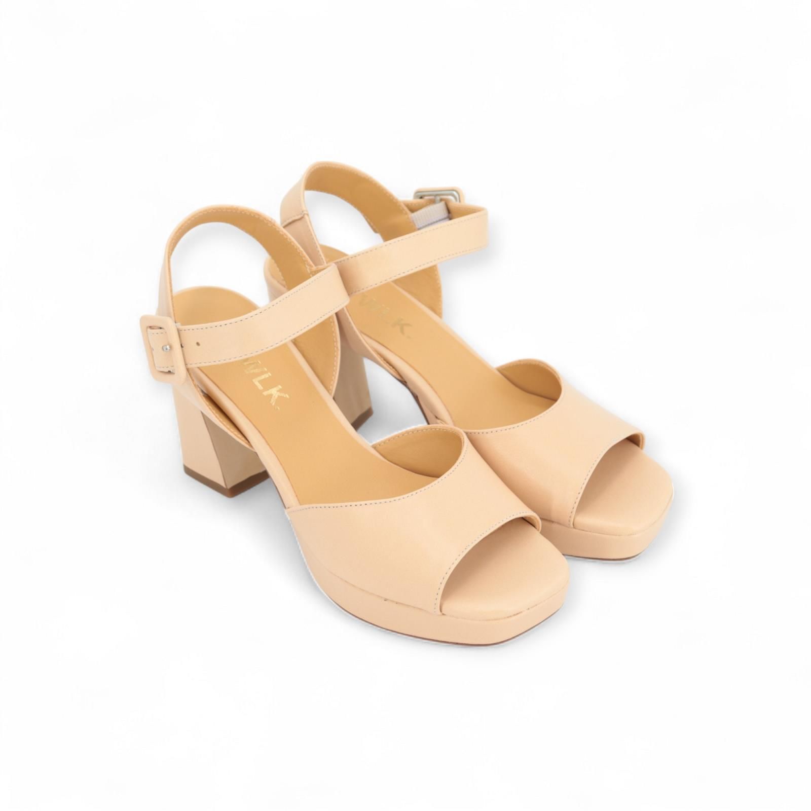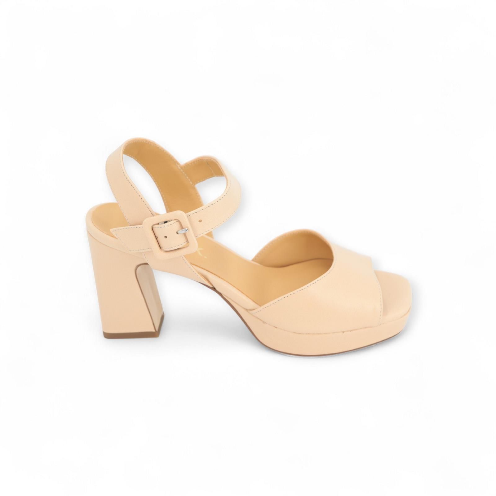 Amandine Catwalk sandaal voor dames. Dit elegant sandaaltje in volledig leder beige is met een carré top. Achteraan aan de hiel vast met een gespsluiting rond de enkel. Deze hak is +/- 5cm hoog.