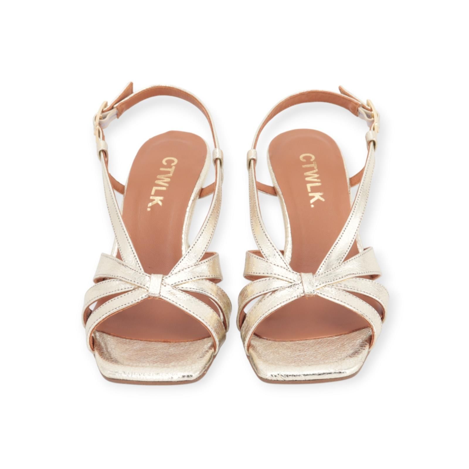Sandaal Rianne F8 van CTWLK voor dames. Deze geklede sandaal is in shining craquelé goud. Valt mooi op door de bandjes over de wreef die samenkomen in het midden in een stervormig detail. Deze sandaal omlijst mooi de voet met een gespsluiting aan de enkel. Is met een carré top en een elegant fijn hakje van 6-6,5cm hoog. De buitenzool is in leer.