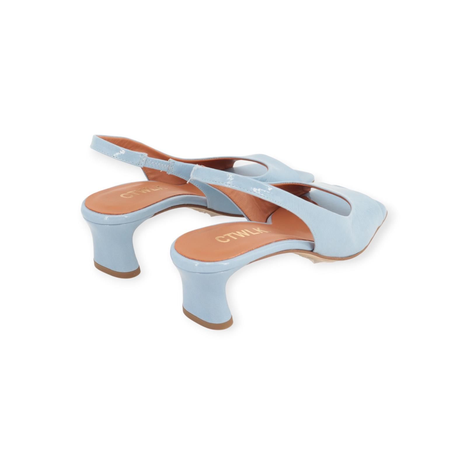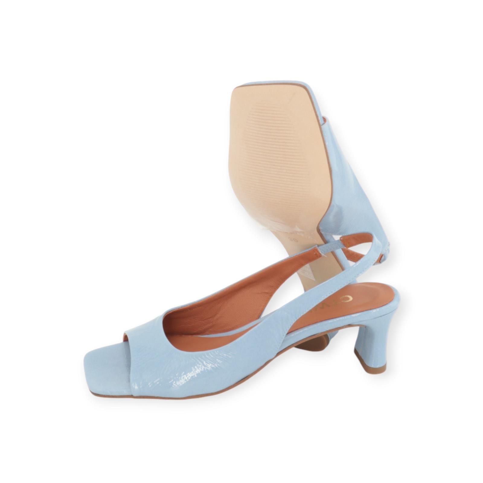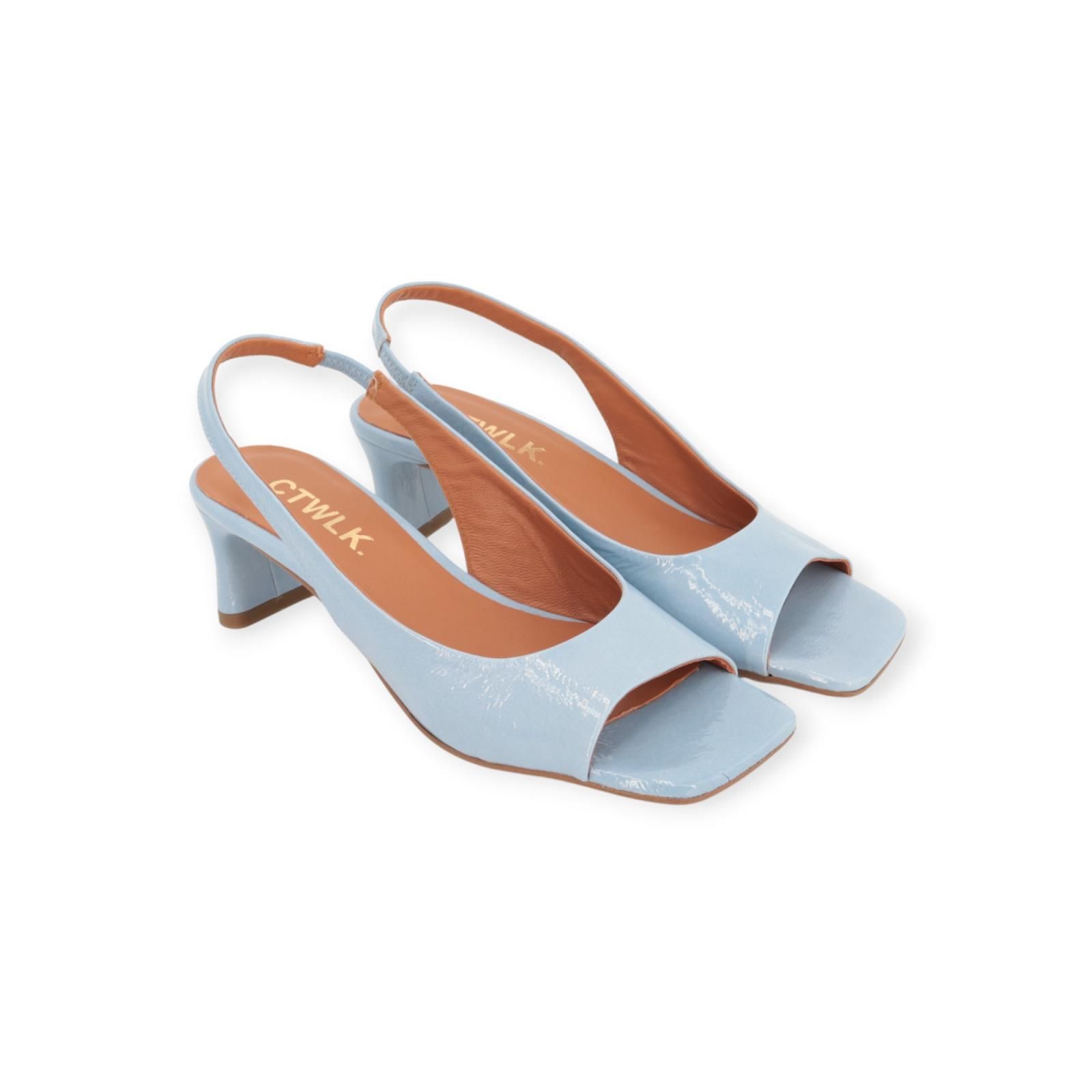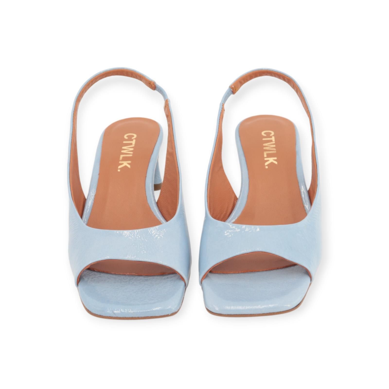 Sandaal Ronny G7 van CTWLK voor dames. Deze geklede sandaal is in lichtblauw lakleer. Is een diep uitgesneden model met een carré top en een hakje van 4cm hoog. Is afgesloten met een elastiek aan de enkel. De buitenzool is in leer.
