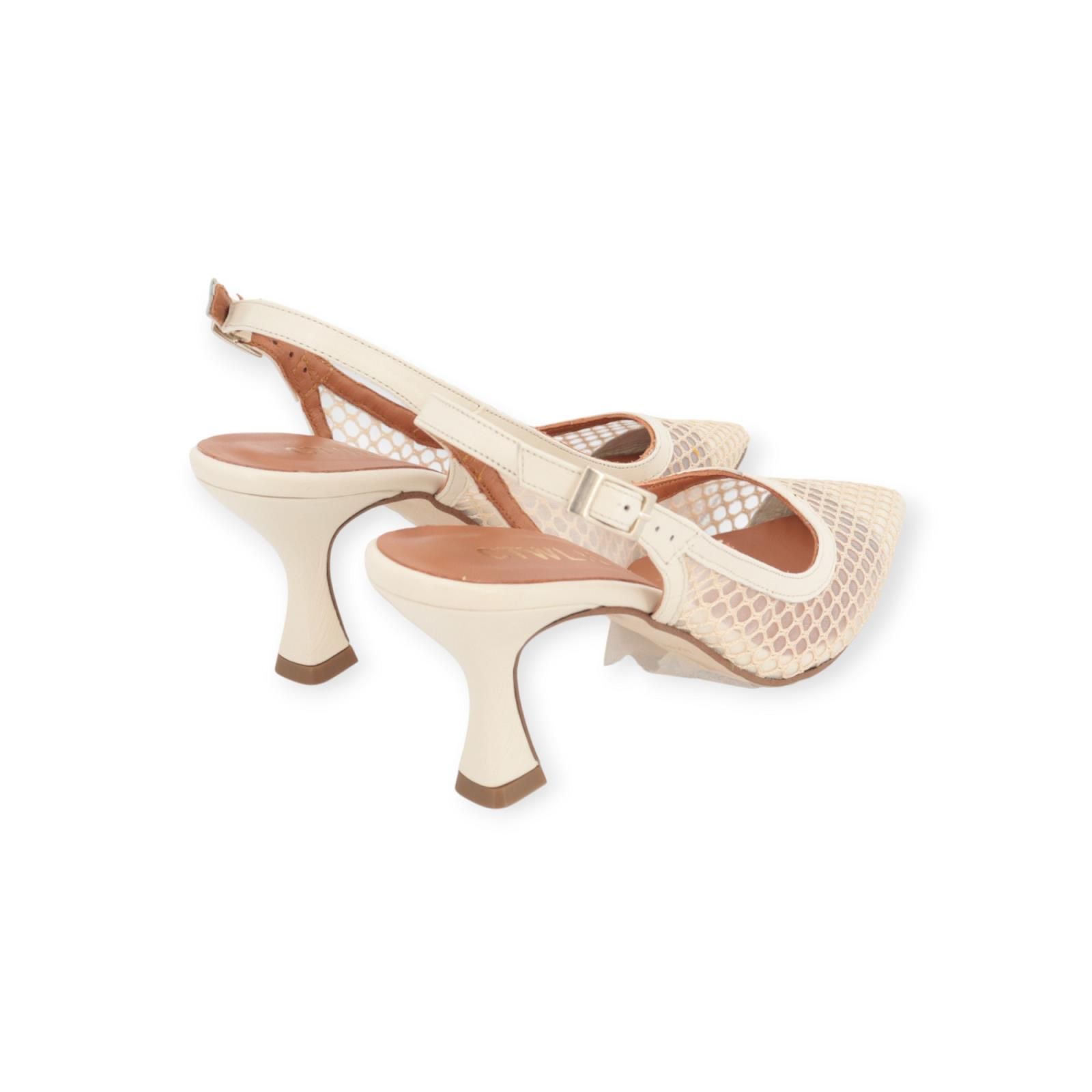 Pump Rubi Q8 van CTWLK voor dames. Deze elegante slingback model is in off wit leer met geperforeerde mesh. Heeft een scherpe neus en een elegant fijn hakje van 6,5cm hoog. Heeft een open hieltje en een gespsluiting rond de enkel. De buitenzool is in leer.