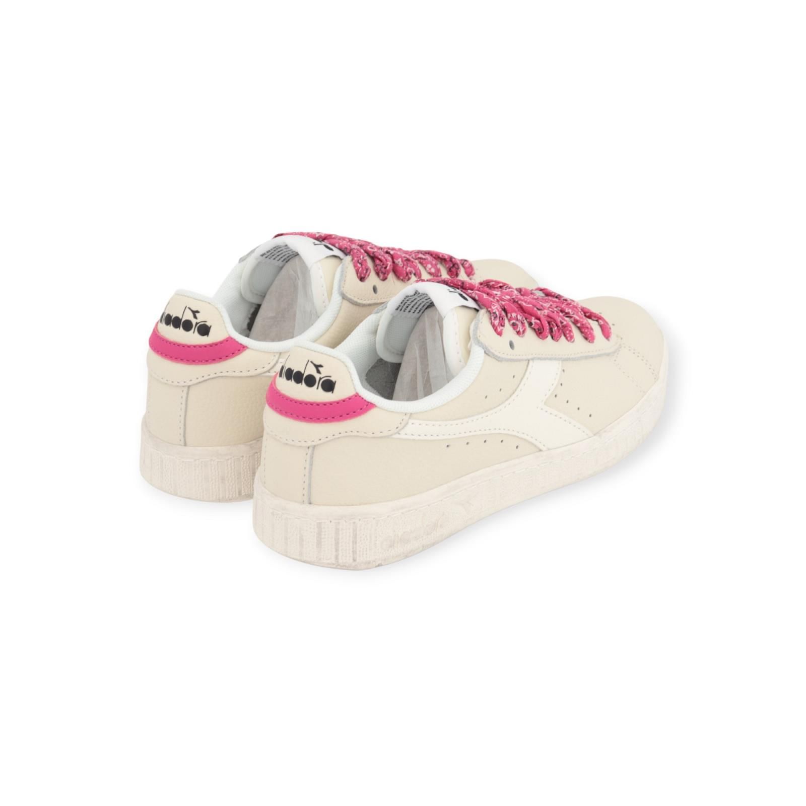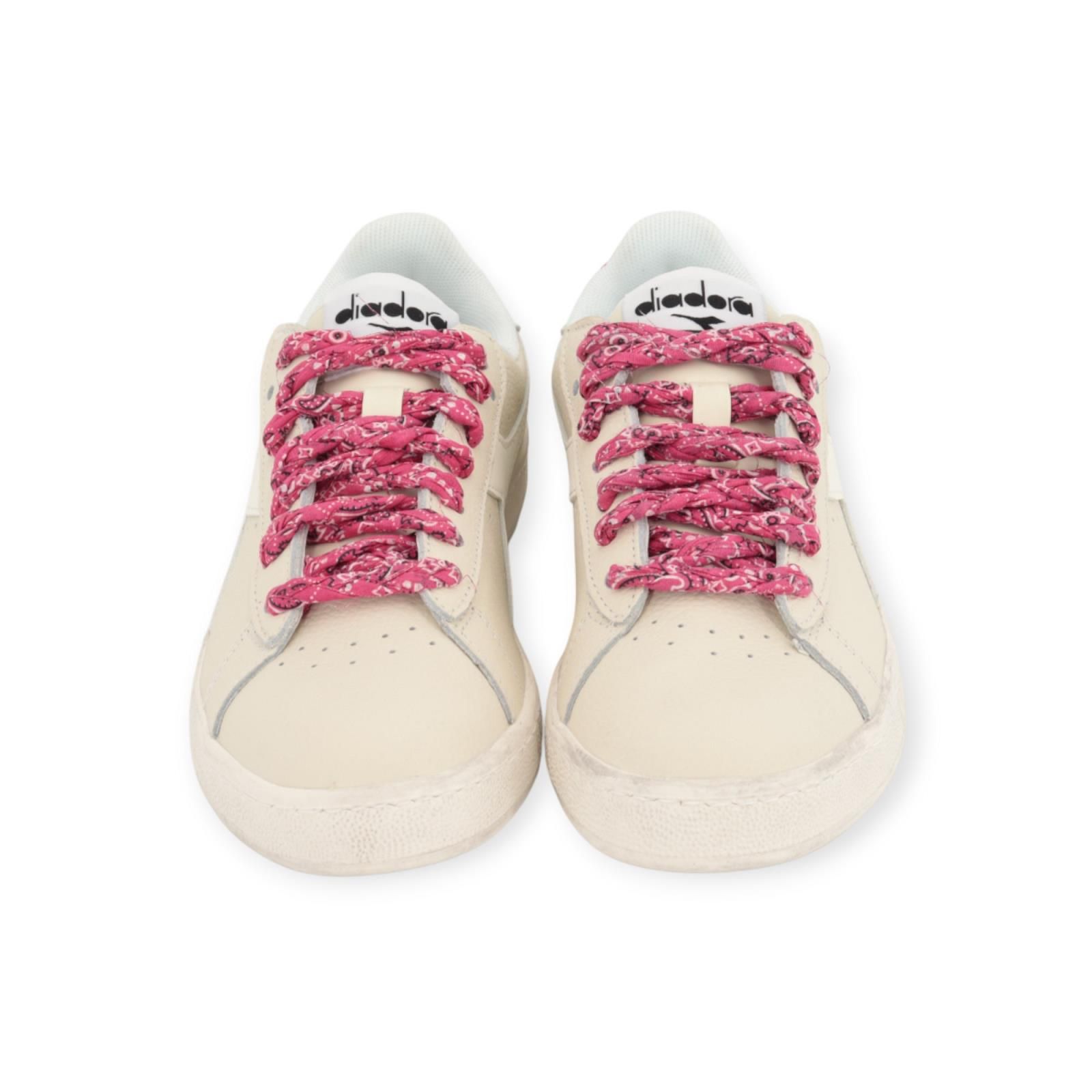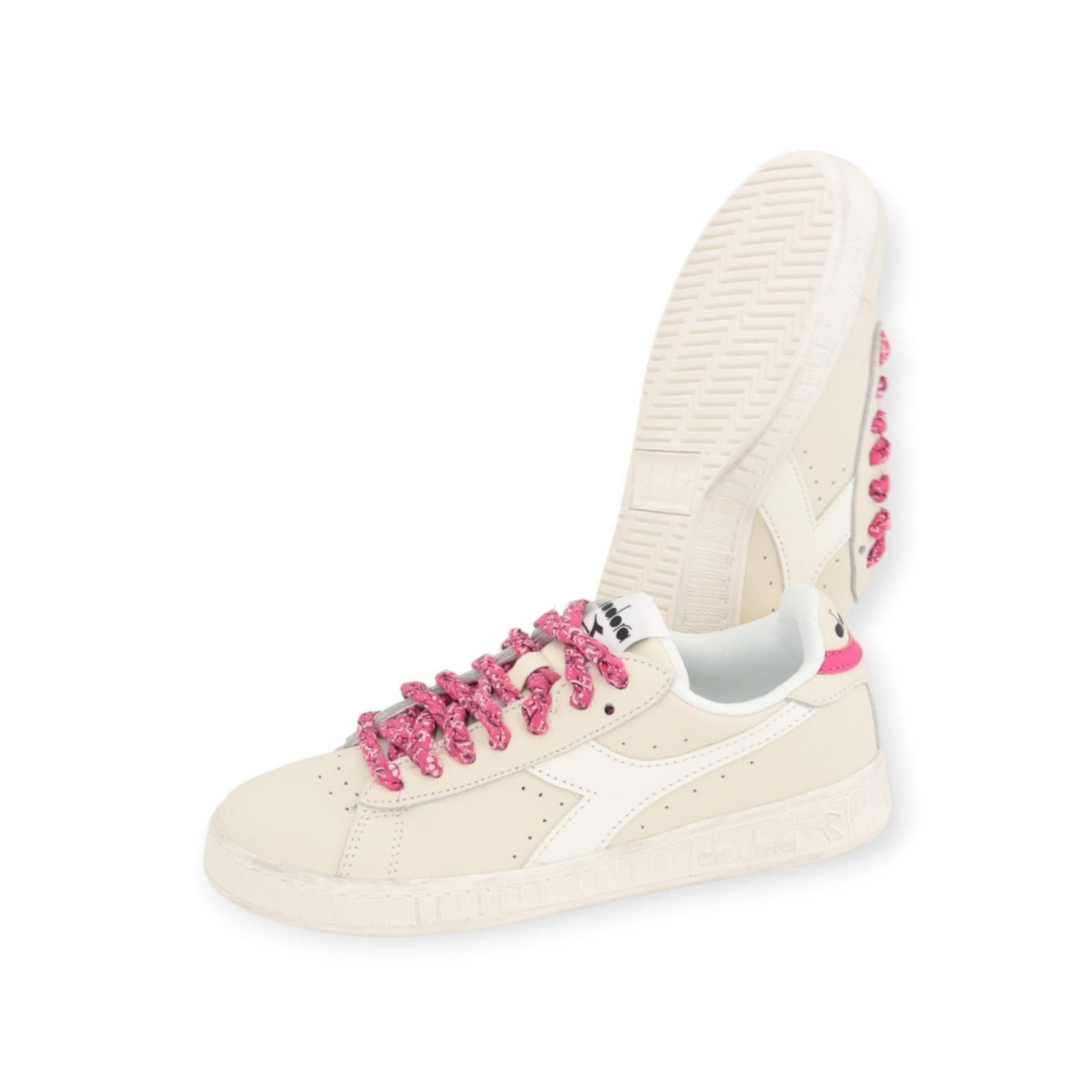 Sneaker Game Low Waxed Paisley voor dames in off wit. Deze Game Low is de lage versie en de populairste stijl aller tijden. Is volledig uitgevoerd off wit leer met aan de zijkant het Diadora patroon in wit leer. De hielflap is afgewerkt met streepje roze eveneens als de veters die in roze ‘Paisley’ patroon zijn: een subtiel motief dat ook op de hiel terugkomt. Een heerlijk zomers kleurtje! Extra witte veters bijgeleverd.
