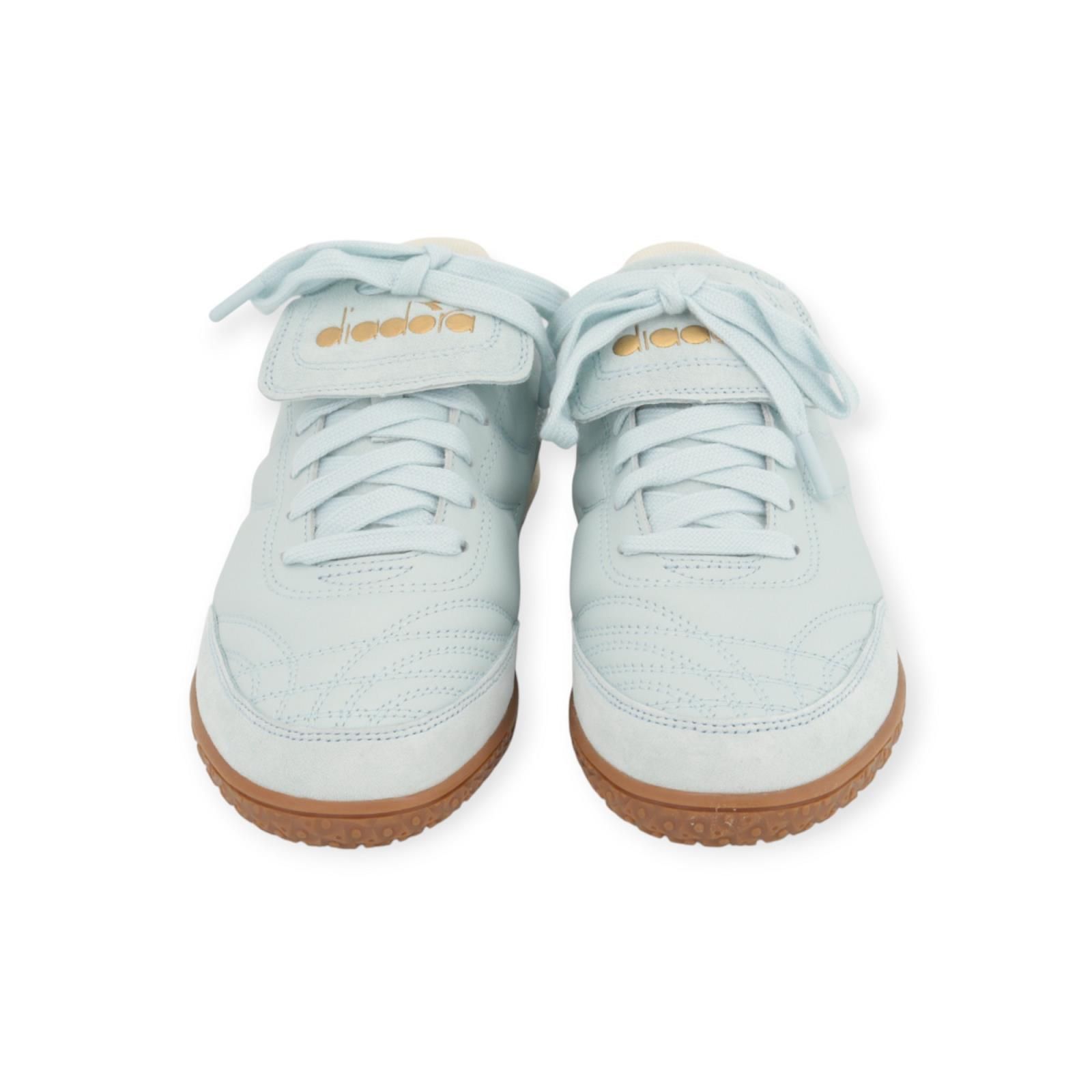Sneaker Gold Indoor Metallic van Diadora voor dames. Deze sneaker is met gedurfd metallic brons en licht blauw leer. Deze versie leent de omklapbare tong van klassieke voetbalschoenen voor een verfijnde, sportieve look. De kenmerkende rubberen zool is rechtstreeks overgenomen uit Diadora's handbalarchieven, is dat ene detail waar je al sinds de jaren '80 dol op bent. De binnenzool is uitneembaar en als extra blauw met camelkleur veters bijgeleverd.