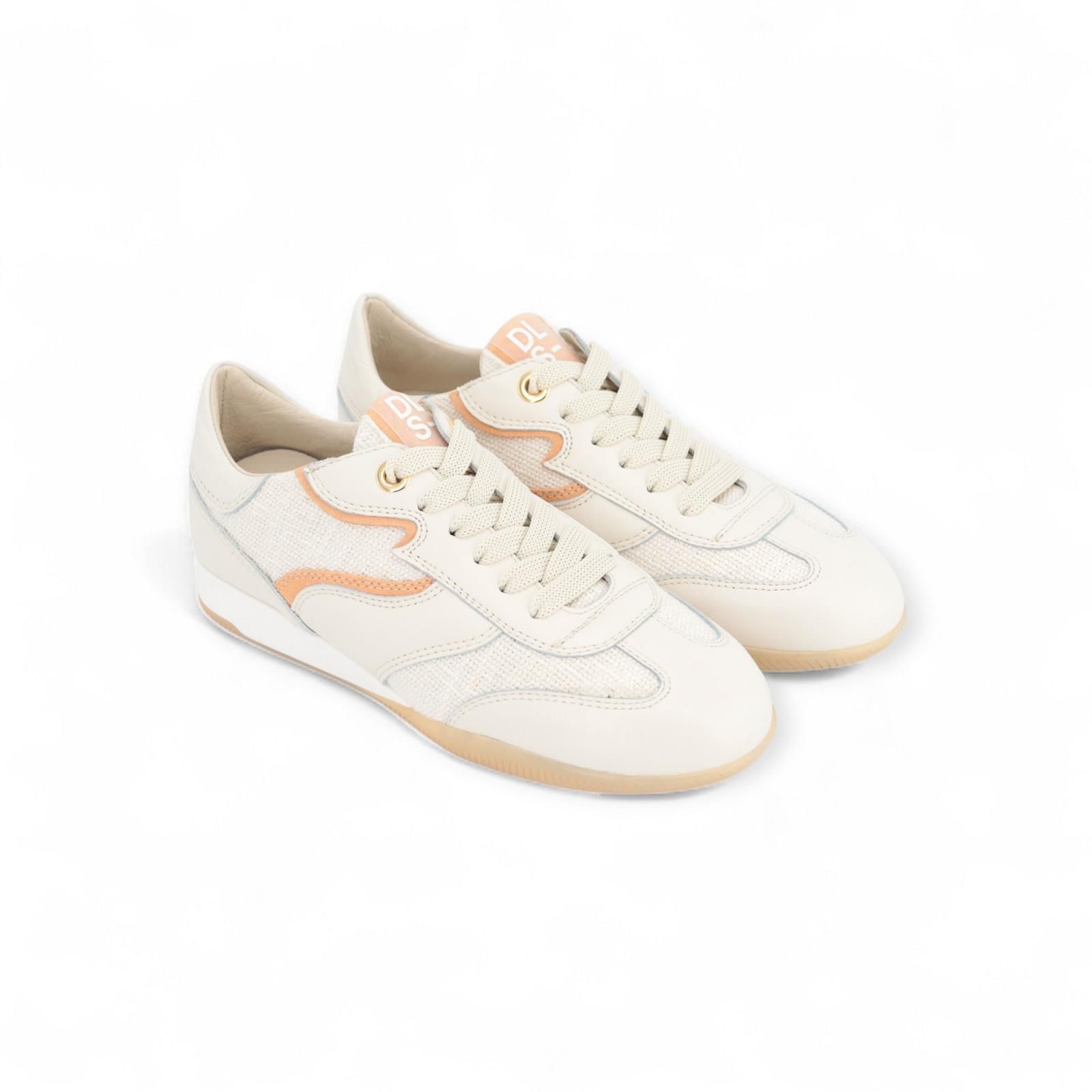 Off wit sneaker 6572 V08 van Dl Sport voor dames is de meer geklede schoen. Afgewerkt met oranje details, in leder en geweven structuren vervaardigt. Beschikt over een goeie rubberen zool die makkelijk plooibaar is. Dit model heeft ook een uitneembare binnenzool.
