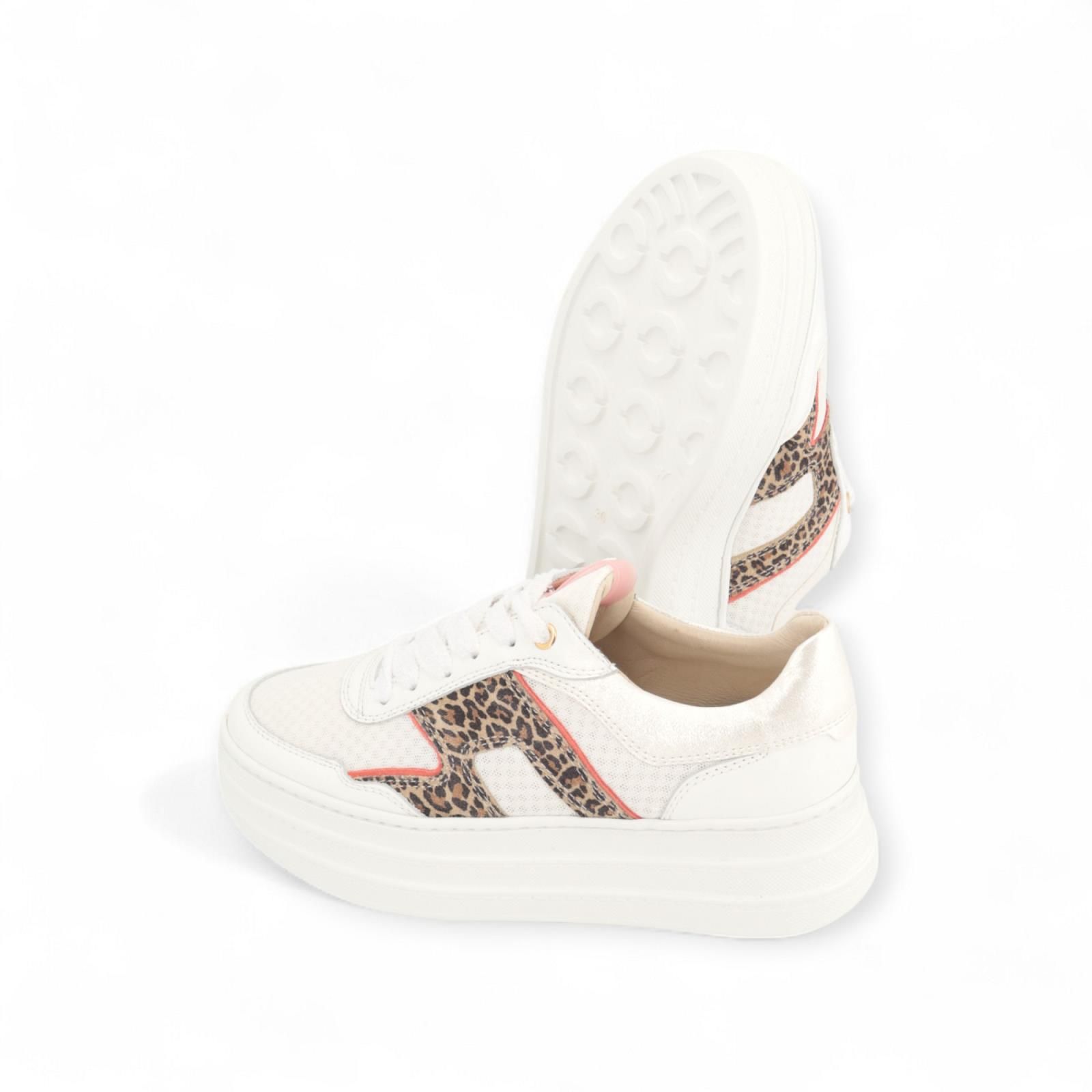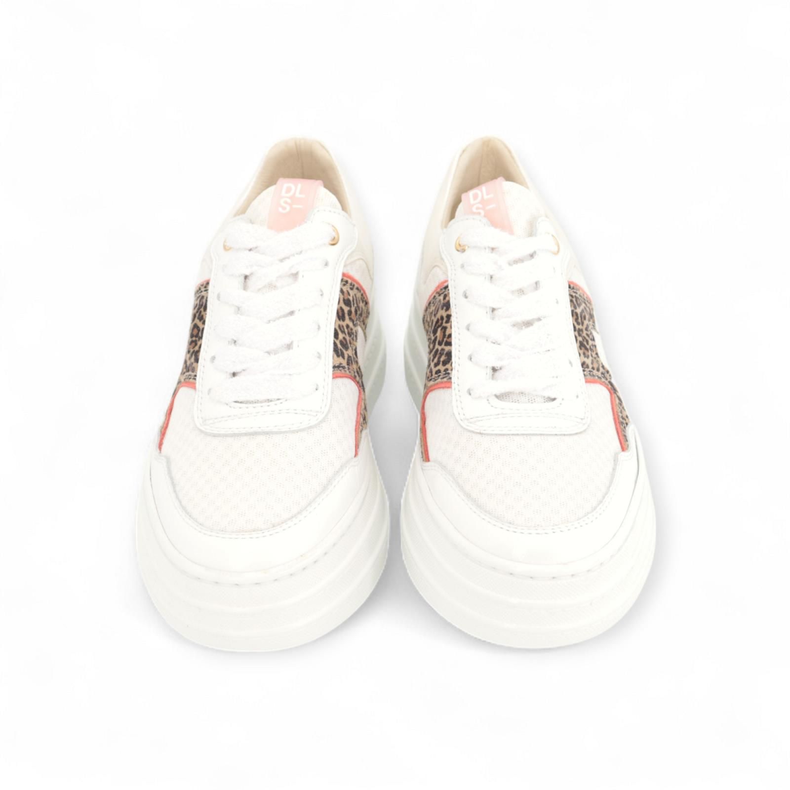 6512 V04 van Dl Sport voor dames is de witte leren sneaker op plateauzool. Afgewerkt met textiel structuren, leopard detail en een roze touch. Deze binnenzool is uitneembaar.