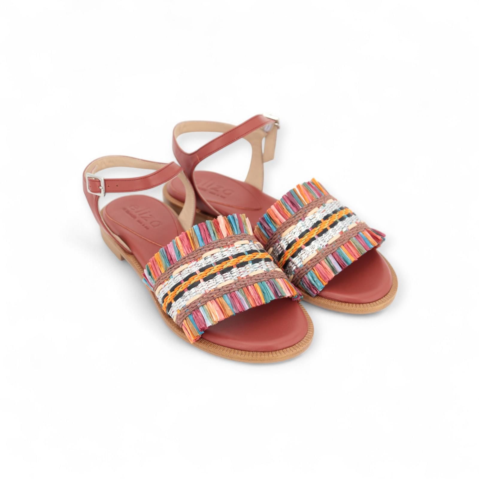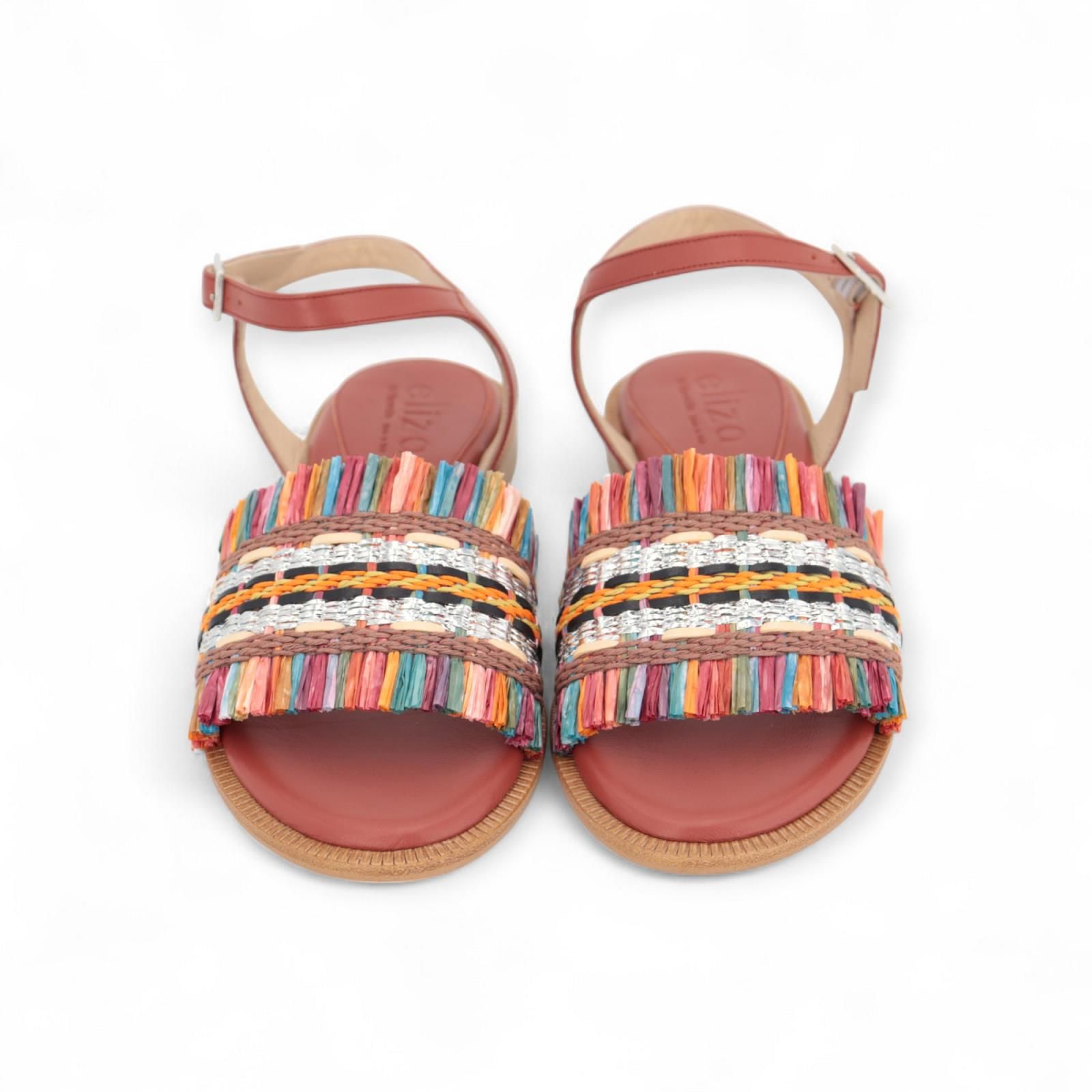 Eliza di venezia dames sandaal in multi kleur met rood. Prachtige rafia in een waaier van kleuren met een bandje rond de enkel. Deze sandaal is volledig in leer afgewerkt. Deze 100% handgemaakte Italiaanse leren schoenen zijn typerend voor haar vormen, materialen en unieke combinaties. Stuk voor stuk schoenen voor de elegante dame.
