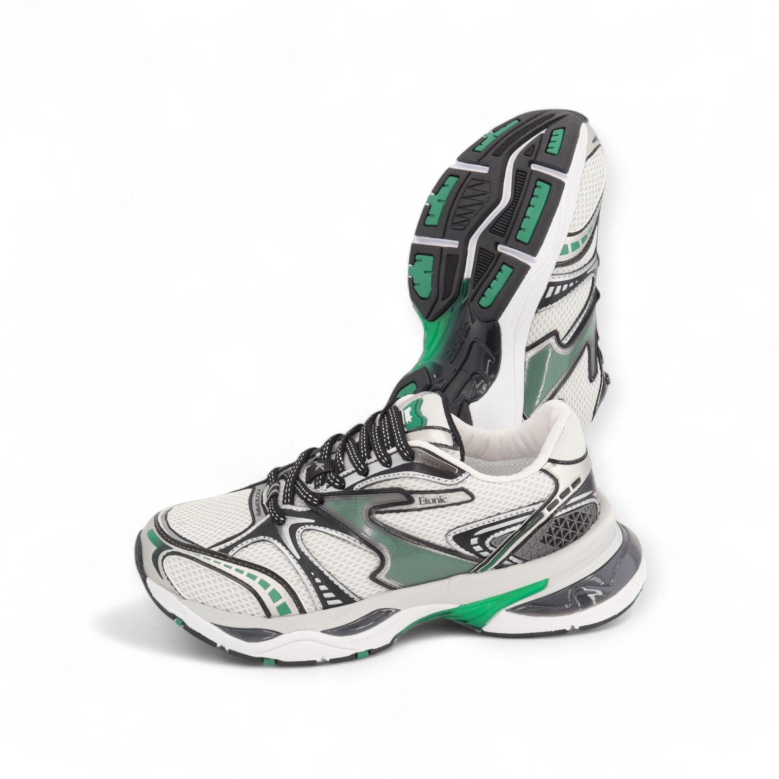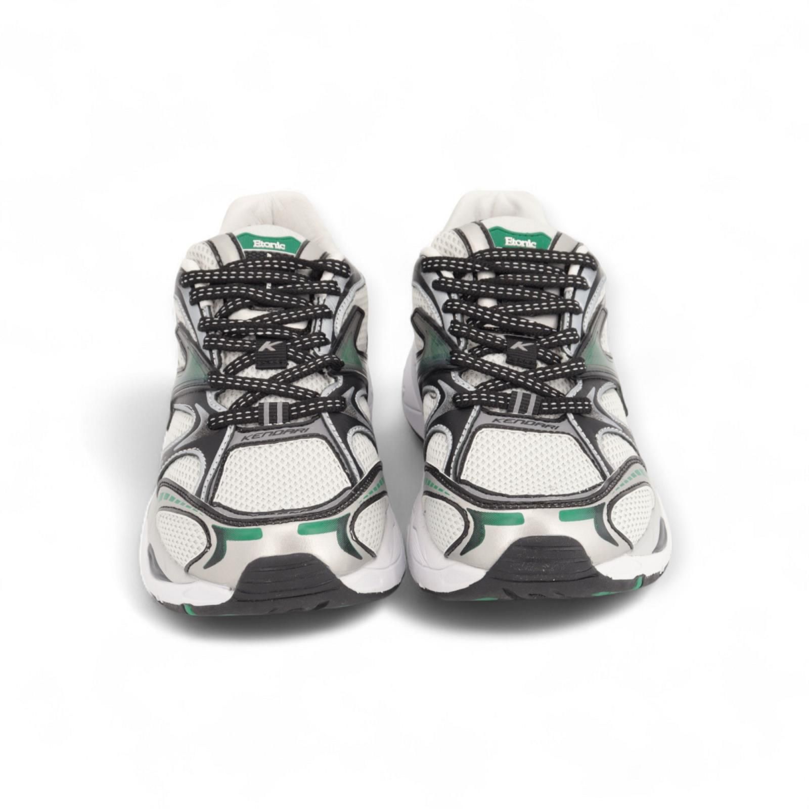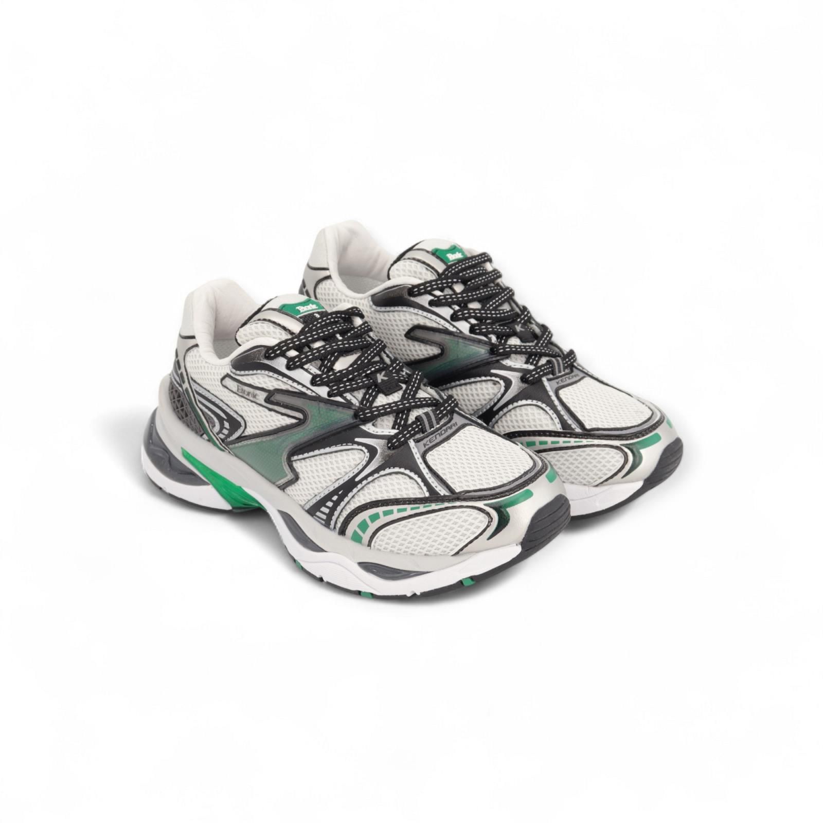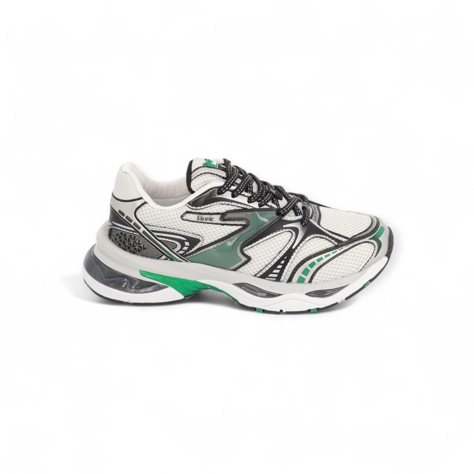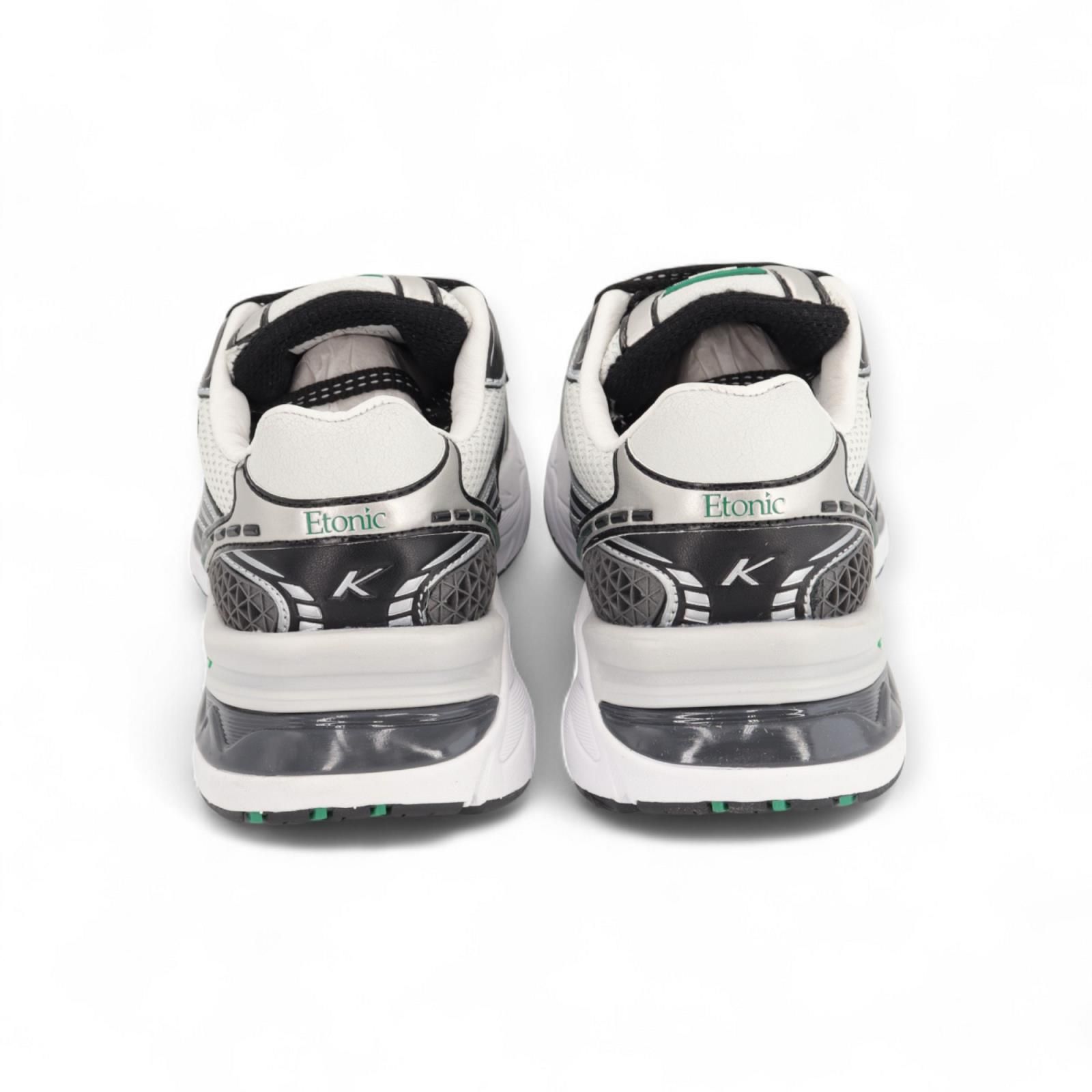 Sneaker Kendari Saturn van Etonic voor dames. Dit runner model is gemaakt uit leder, textiel, en mesh in wit en zwarte tinten met als eyecatcher groene stiksels. De buitenzool is gemaakt uit 3lagen wat voor schokbestendigheid en een trendsettende look zorgt. De binnenzool is uitneembaar.