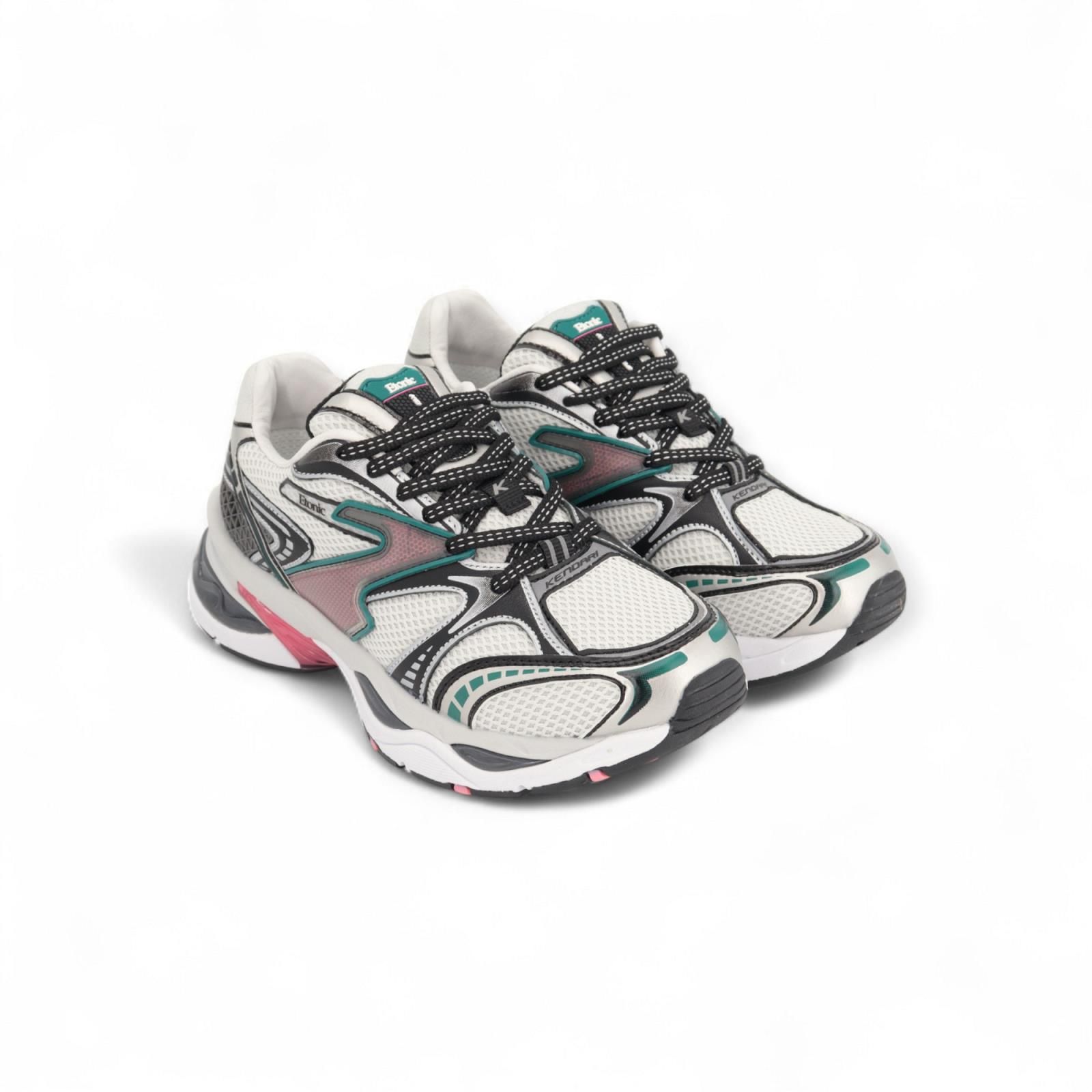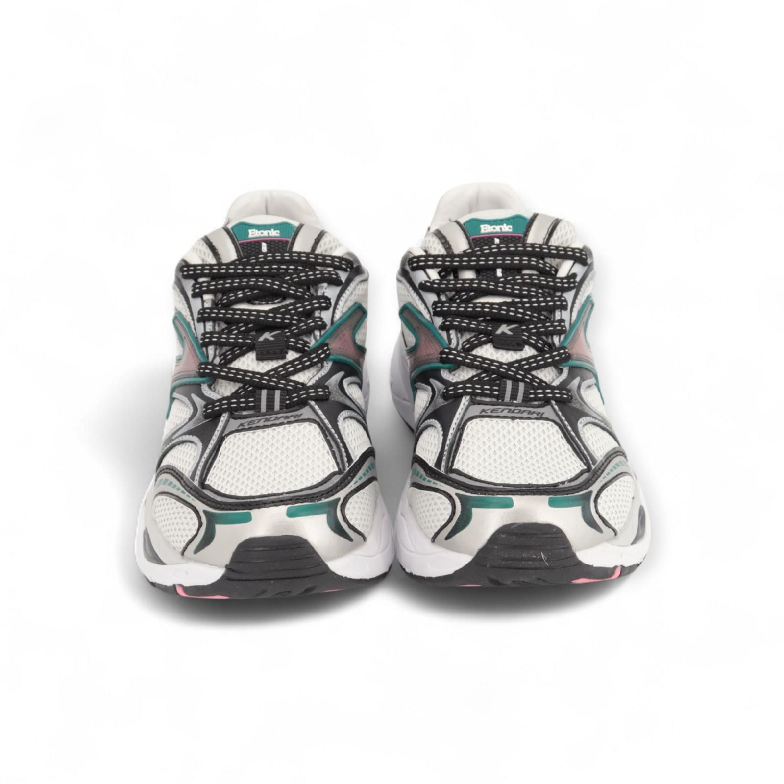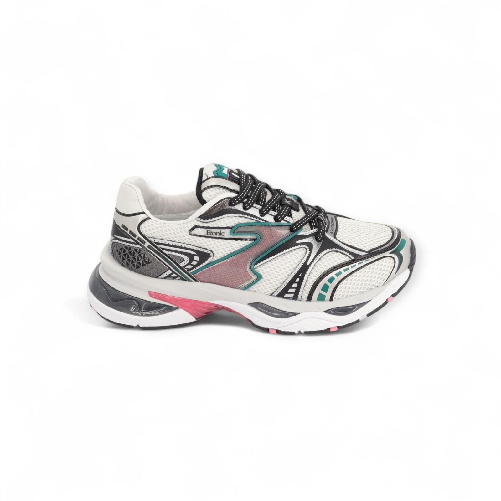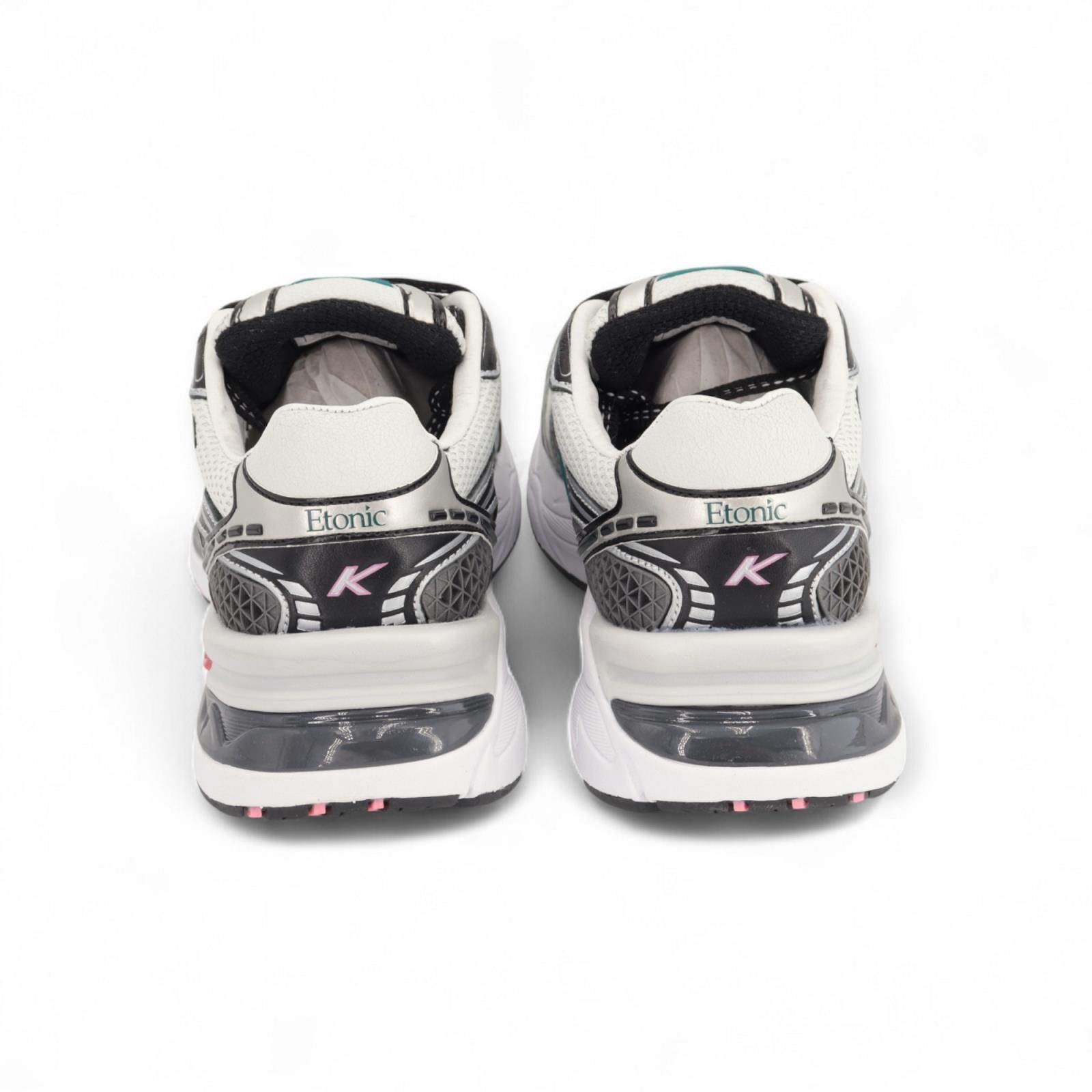 Sneaker Kendari Saturn van Etonic voor dames. Dit runner model is gemaakt uit leder, textiel, en mesh in wit en zwarte tinten met als eyecatcher groene stiksels. De buitenzool is gemaakt uit 3lagen wat voor schokbestendigheid en een trendsettende look zorgt. De binnenzool is uitneembaar.