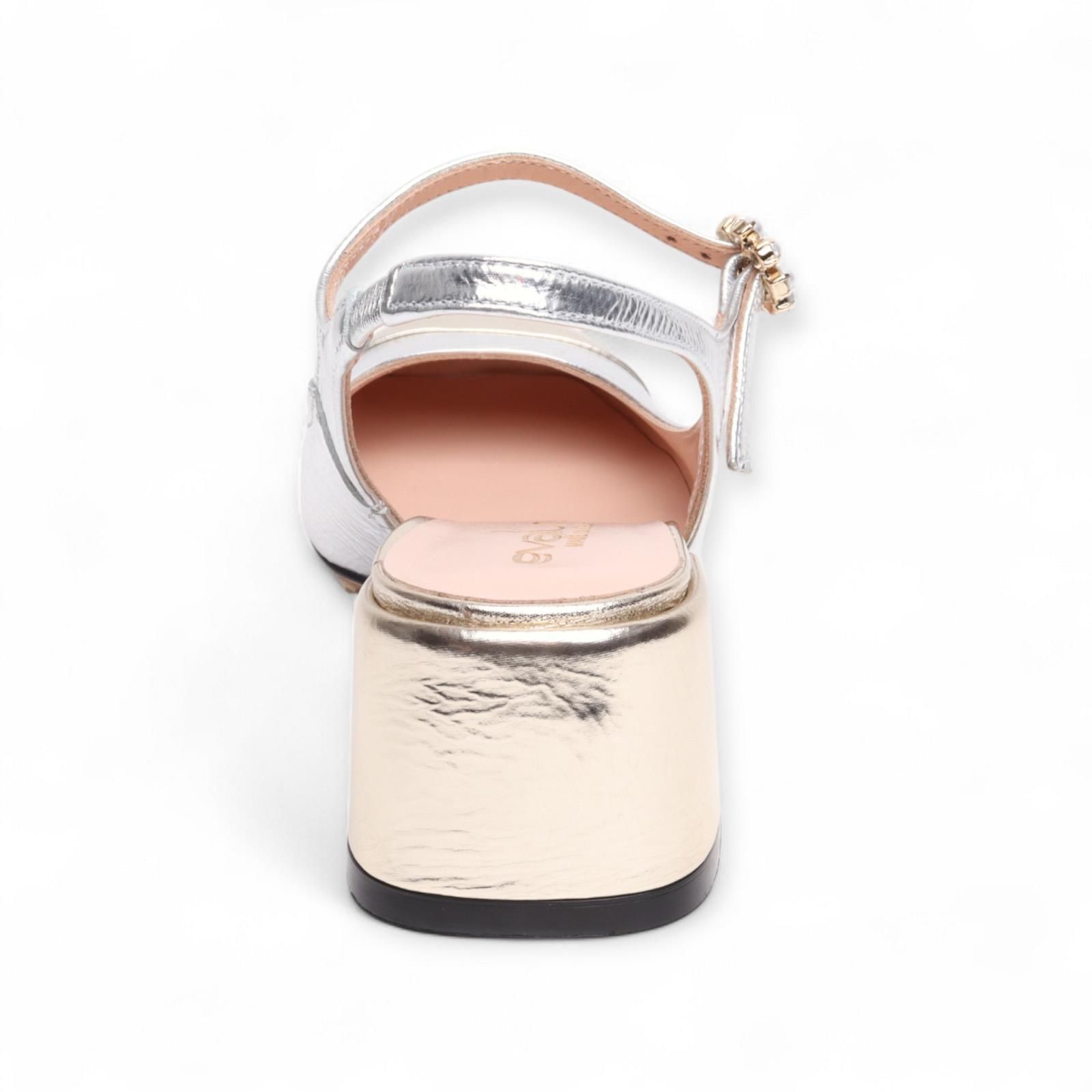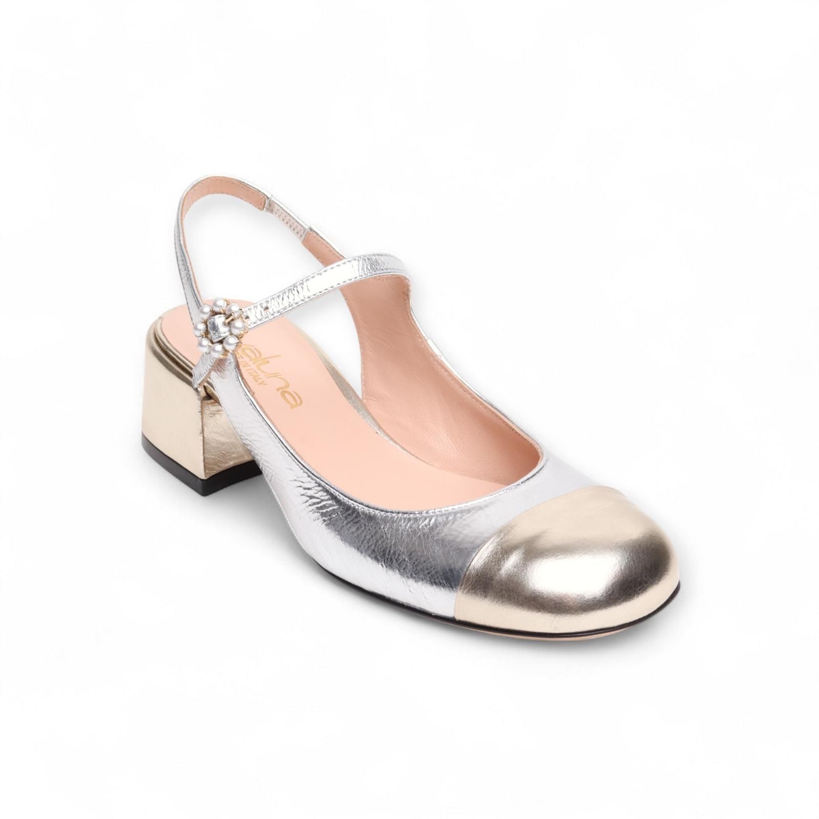 Pump van Evaluna voor dames. Deze pump is met een gouden neus en hak, afgewerkt met zilver en een bandje over de enkel. Is met een leren buitenzool en op een blokhakje van 3-3.5cm hoog.