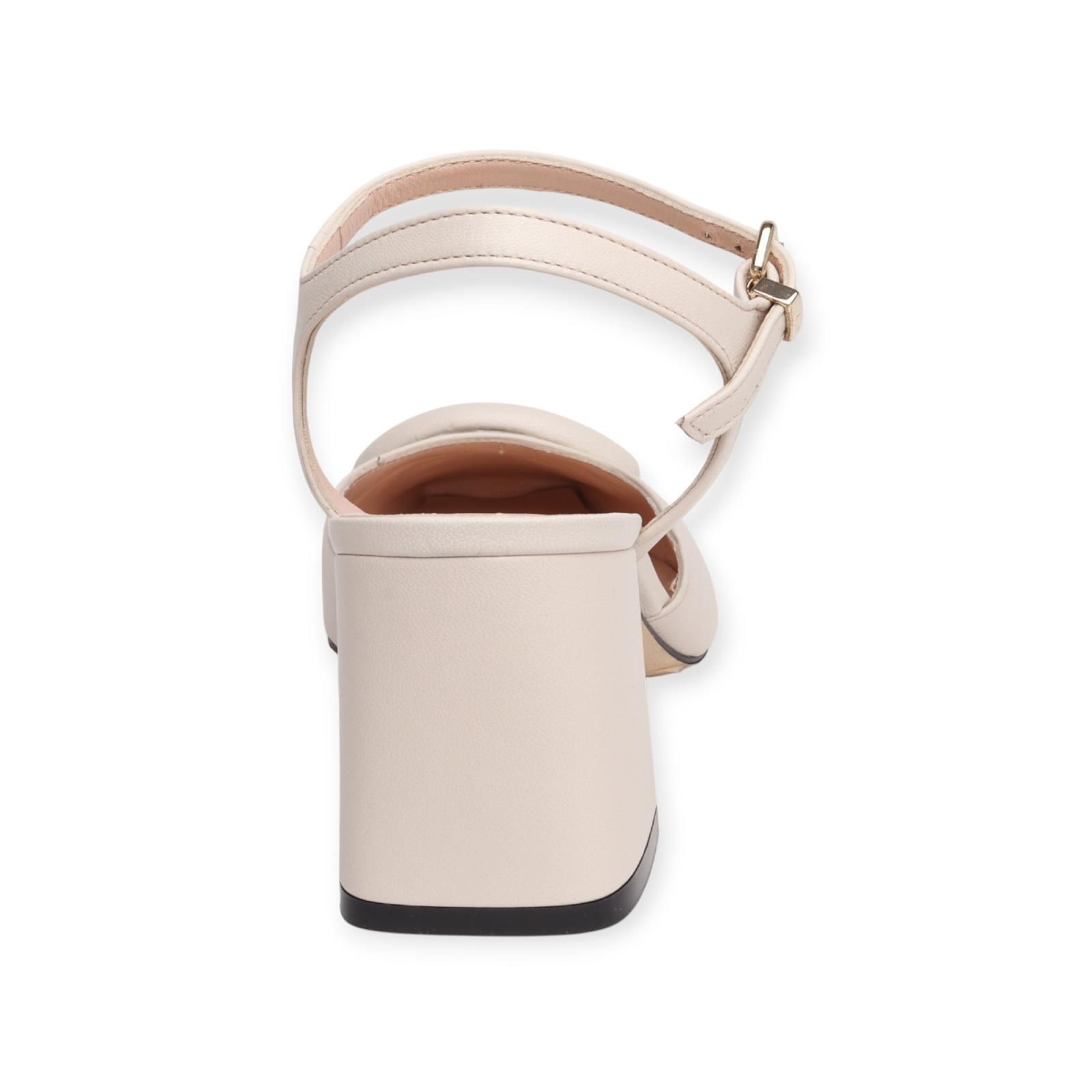 Pump van Evaluna voor dames. Dit slingback model is in beige leder. Afgewerkt met een boekel op de voorvoet. Heeft een open hieltje die mooi vastblijft aan de hiel met een bandje en een extra bandje over de wreef. Is met een carré top en op een blokhakje van 5-5.5cm hoog.