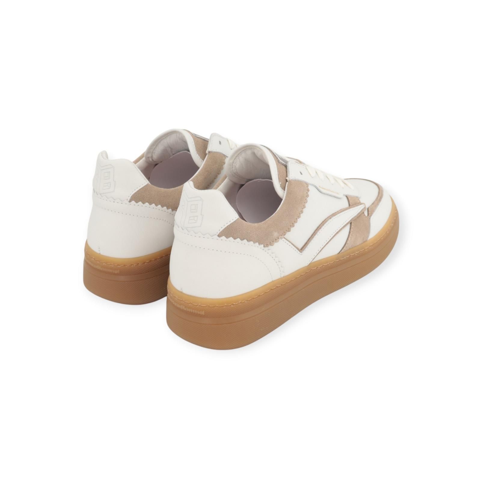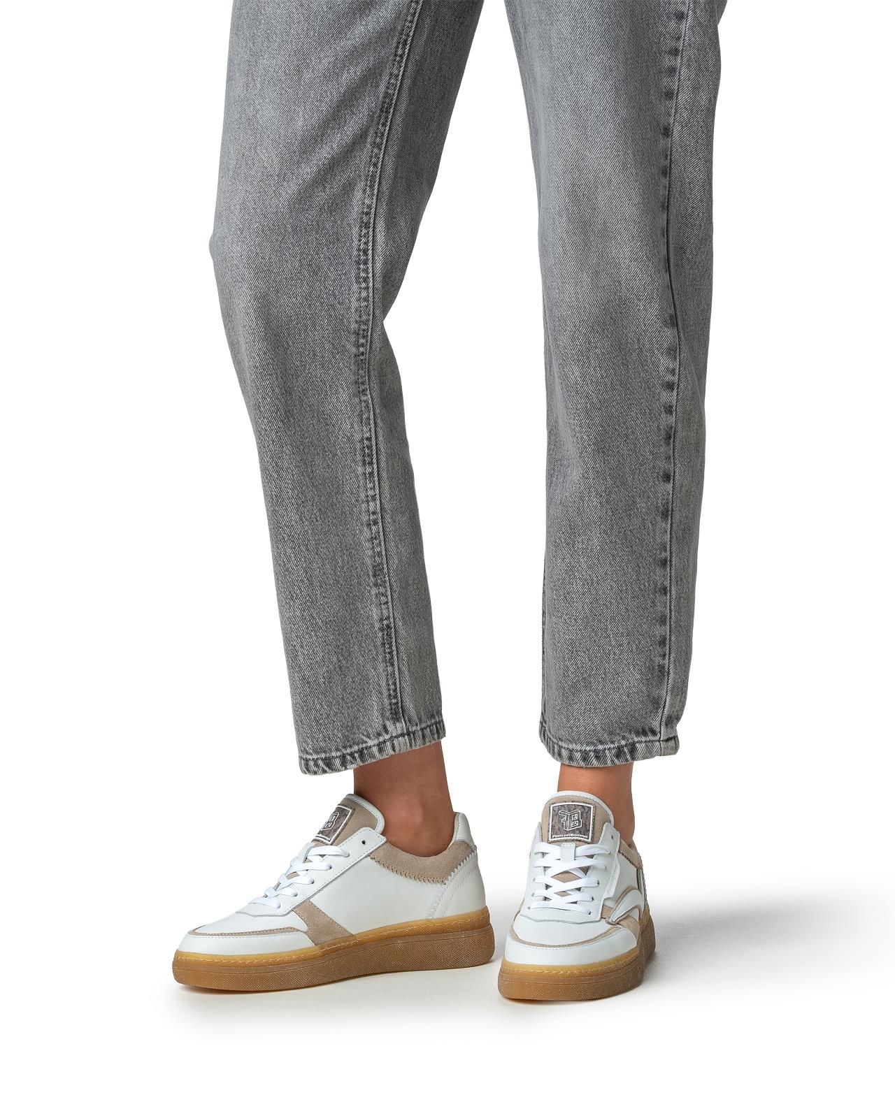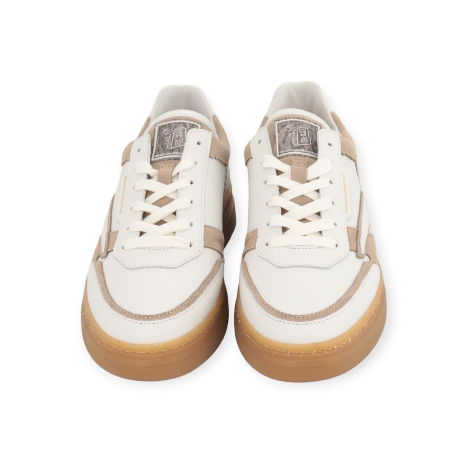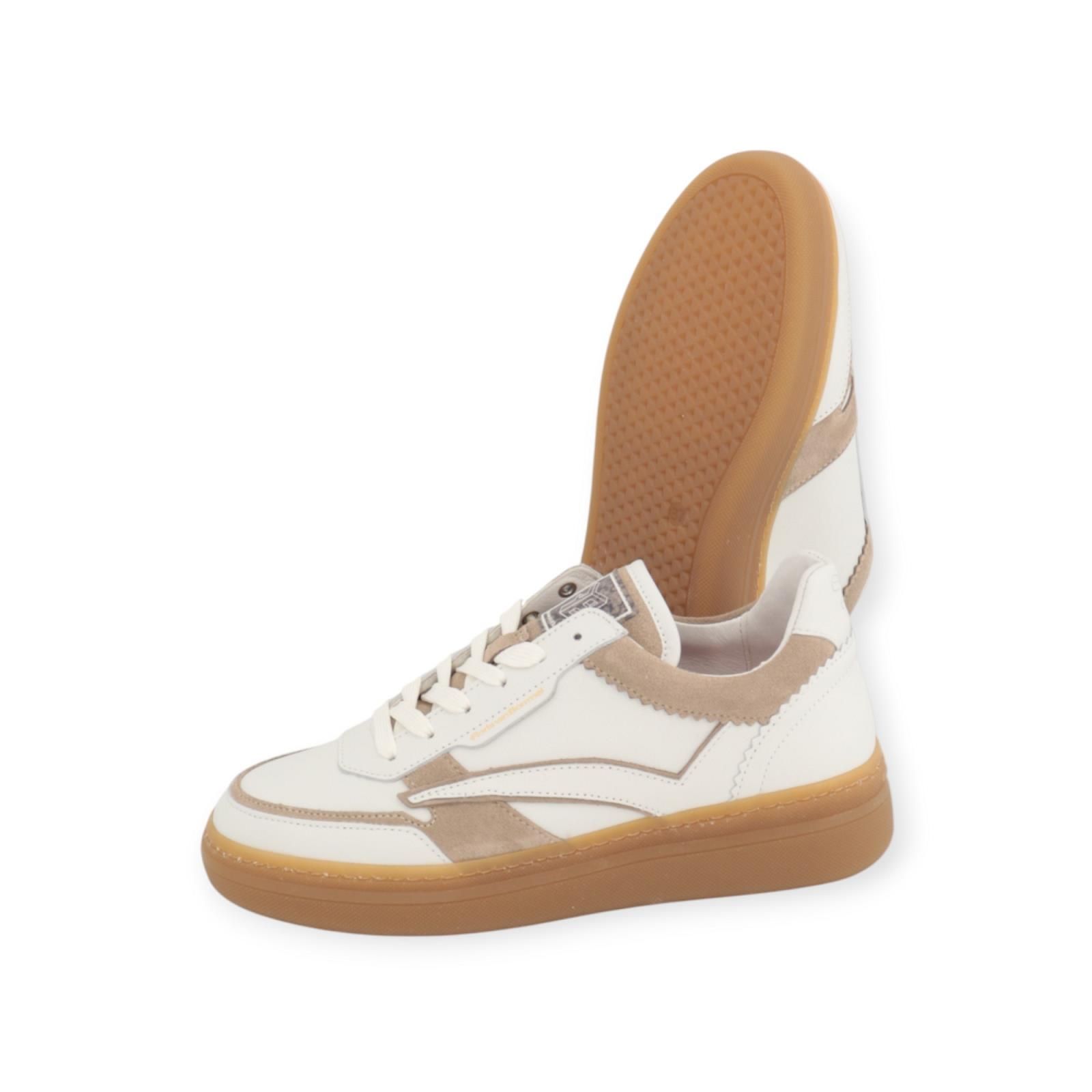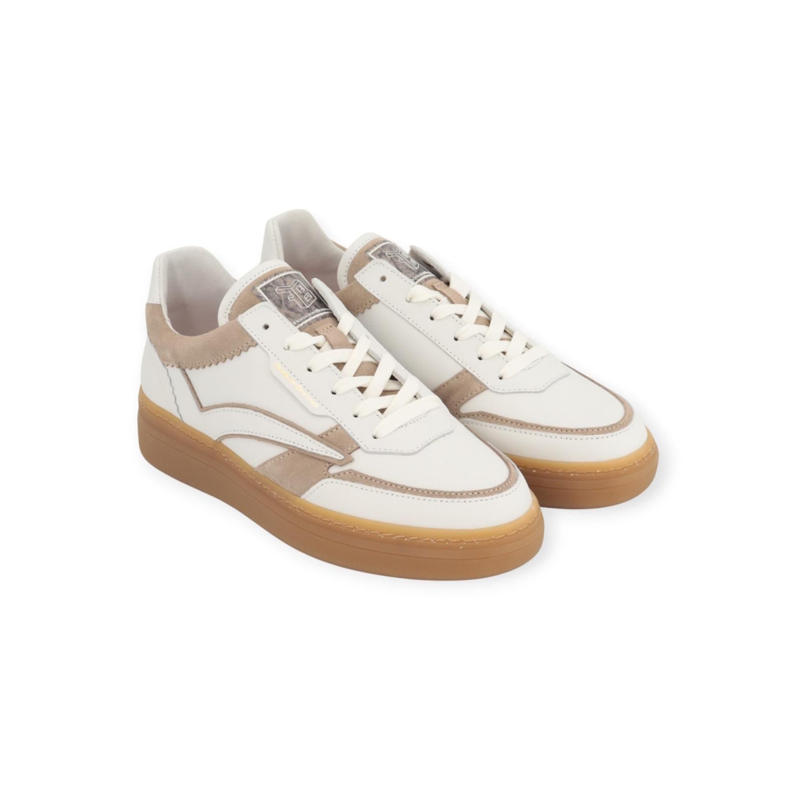 Sneaker Fygi 01.01 van Floris van Bommel voor dames. Deze toffe sneaker is de nieuwste stijl van Floris. Is in wit leer met beige suède stukken. Is rond de enkel en hiel mooi afgewerkt met gekarteld leer. De Fygi heeft een hoge flap met logo FVB , is op een dikke gummyzool met een uitneembare binnenzool.