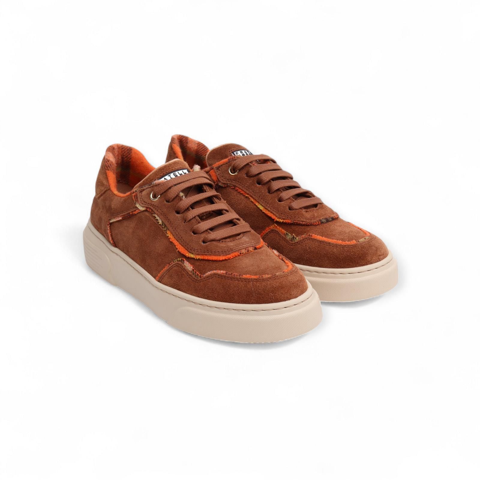 Sneaker van Fratelli Rossetti voor dames. Deze sneaker is in cognac suède afgewerkt met stiksels. Is voorzien van een dikke zwarte zool en heeft een uitneembare binnenzool. Deze sneaker is uit de Rossetti One collectie.