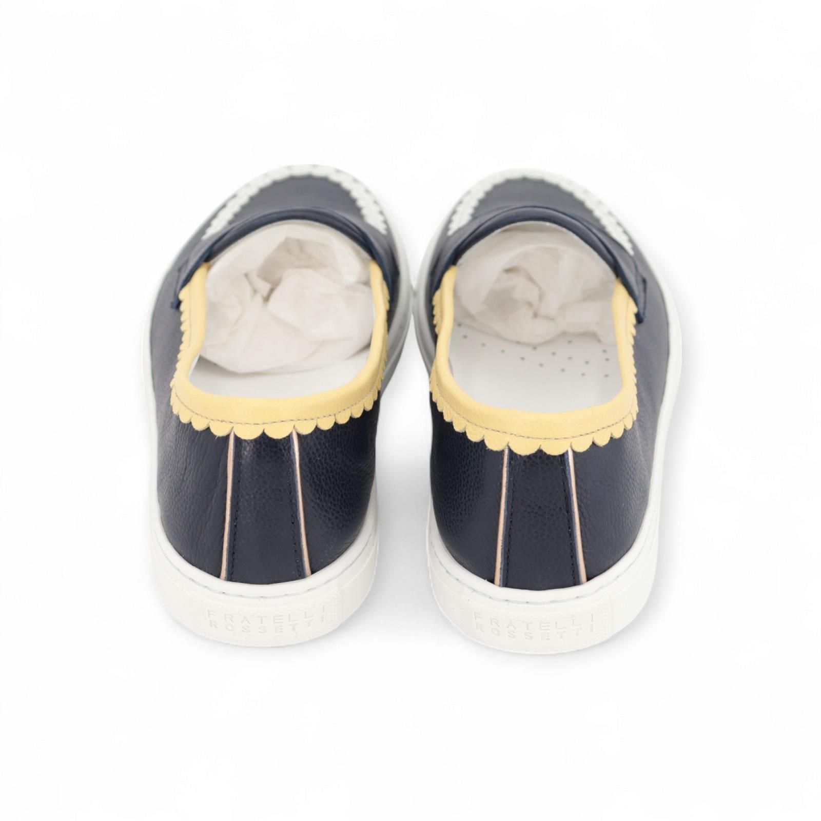 Blauwe mocassin van Fratelli Rossetti voor dames uit de Rossetti One collectie. Deze mocassin is gemaakt van leder met een geel en wit golvende stiksels aan de rand en voorvoet. Aan de wreef is er nog een extra band voorzien om het model nog eleganter te maken. Voelt zeer comfortabel aan door de rubberen ‘sneaker’ zool. De binnenzool is uitneembaar.