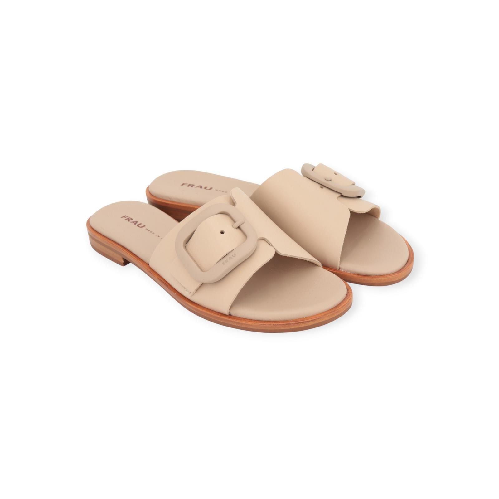 Slipper 85M4 van Frau voor dames. Dit elegant muiltje is in beige leer. Heeft 1 band over de wreef met een opvallende gespsluiting. Is op een antislip buitenzool.