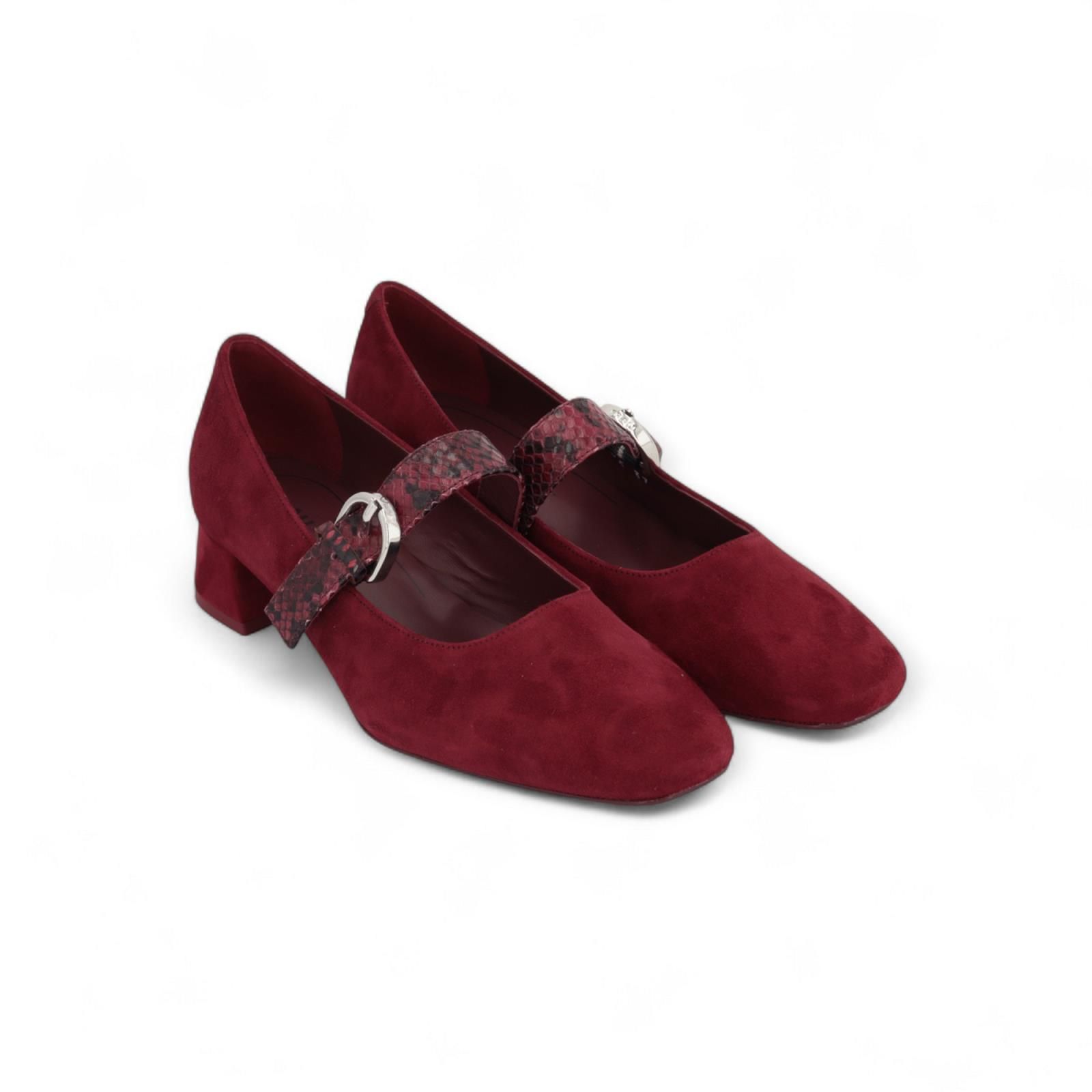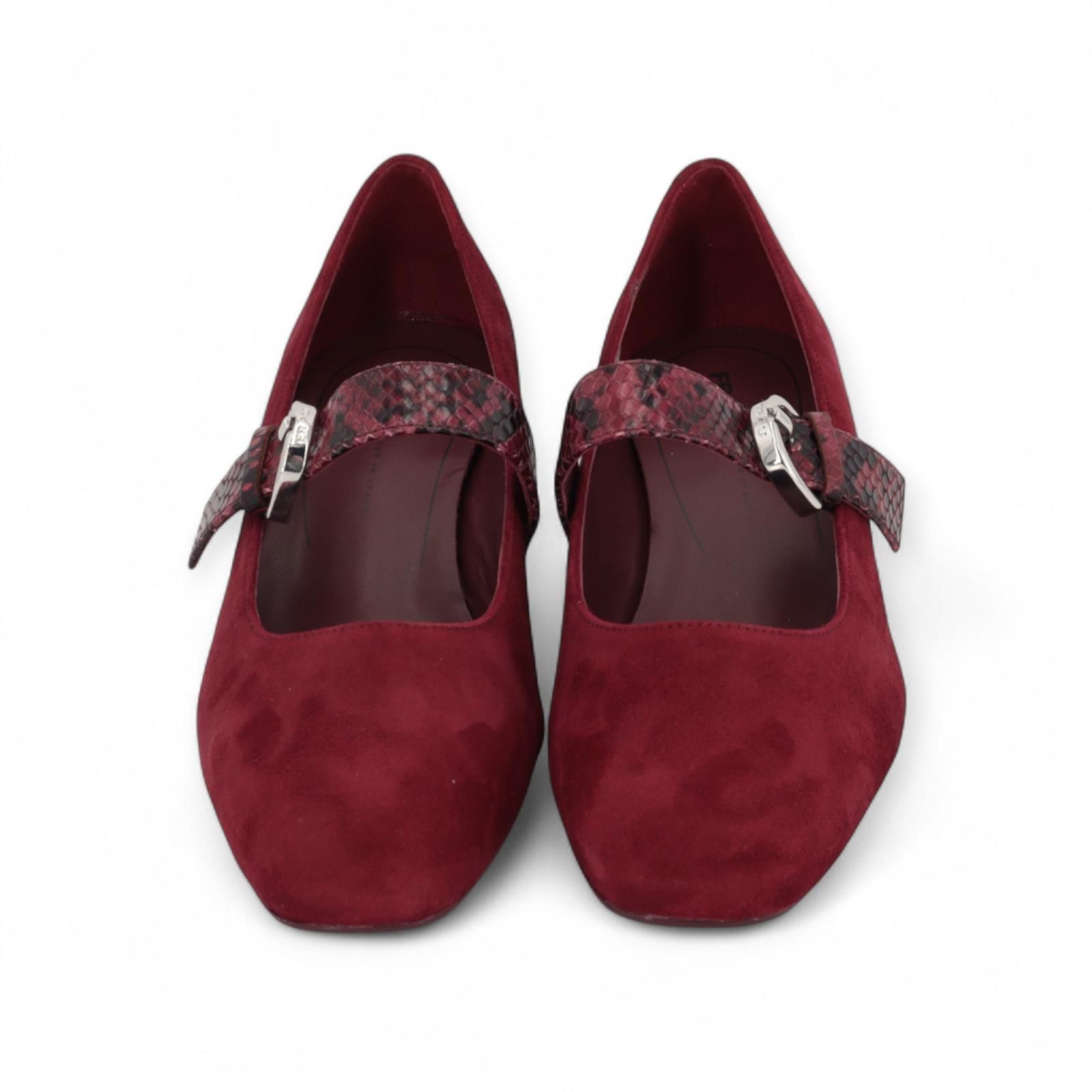Pump 92Y5 van Frau voor dames. Deze pump is in licht bordeaux suède. Heeft een carré top met een bandje in crocco print over de wreef. Is op een klein blokhakje van 3,5-4cm hoog.